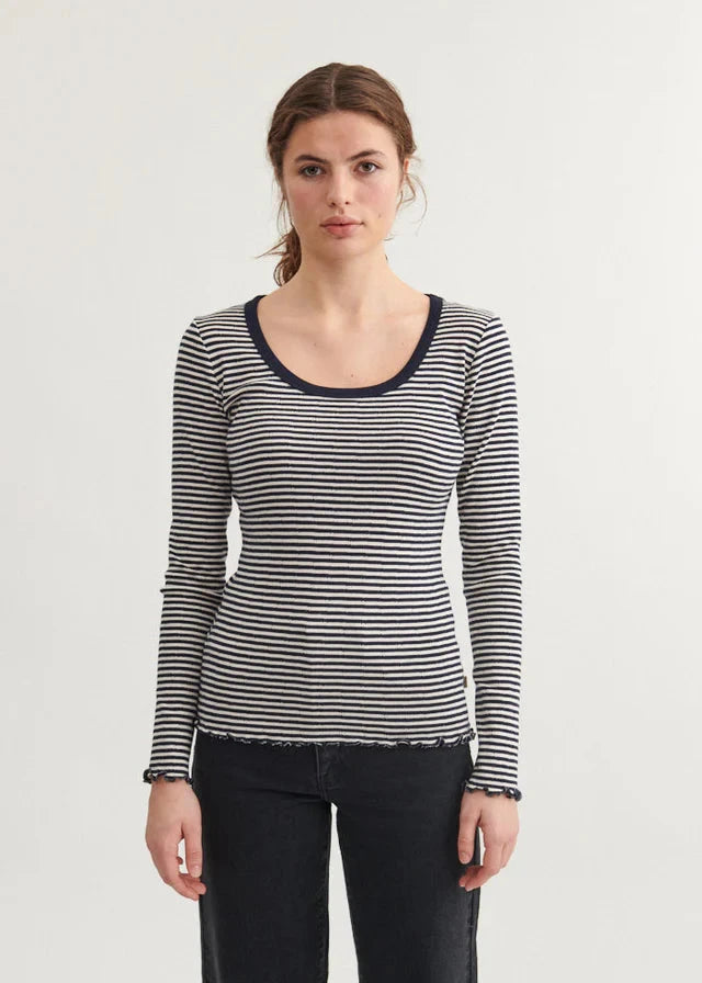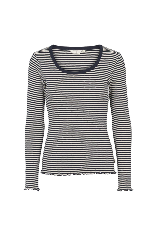 Fin stribet langærmet t-shirt fra Basic Apparel. T-shirten har bådudskæring og små flæser i bunden og på ærmerne.