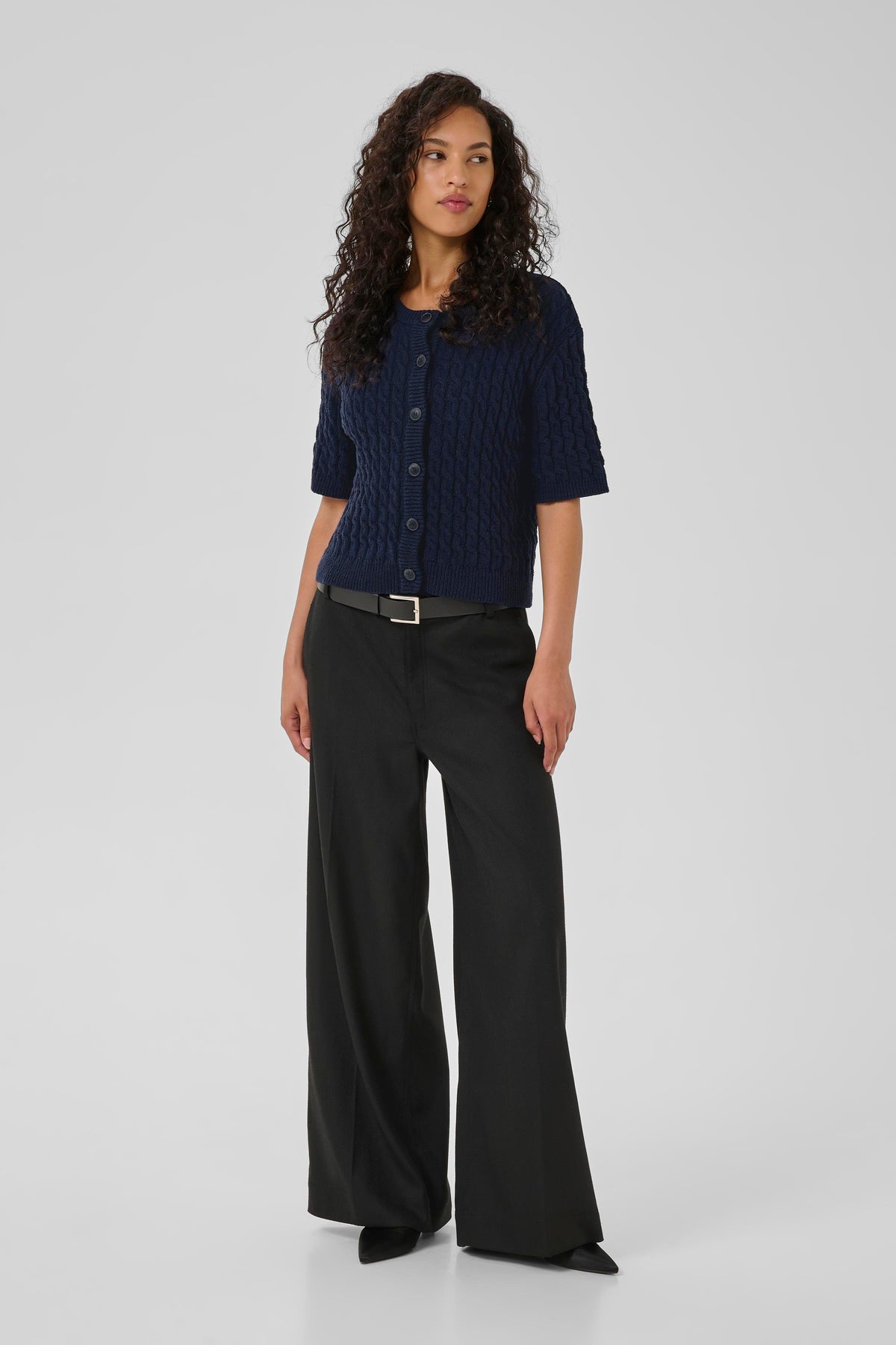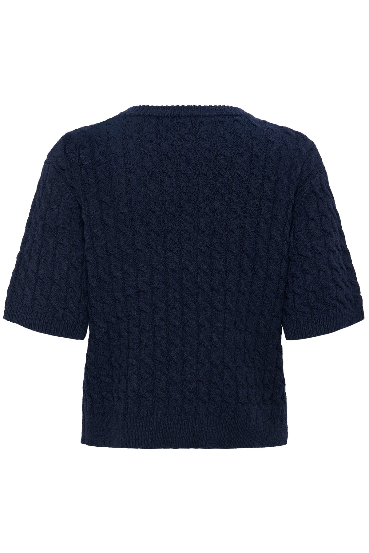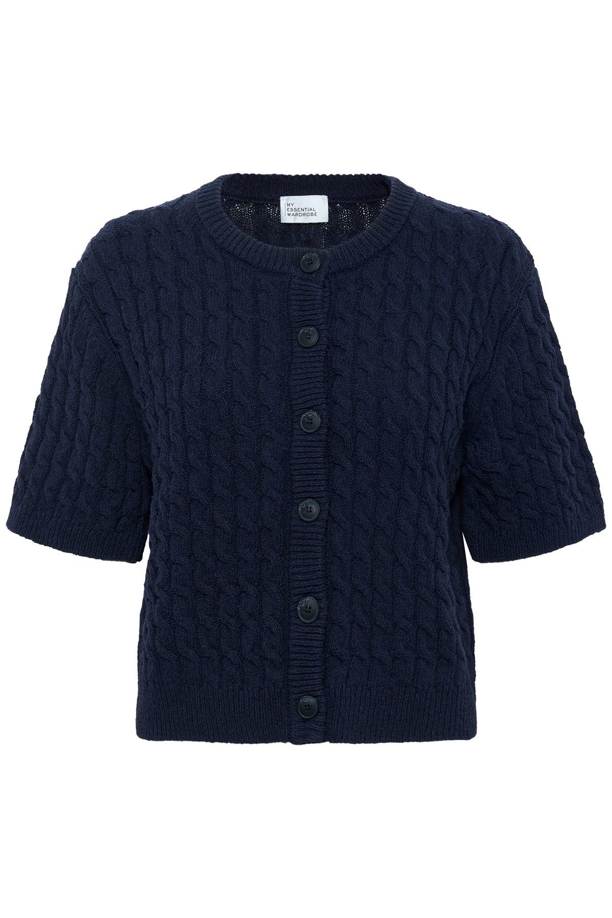 Fin kortærmet navy cardigan fra My Essential Wardobe. Cardiganen har rund hals, korte ærmer og knapper foran.