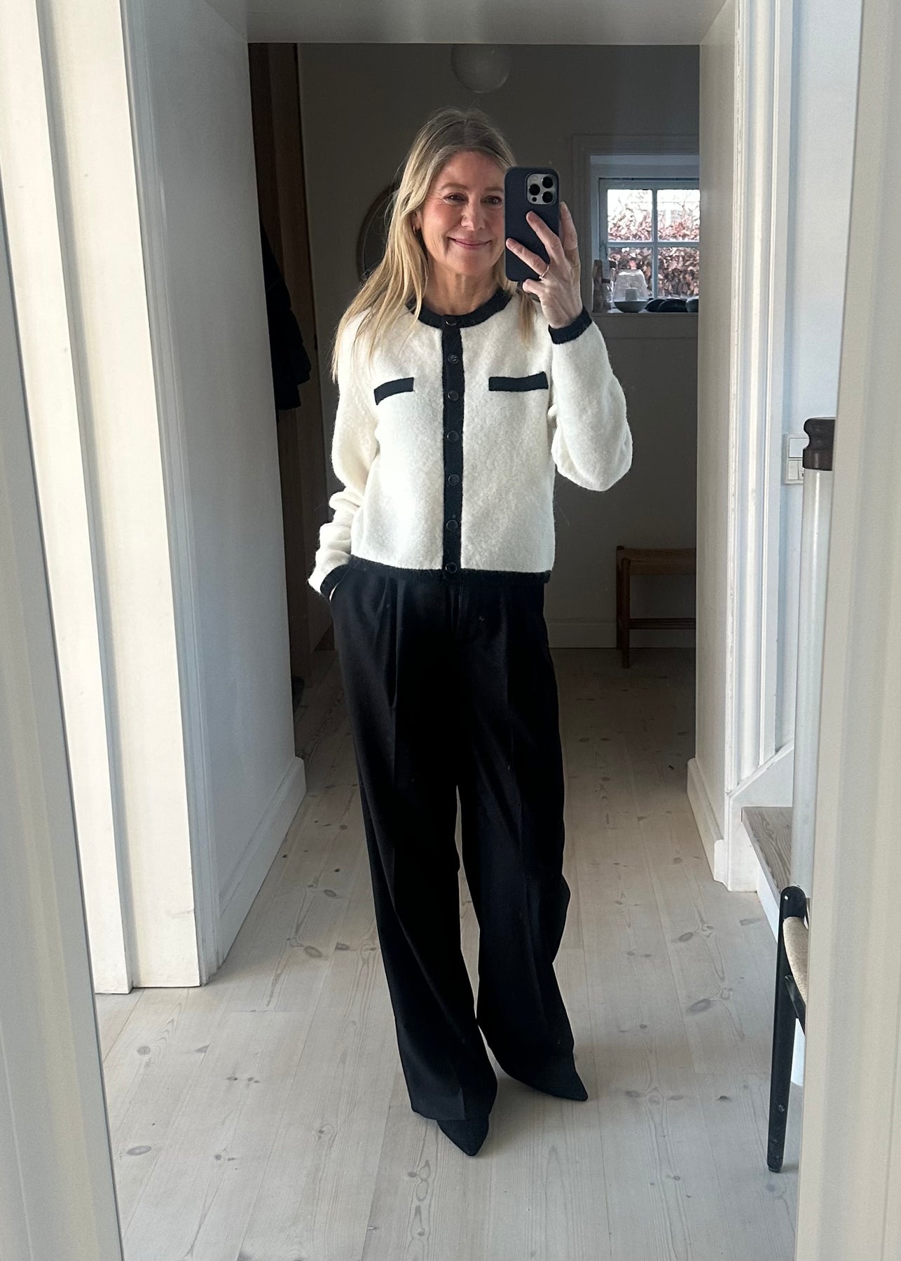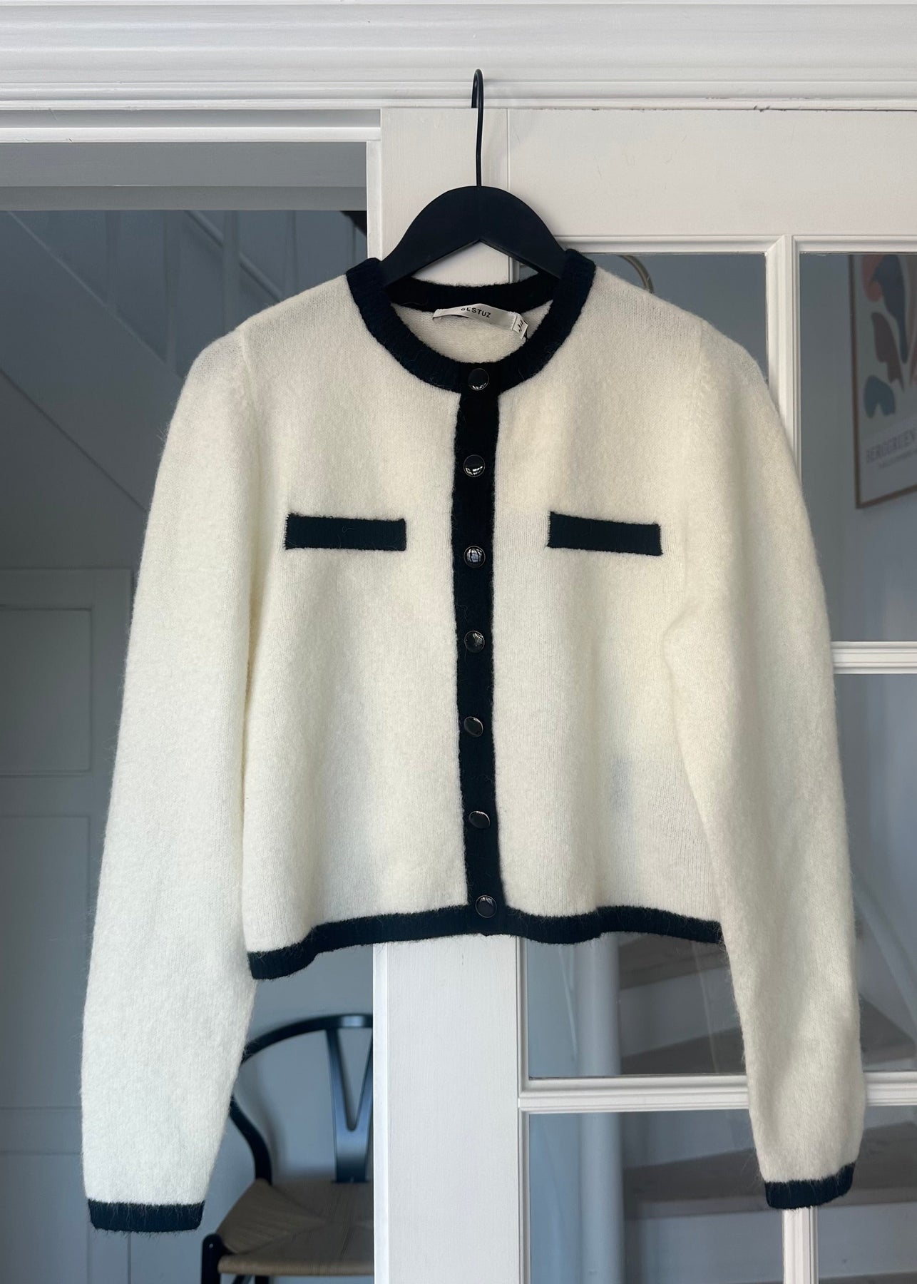Flot cardigan fra Gestuz med kontrastkanter. Cardiganen har en lige pasform med lange ærmer og rund hals. Den lukkes med fine sort/guld knapper foran.