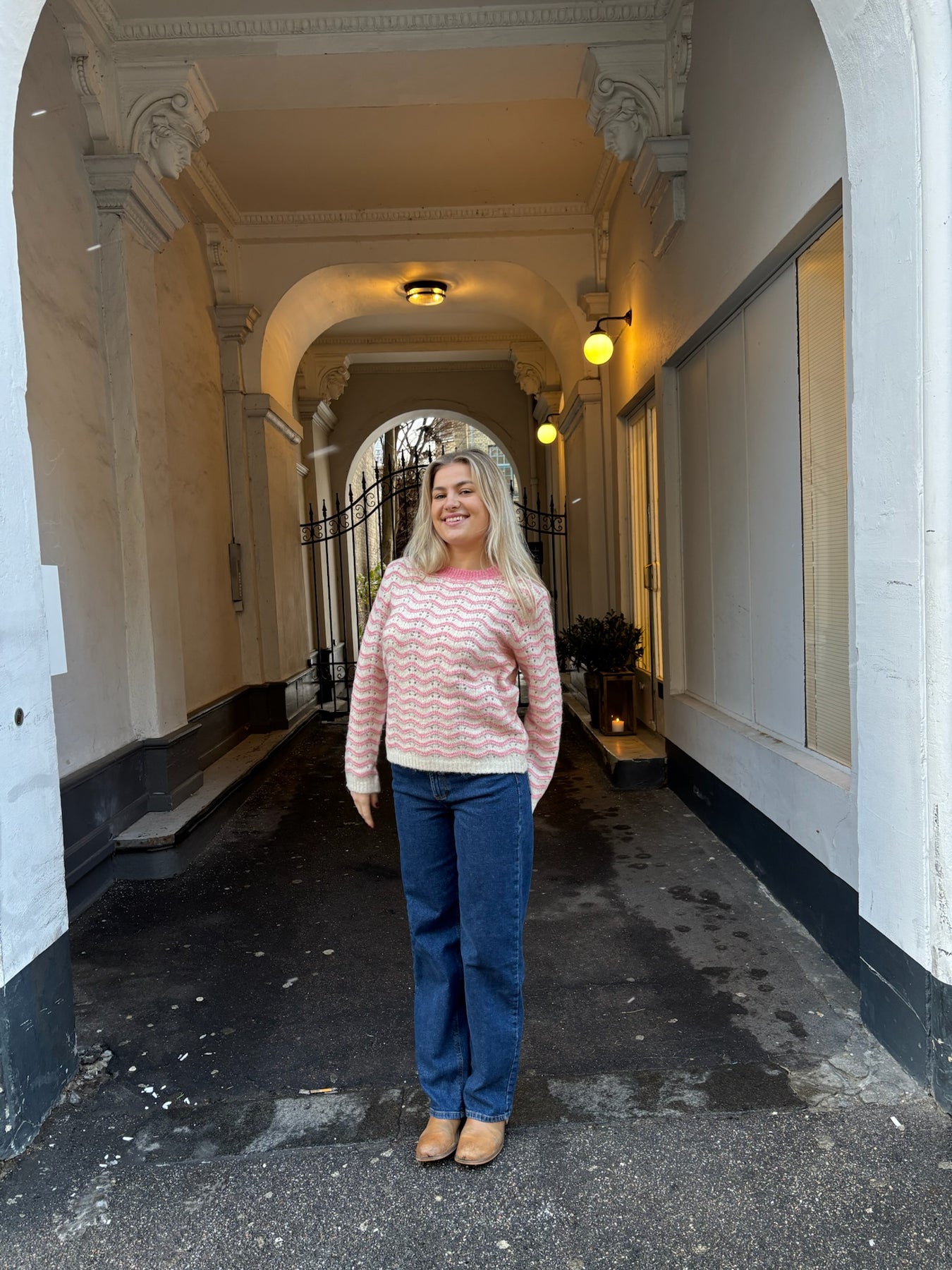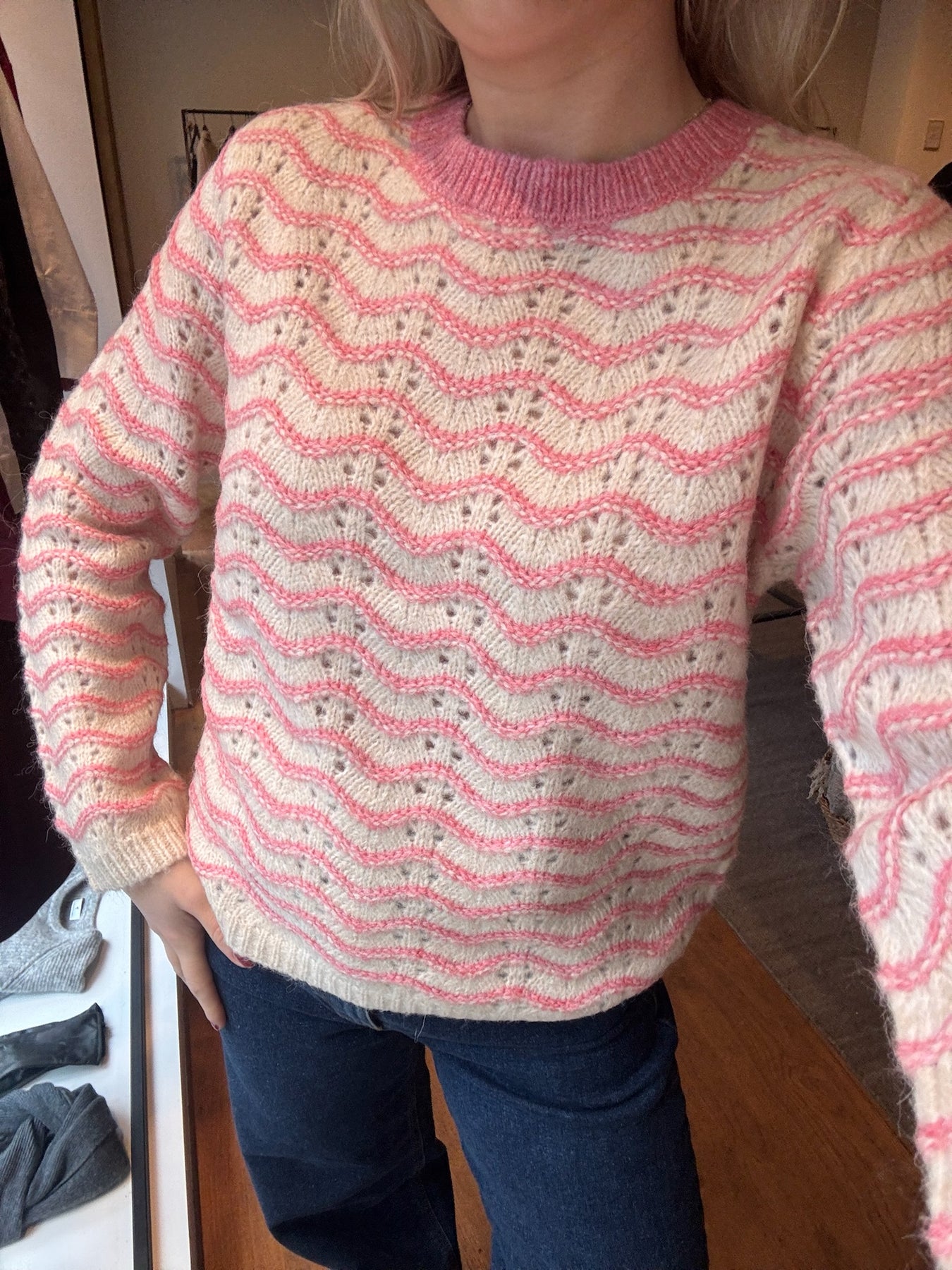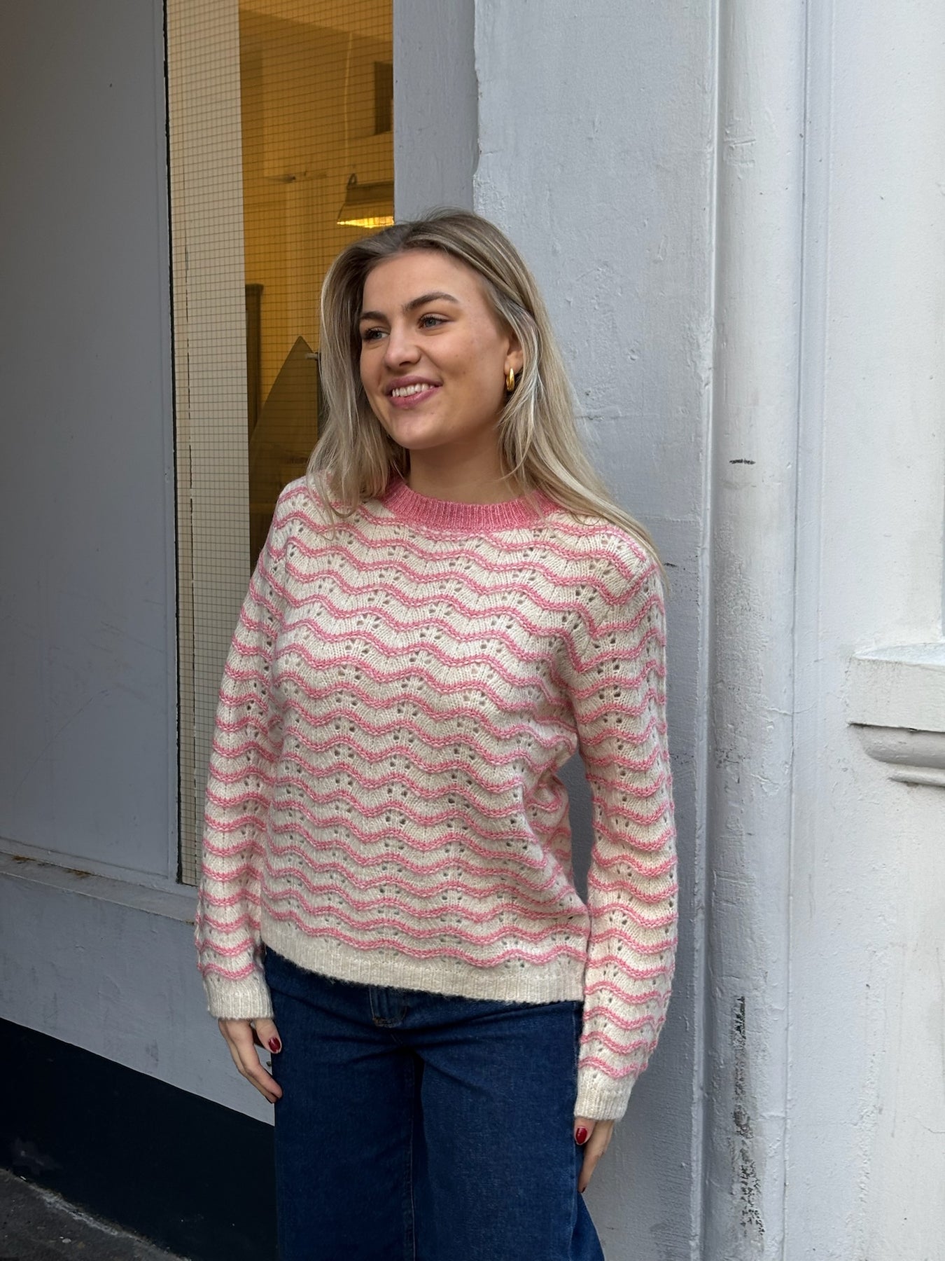 Smuk hulmønsteret pullover i rosa og off-white. Pulloveren har rund hals, lange ærmer og en lige pasform.
