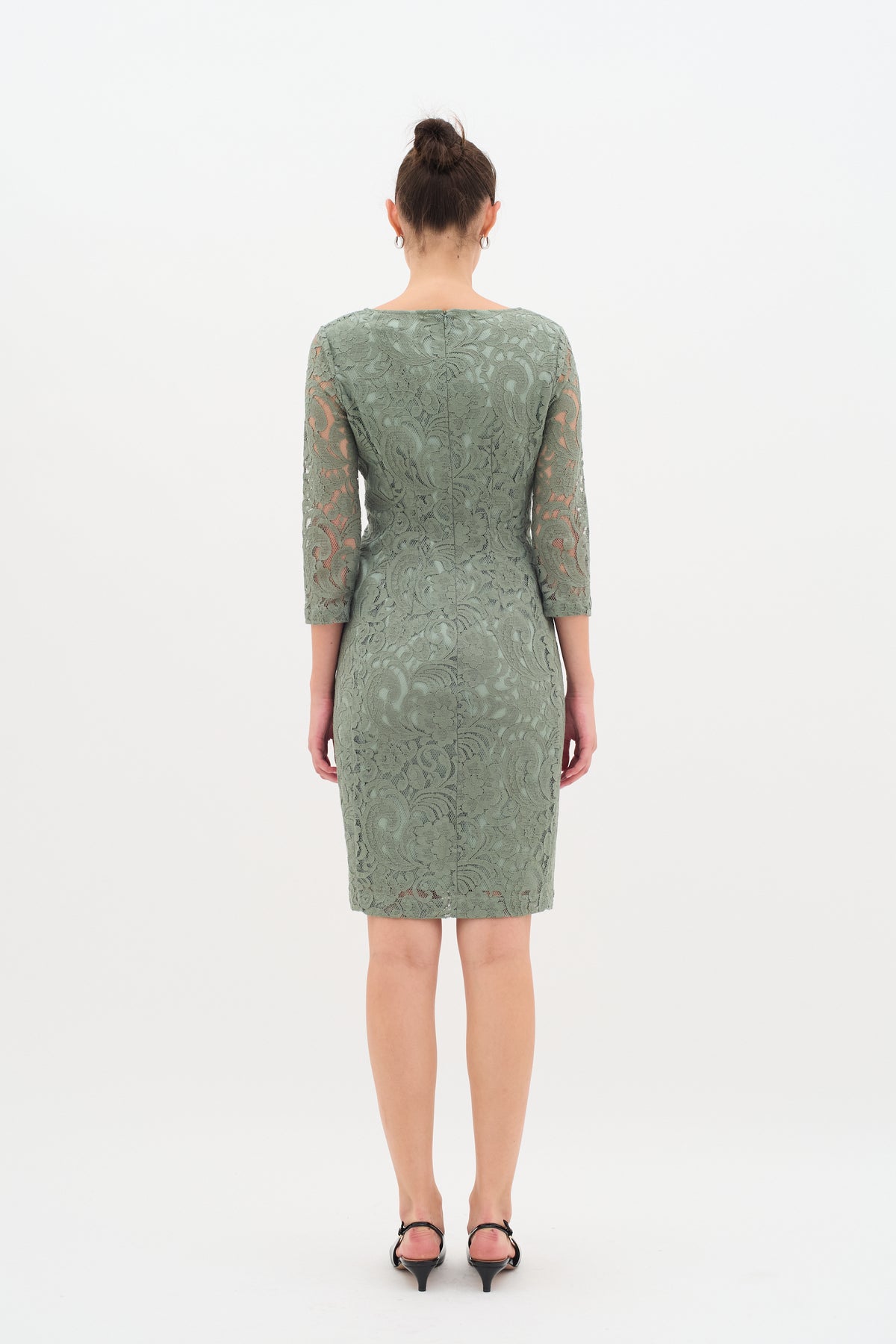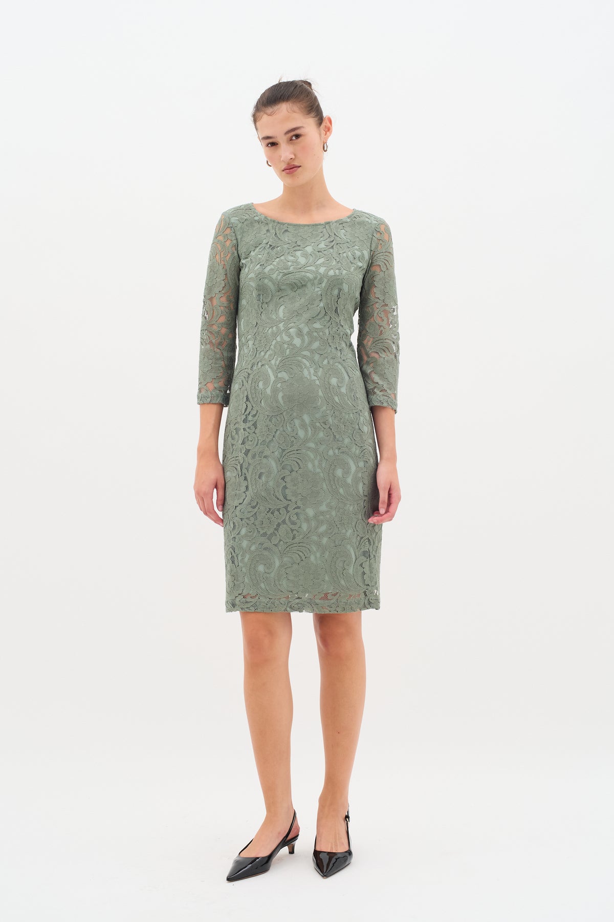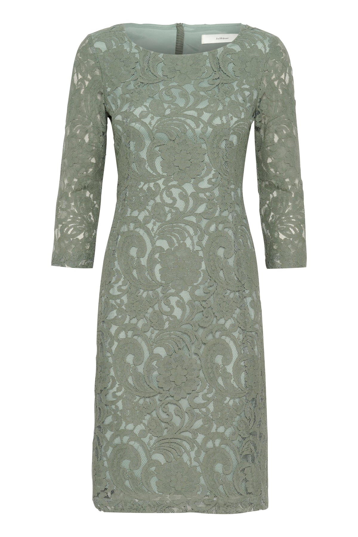 Smuk grøn kjole fra Inwear med elegante blonder, fast grøn underkjole og 3/4 ærmer.