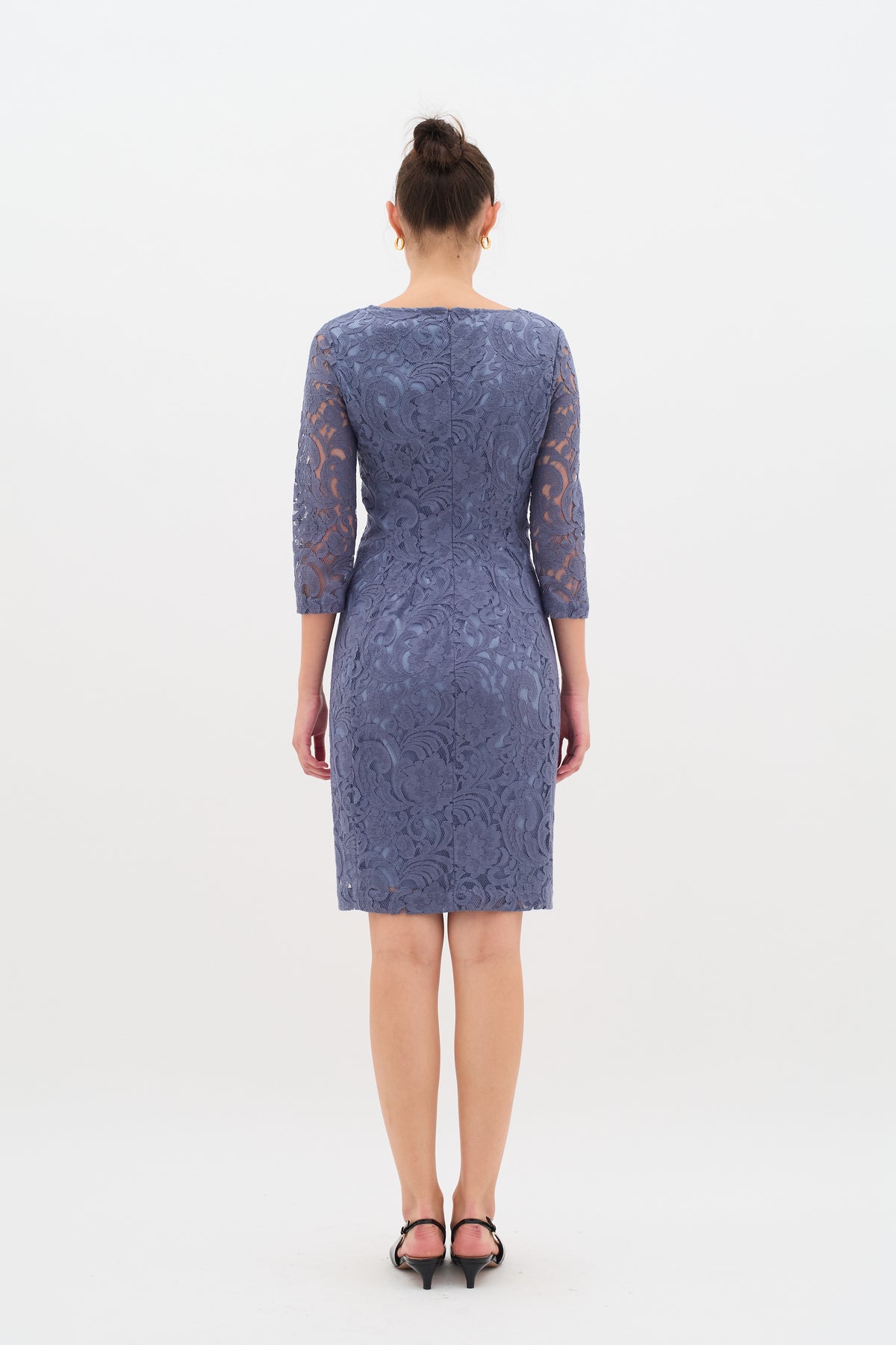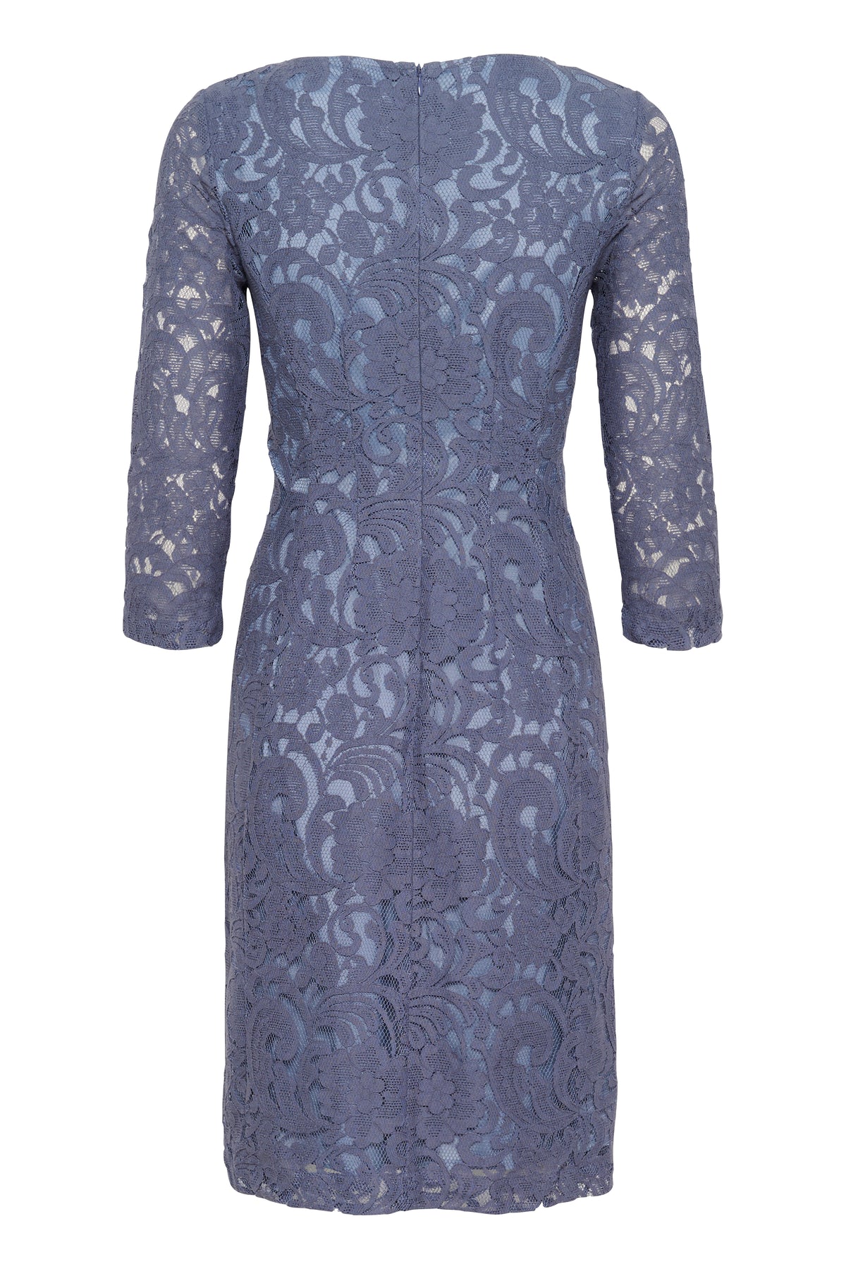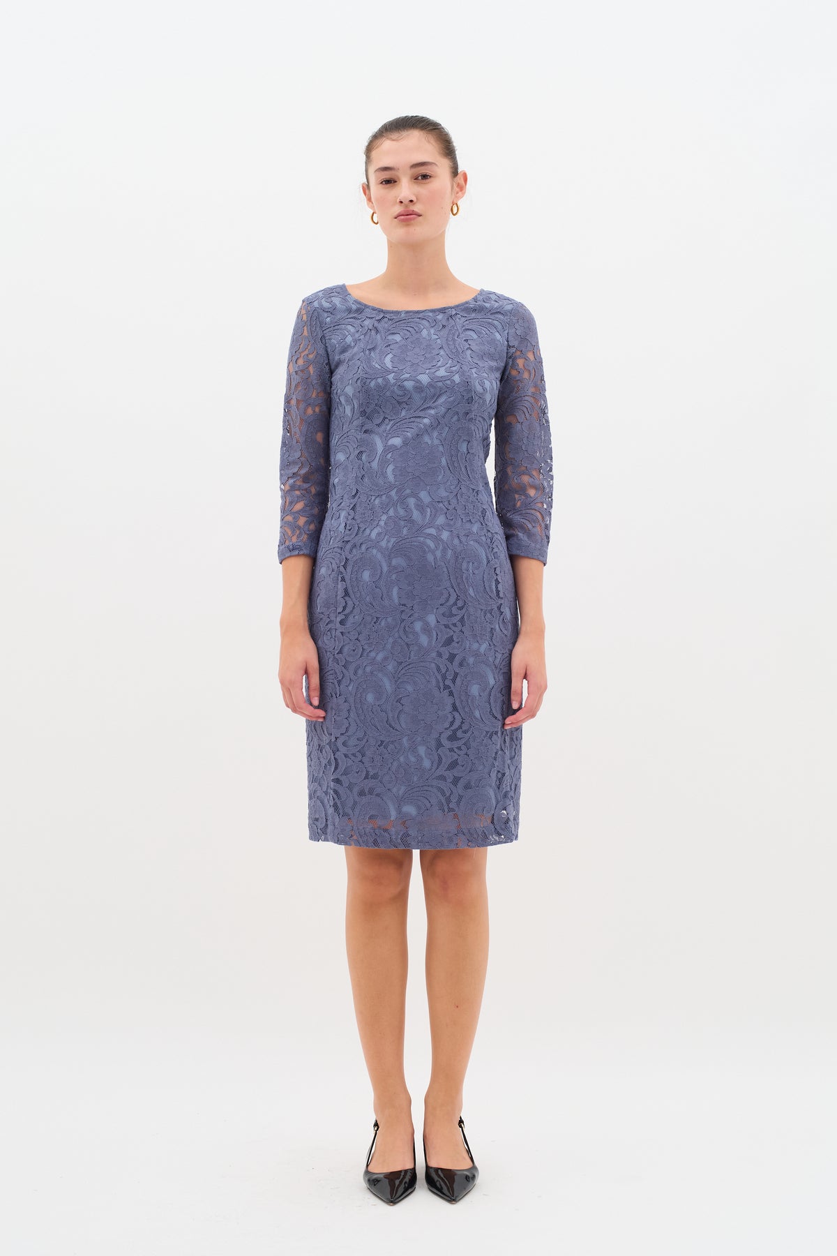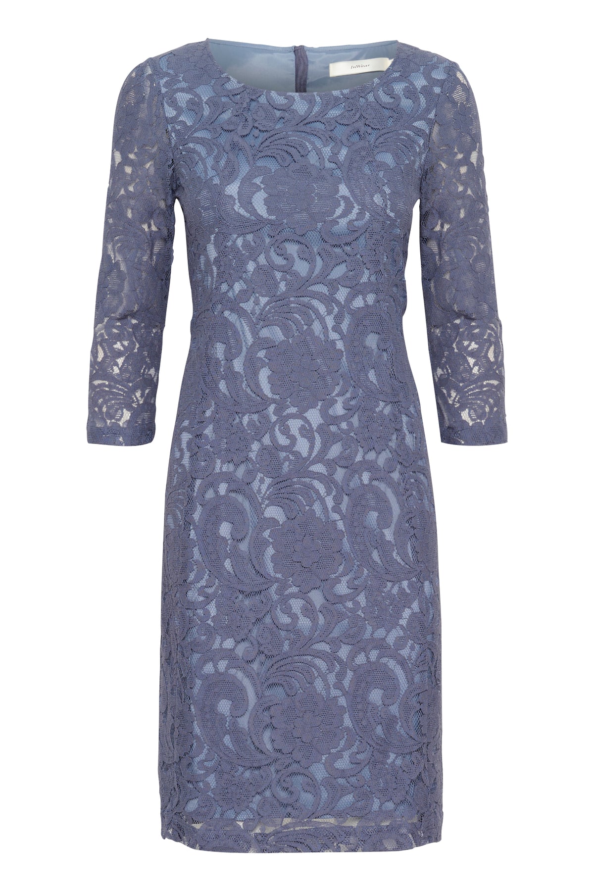 Smuk blå kjole fra Inwear med elegante blonder, fast blå underkjole og 3/4 ærmer.