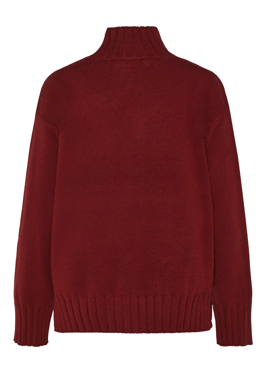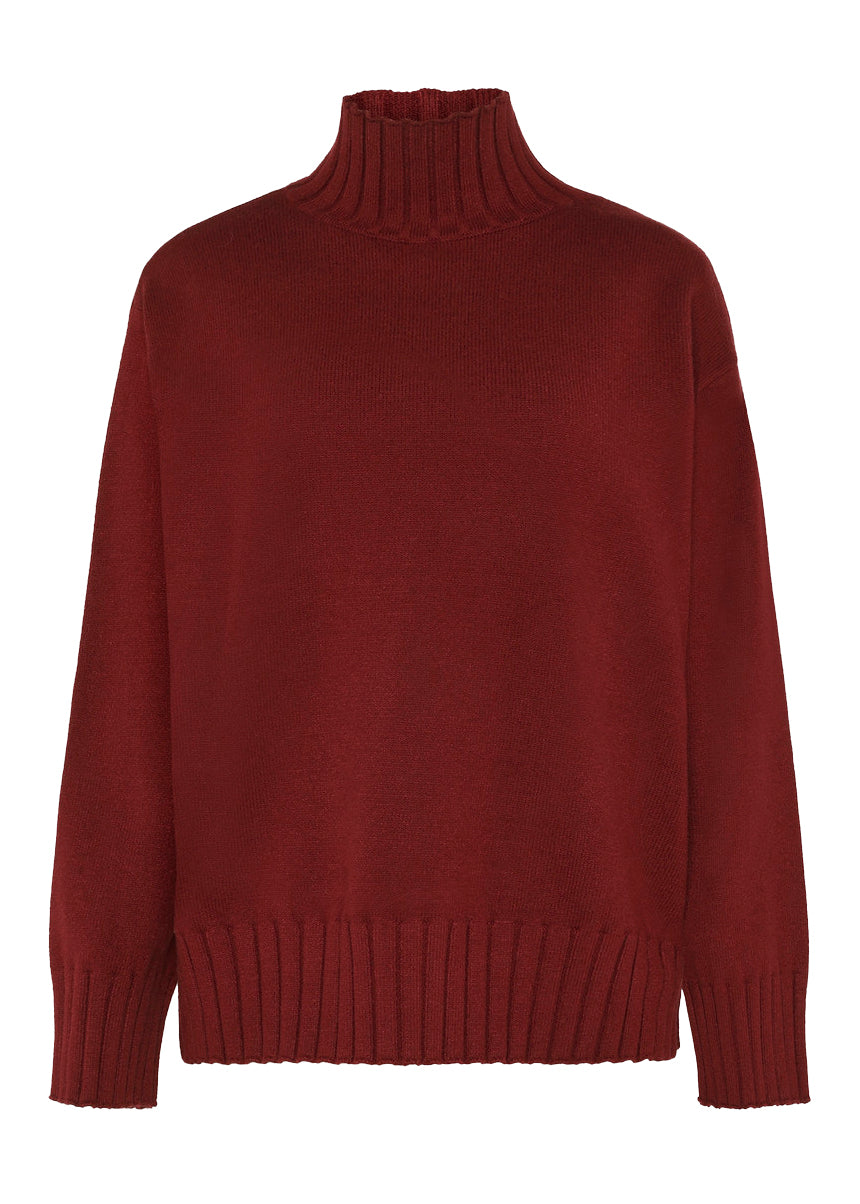 Lækker bordeaux pullover fra Minimum. Pulloveren har turtleneck, en løs oversize pasform og ribkanter.