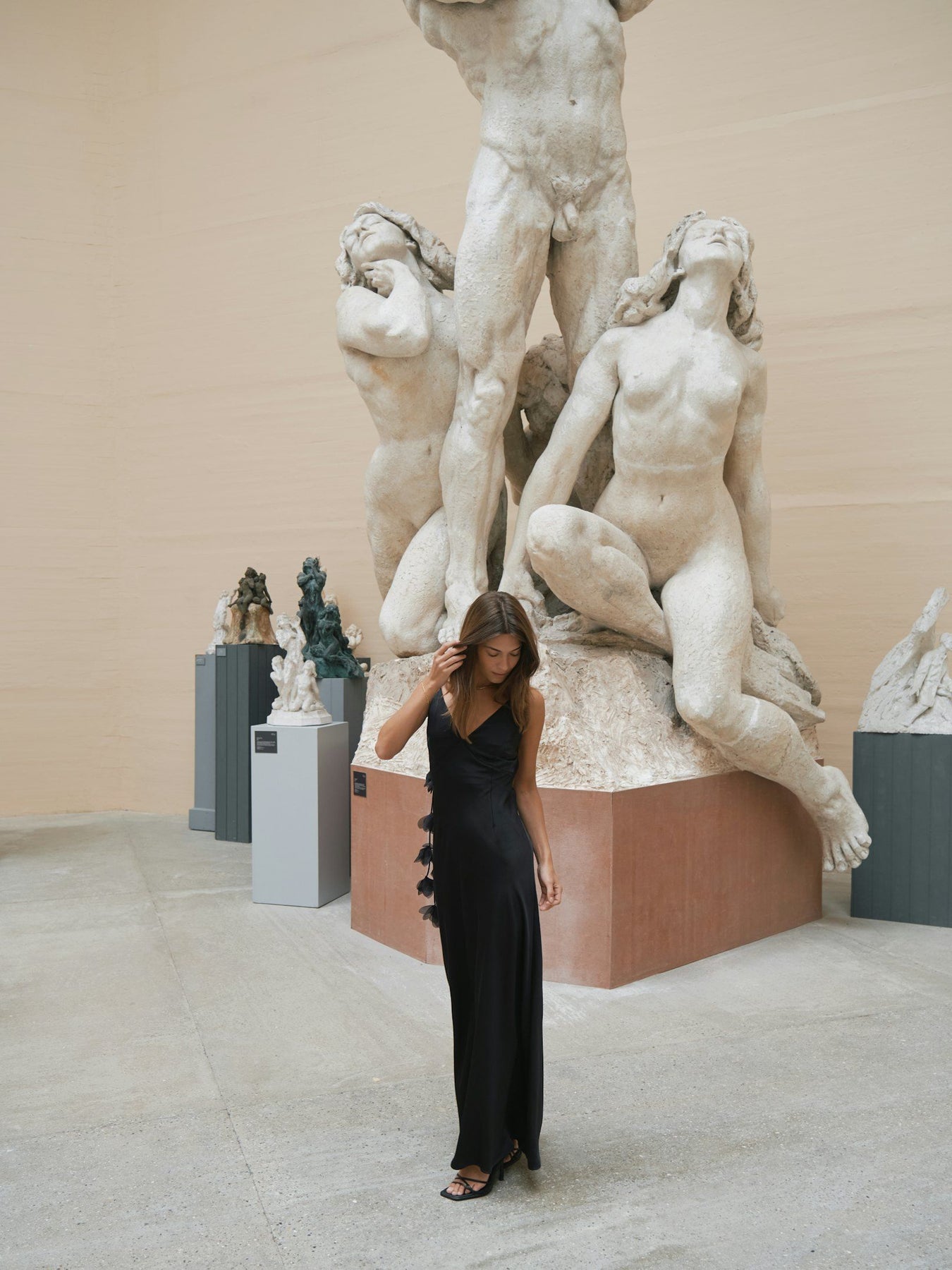 Elegant sort stropkjole fra Neo Noir med bindebånd bagpå med fine sorte blomster. Pasformen er flatterende og tætsiddende. Kjolen kommer i et flot, tungt crepe satin. Modellen er 176 cm høj og bærer en størrelse.
