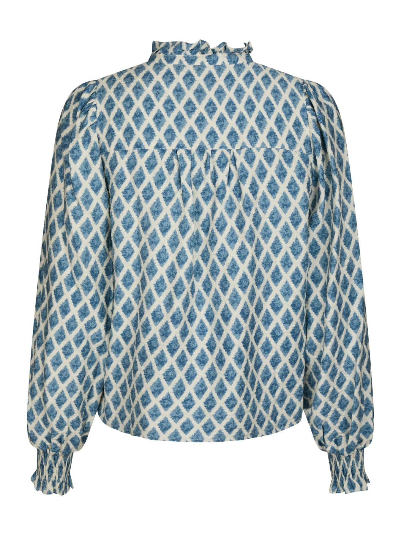 Flot feminin bluse fra Neo Noir. Blusen har v-hals og knapper foran. Den har et klassisk blåt og cremehvidt print i en blød vævet kvalitet.