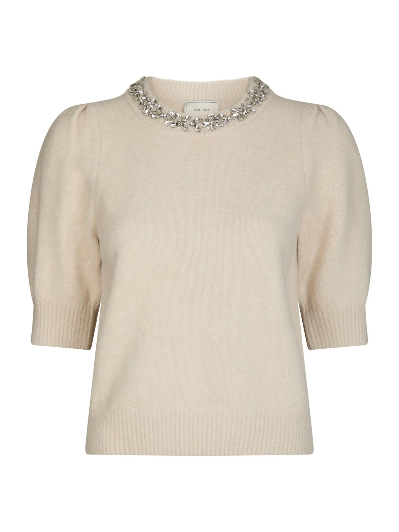 Fin cremehvid strikbluse fra Neo Noir. Blusen har rund hals, korte pufærmer og en feminin detalje ved kraven med små sten. Pasformen er normal.
