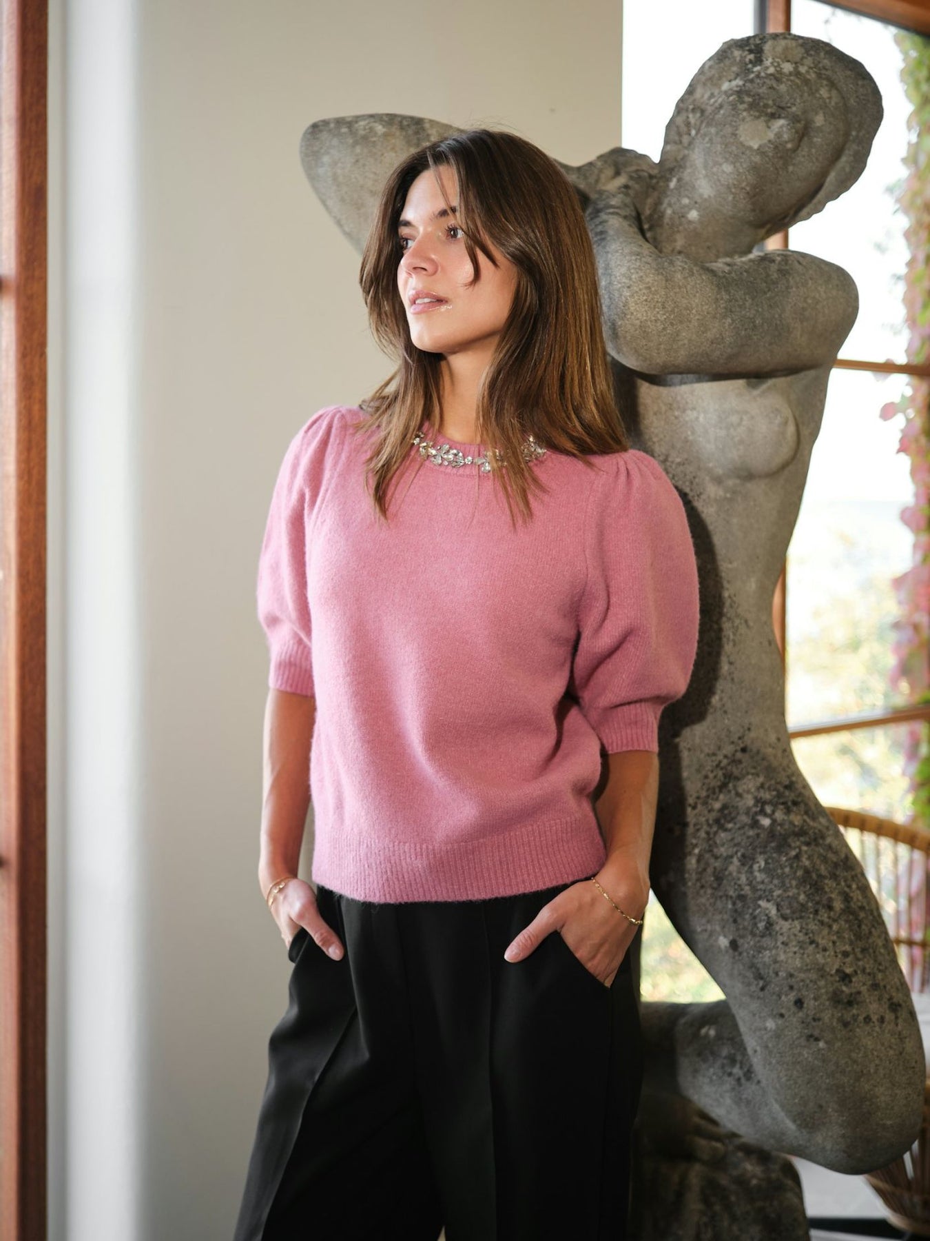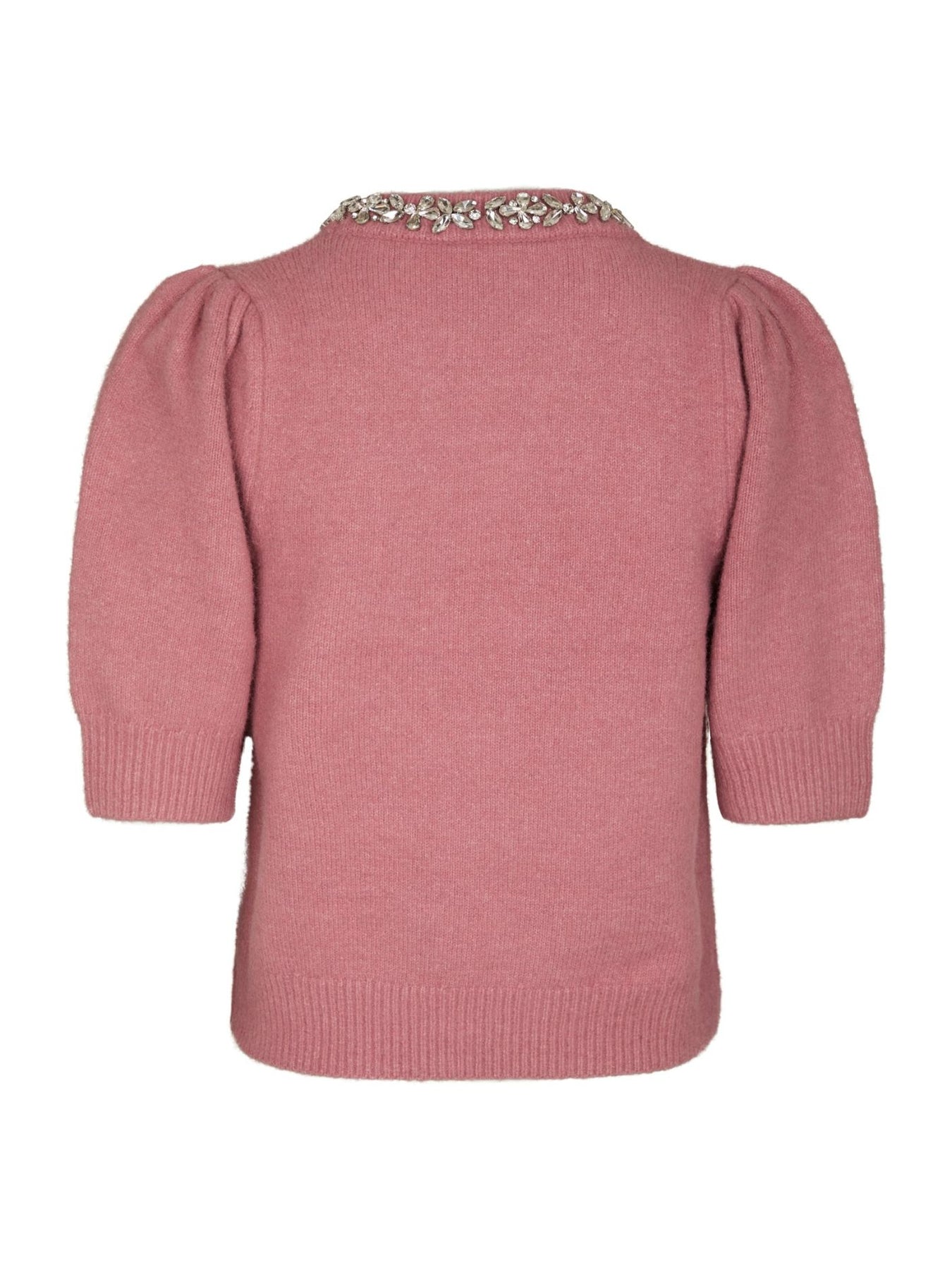 Fin rosa strikbluse fra Neo Noir. Blusen har rund hals, korte pufærmer og en feminin detalje ved kraven med små sten. Pasformen er normal.