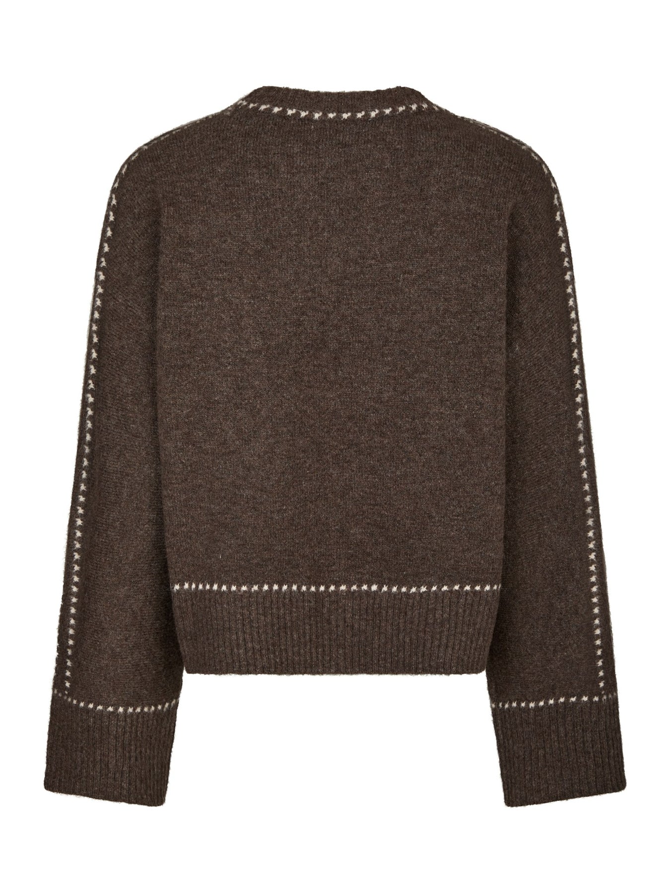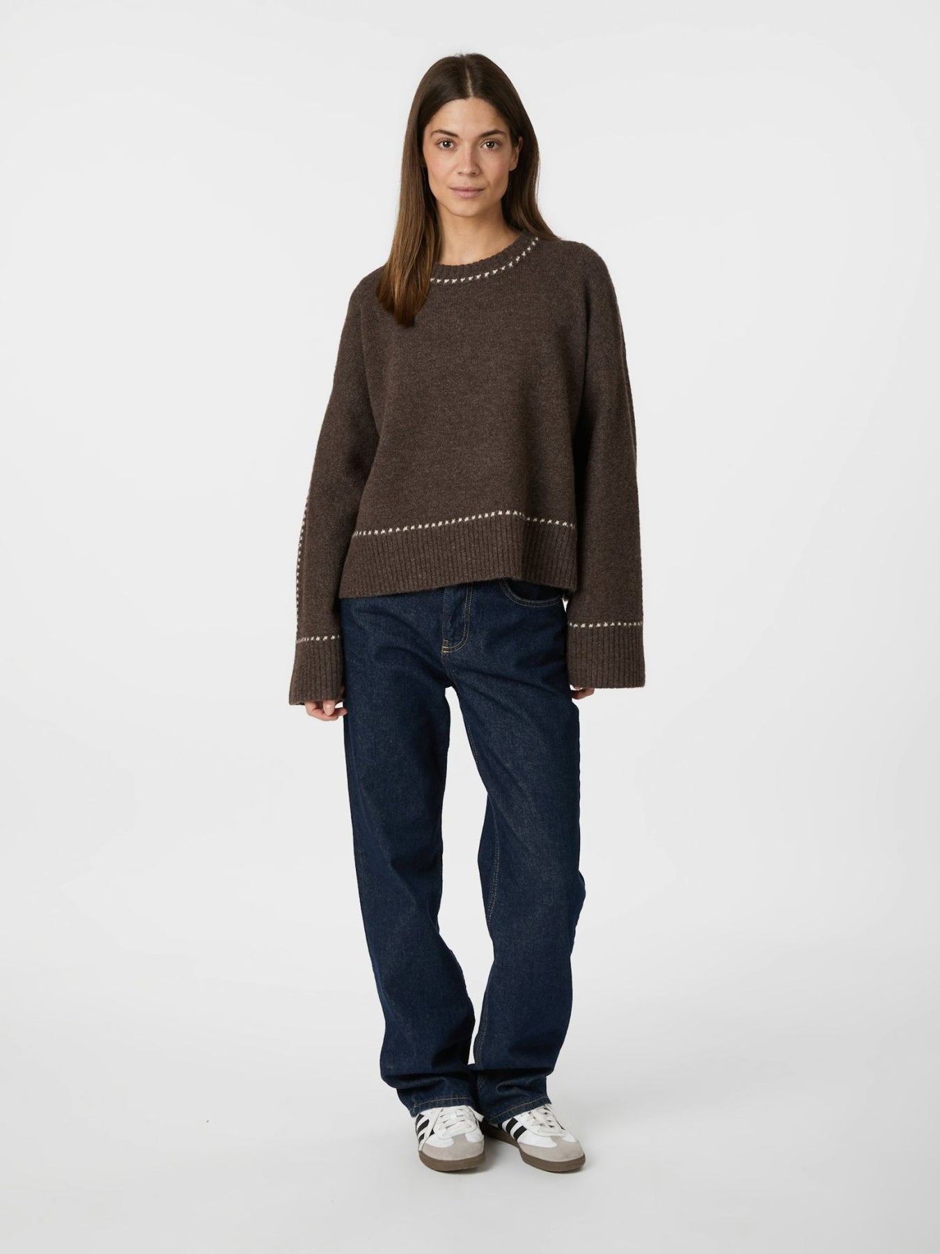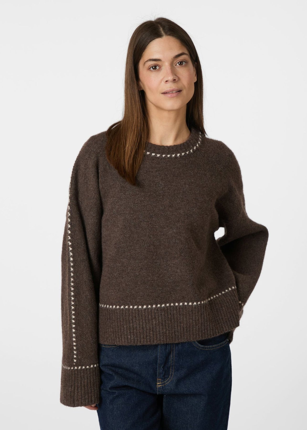 Brun striktrøje fra Neo Noir. Den har brede ærmer, en hoftelang pasform og hvide stingdetaljer ved halsudskæringen, armene og bunden.