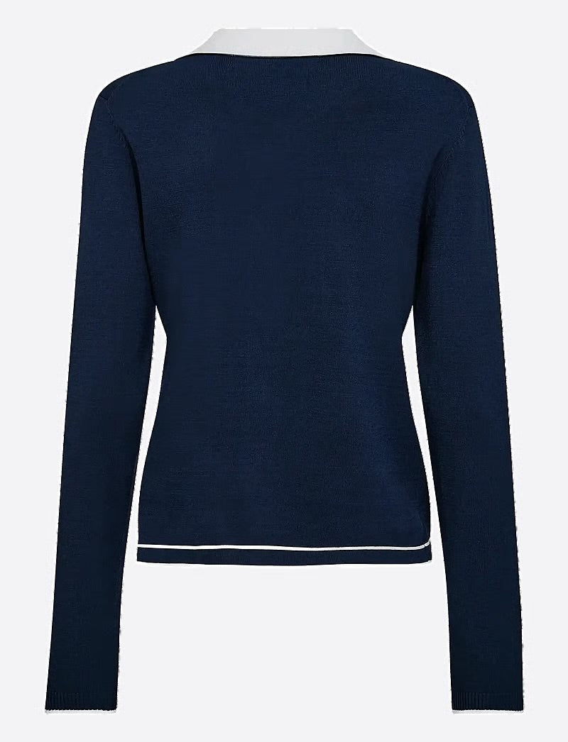 Flot strikket polo i navy med hvide kontraster. Poloen har krave, brystlommer og knaplukning.