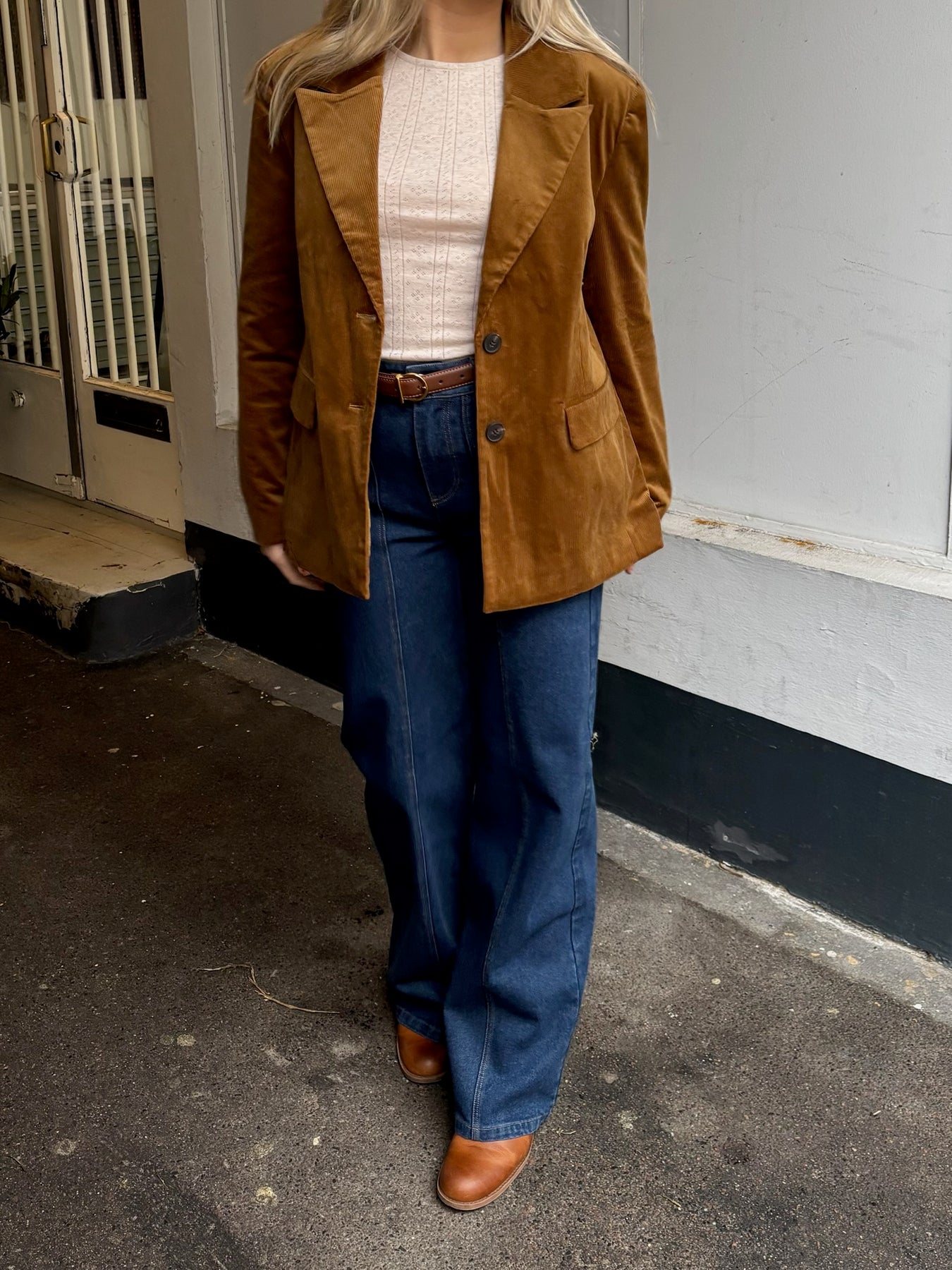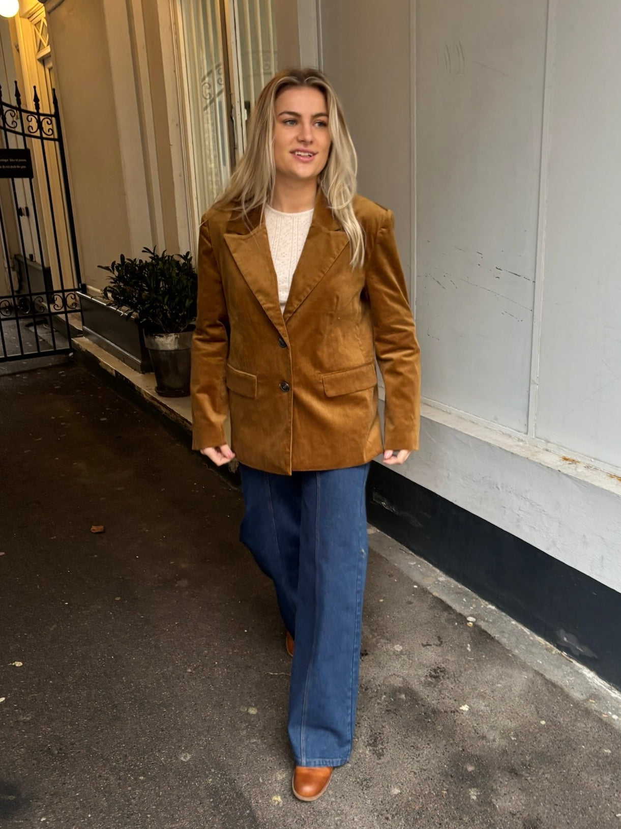 Cognacfarvet fløjlsblazer fra Sofie Schnoor. Blazeen har en løs oversize pasform.