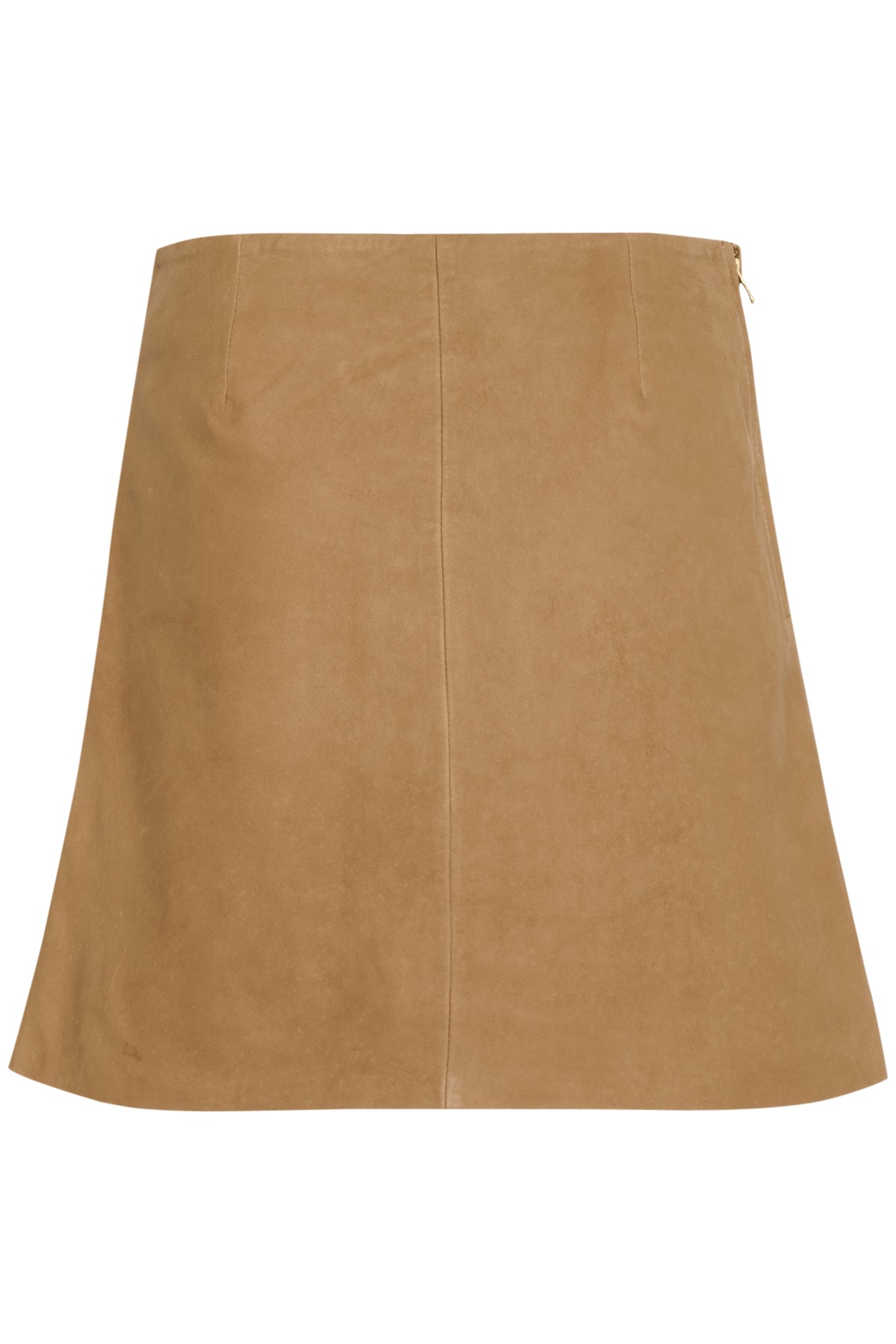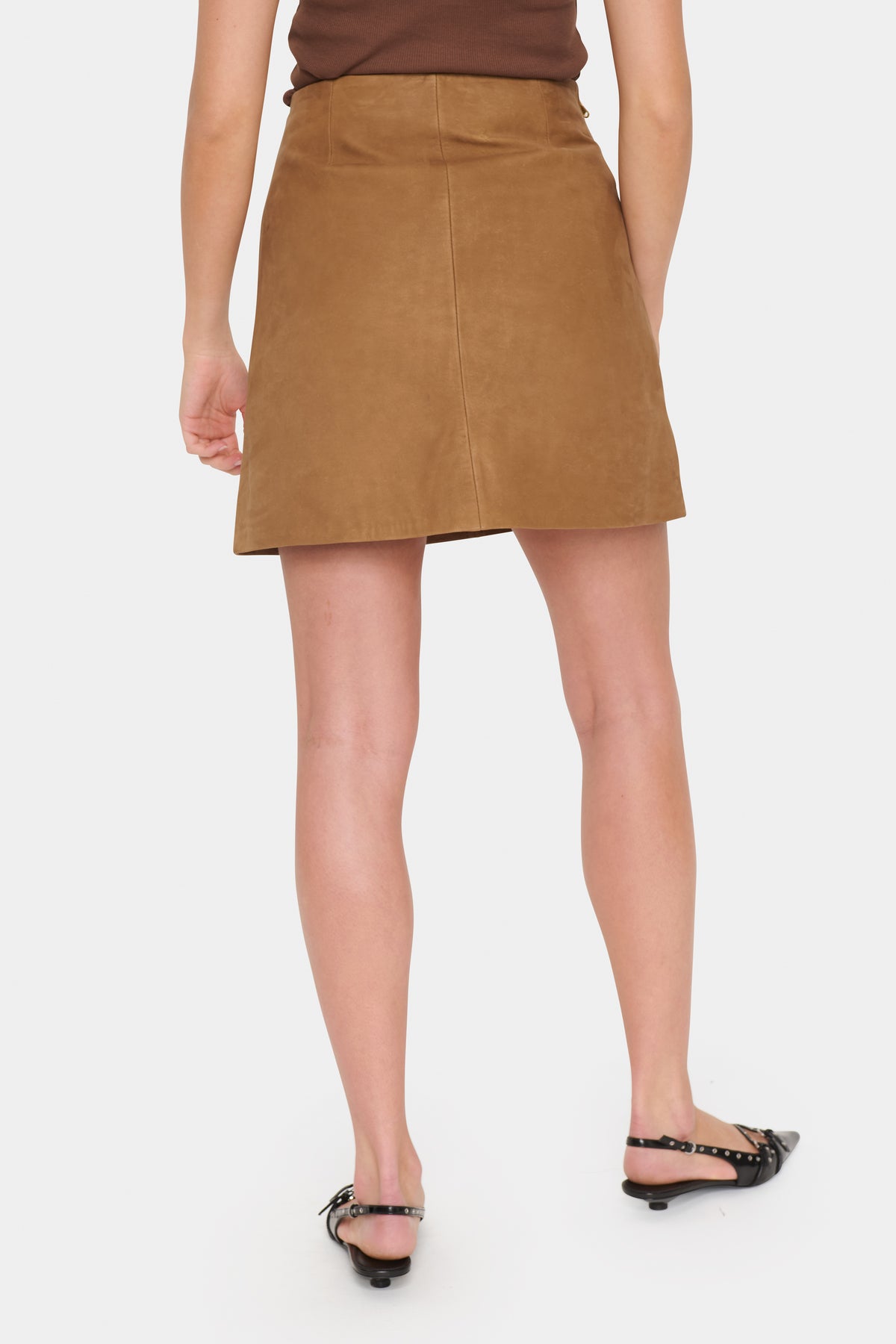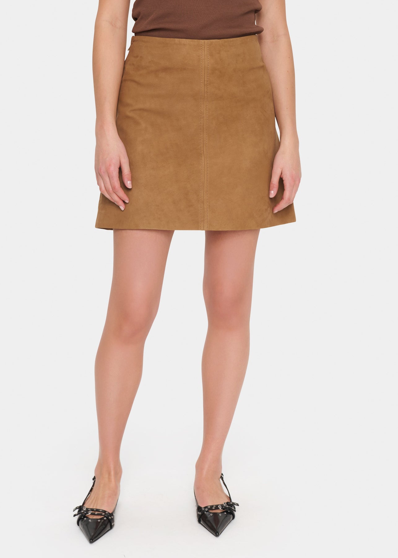 Kort nederdel i ægte skind. Nederdelen har lynlås bagpå og en smule a-form.