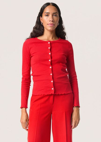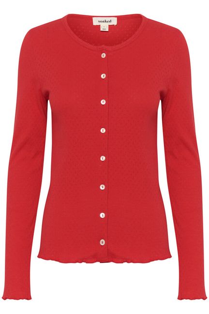 Fin cardigan fra Soaked in Luxury med små hul-detaljer og flæsedetaljer ved ærmer og liv. Cardiganen lukkes foran med hvide knapper.