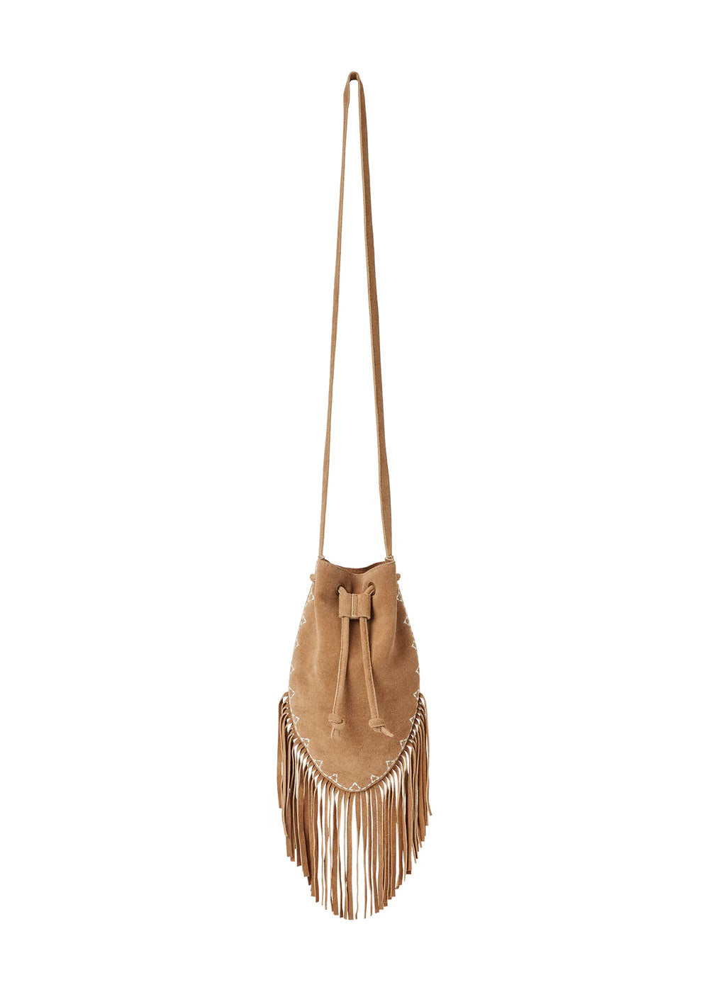 Fin crossbody taske fra Lollys Laundry. Tasken har hvide syninger og brune frynser i læder.