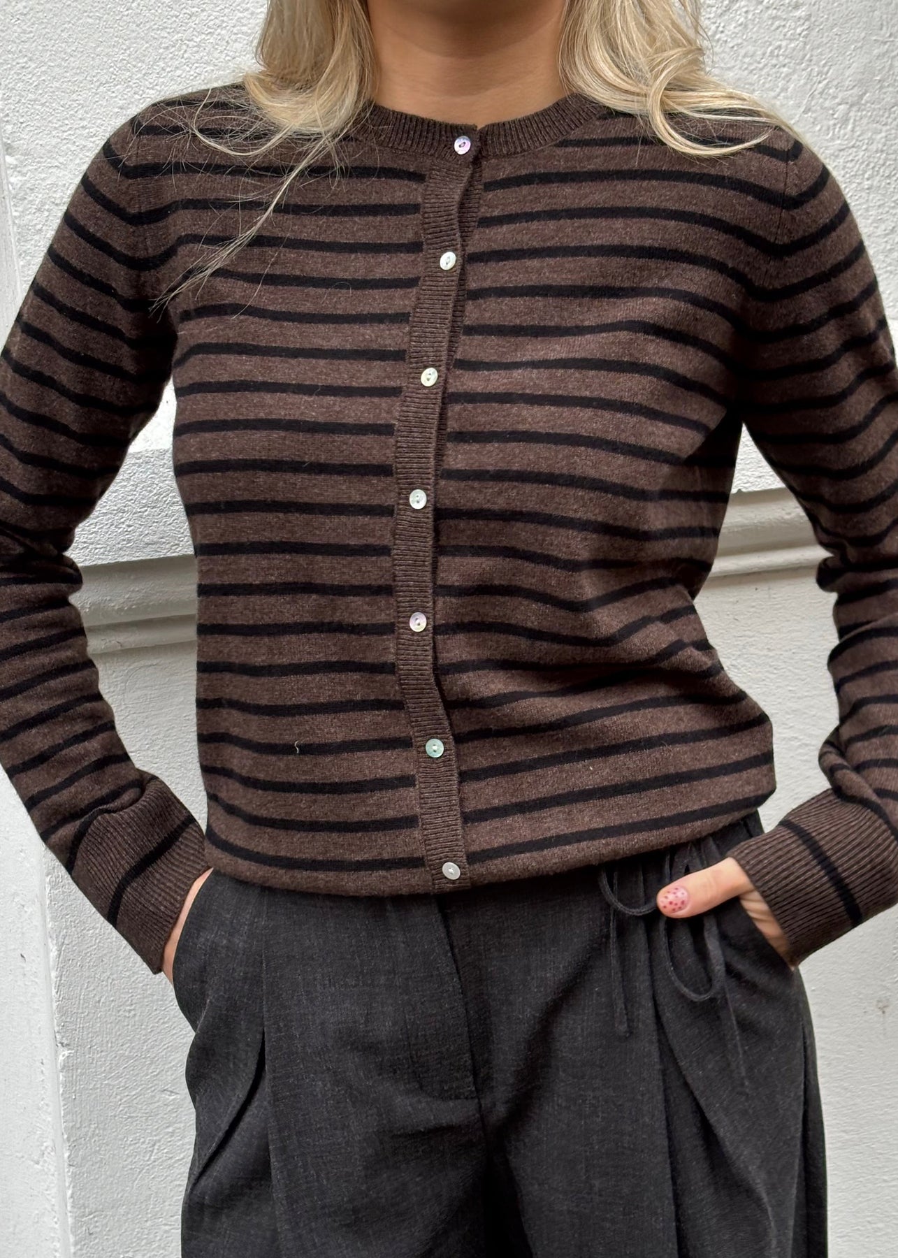 Stribet cardigan fra Sofie Schnoor. Den er brun med sorte striber og lukkes foran med hvide knapper.
