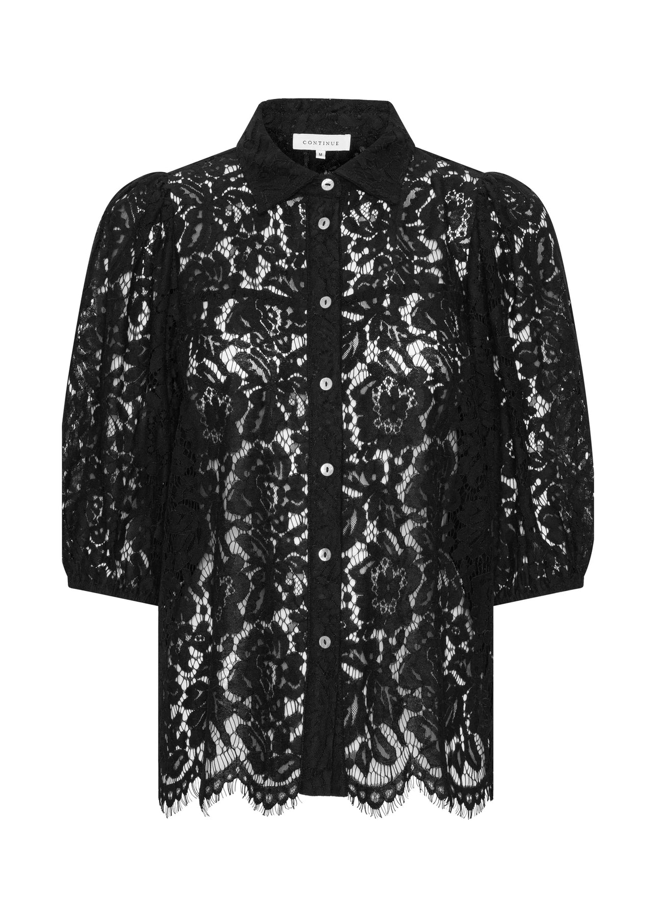 Fin sort blondebluse fra Continue. Blusen har knapper foran og en klassisk krave. Den har stumpede puffede ærmer med elastik ved ærmeafslutningen og en lige pasform.