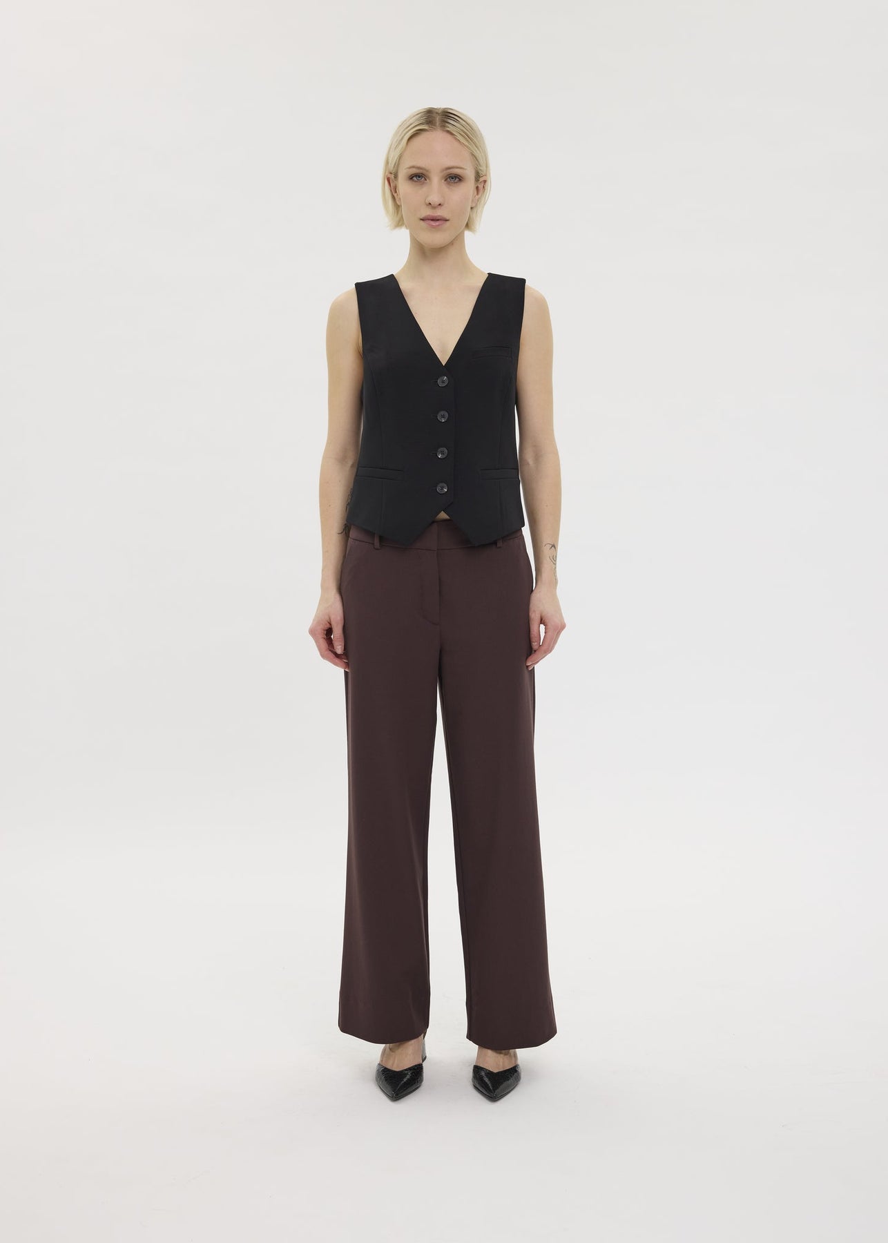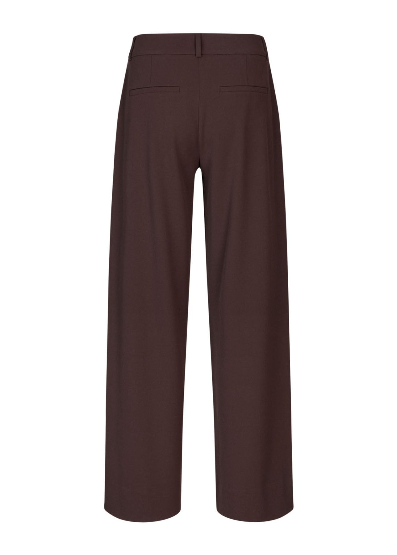 Mørkebrune habitbukser med brede ben og en diskret vævet stribe. De har mellemhøj talje og en løs, behagelig pasform. Bukserne har en formsyet linning og et tungt fald for et rent og klassisk udtryk.
