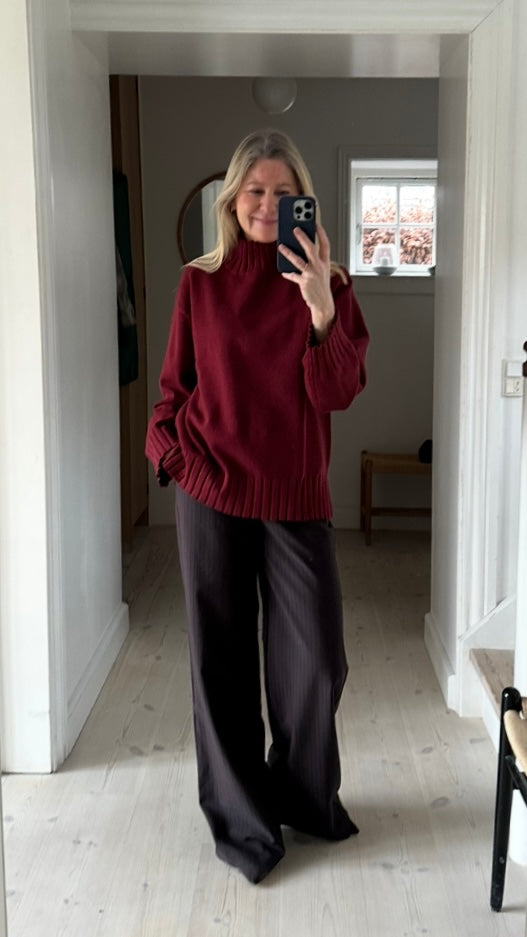 Lækker bordeaux pullover fra Minimum. Pulloveren har turtleneck, en løs oversize pasform og ribkanter.