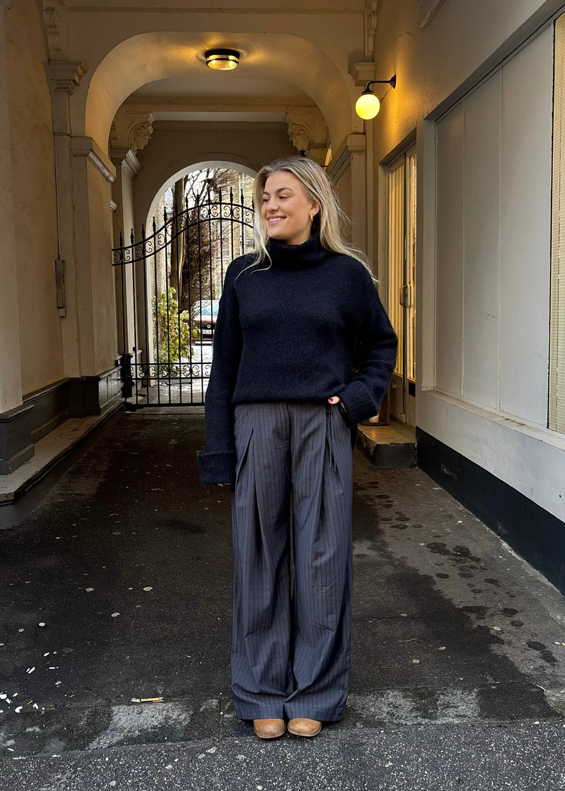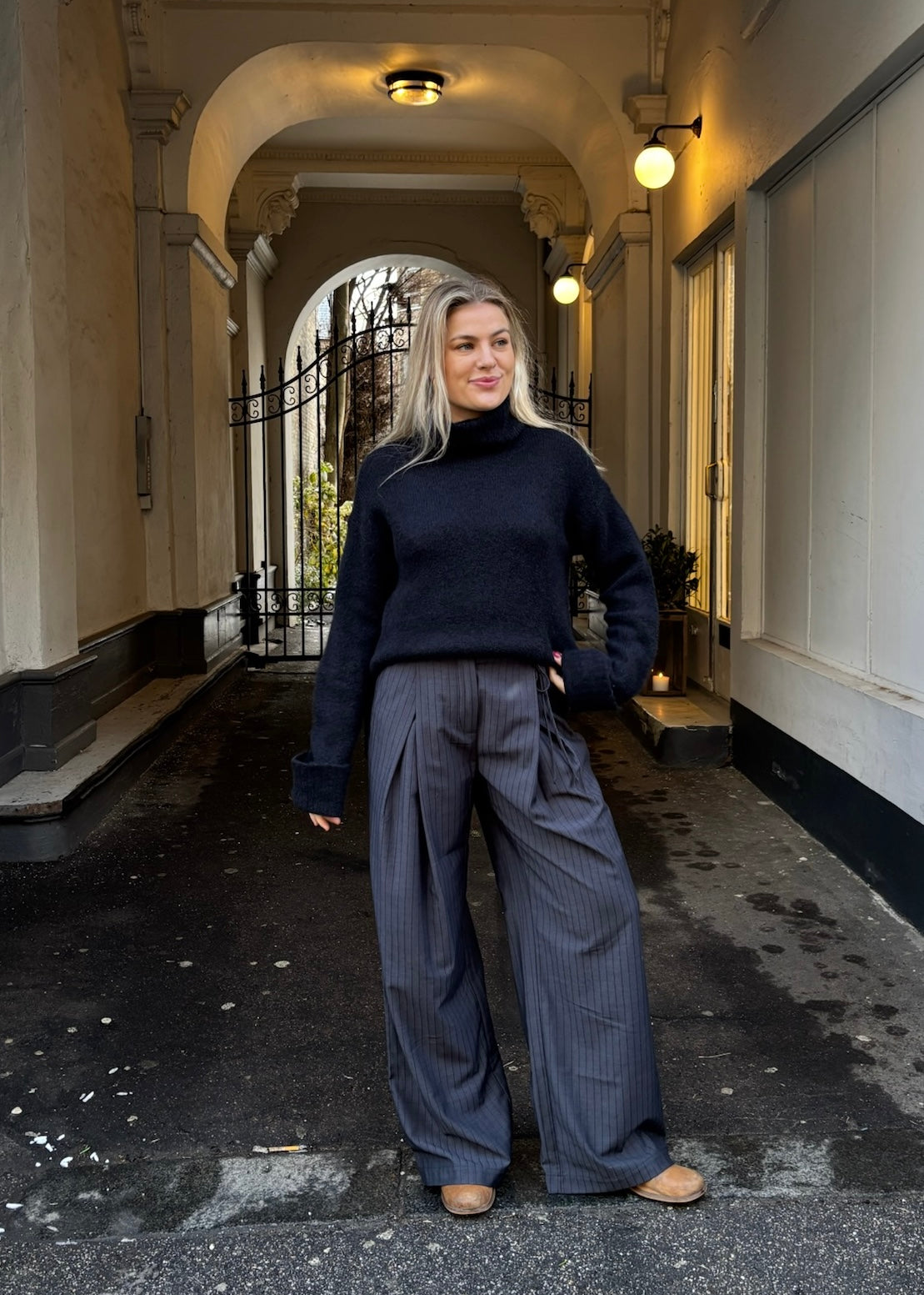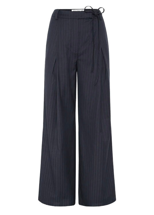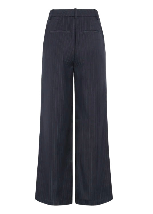 Fine bukser fra Minimum. De er i en dyb mørkegrå farve med sorte vertikale striber, og så har de et bindebånd i livet.
