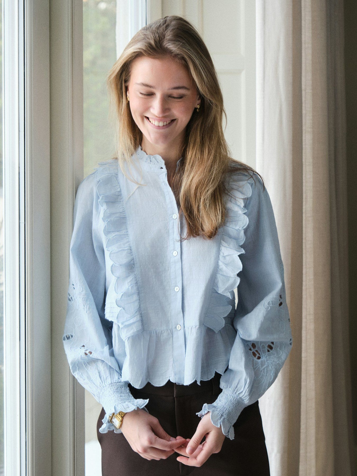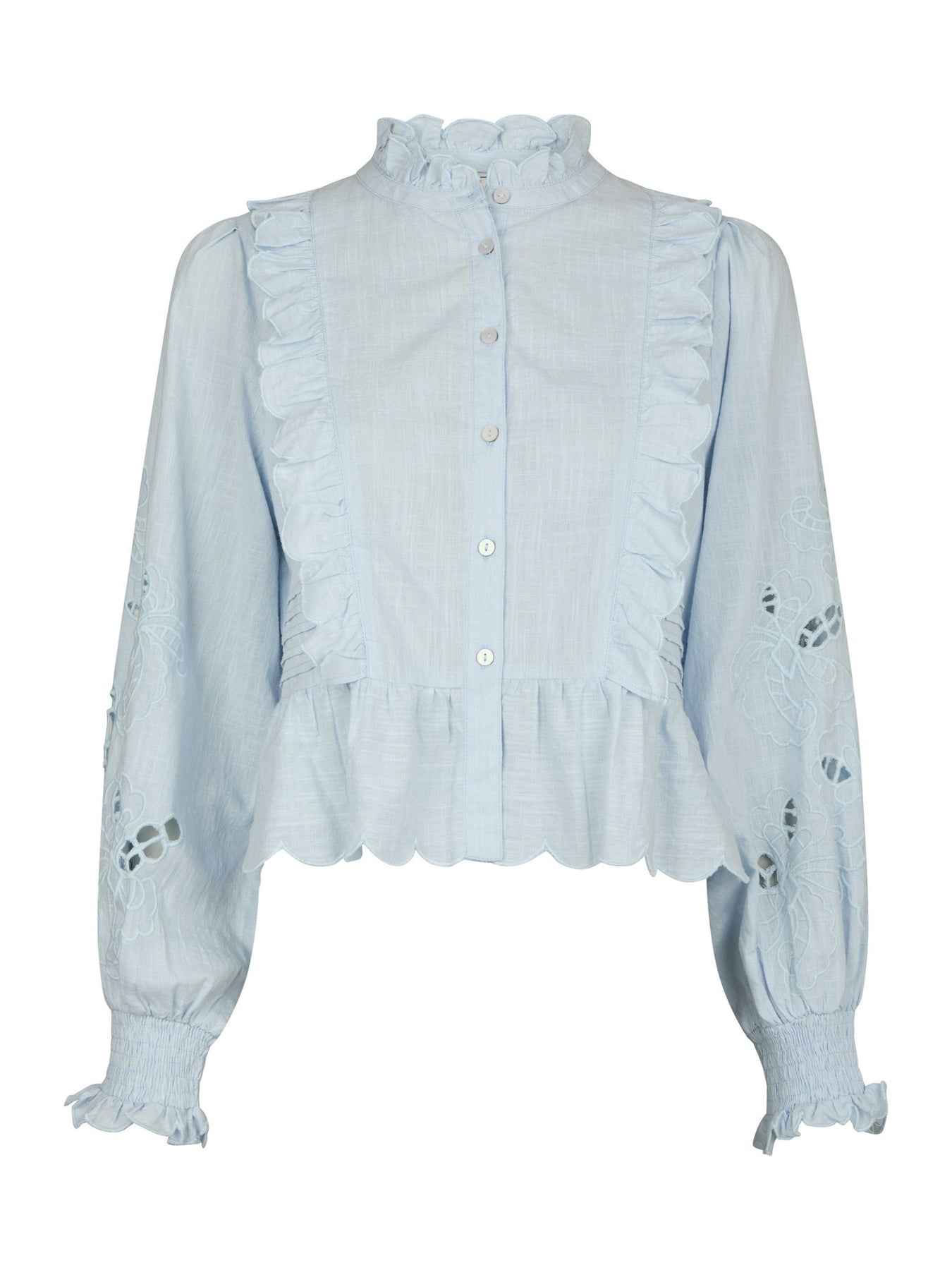 Feminin skjortebluse broderi anglaise på ærmerne. flæsekant ned foran og lille krave.