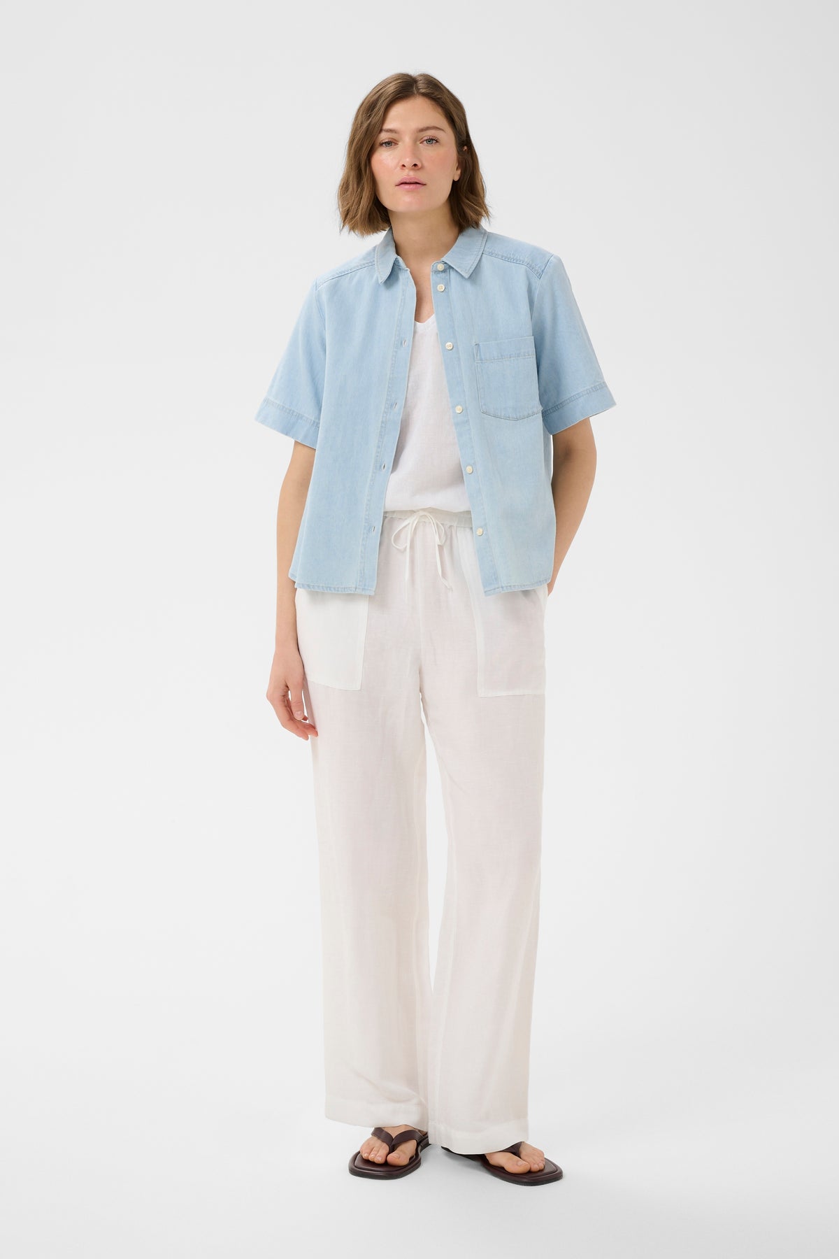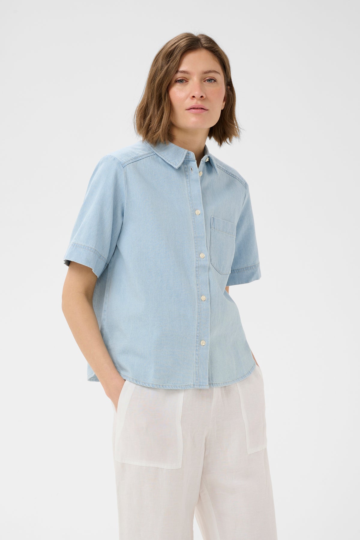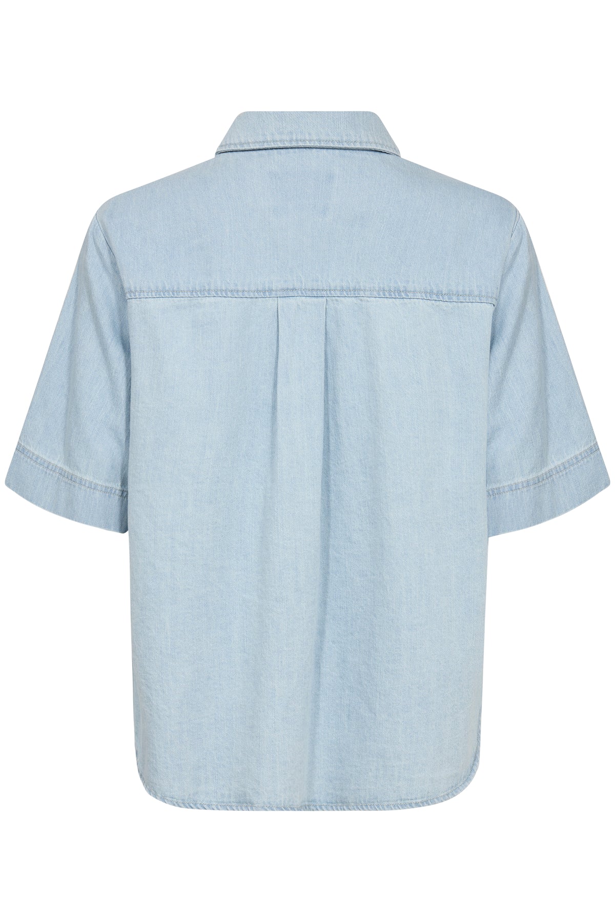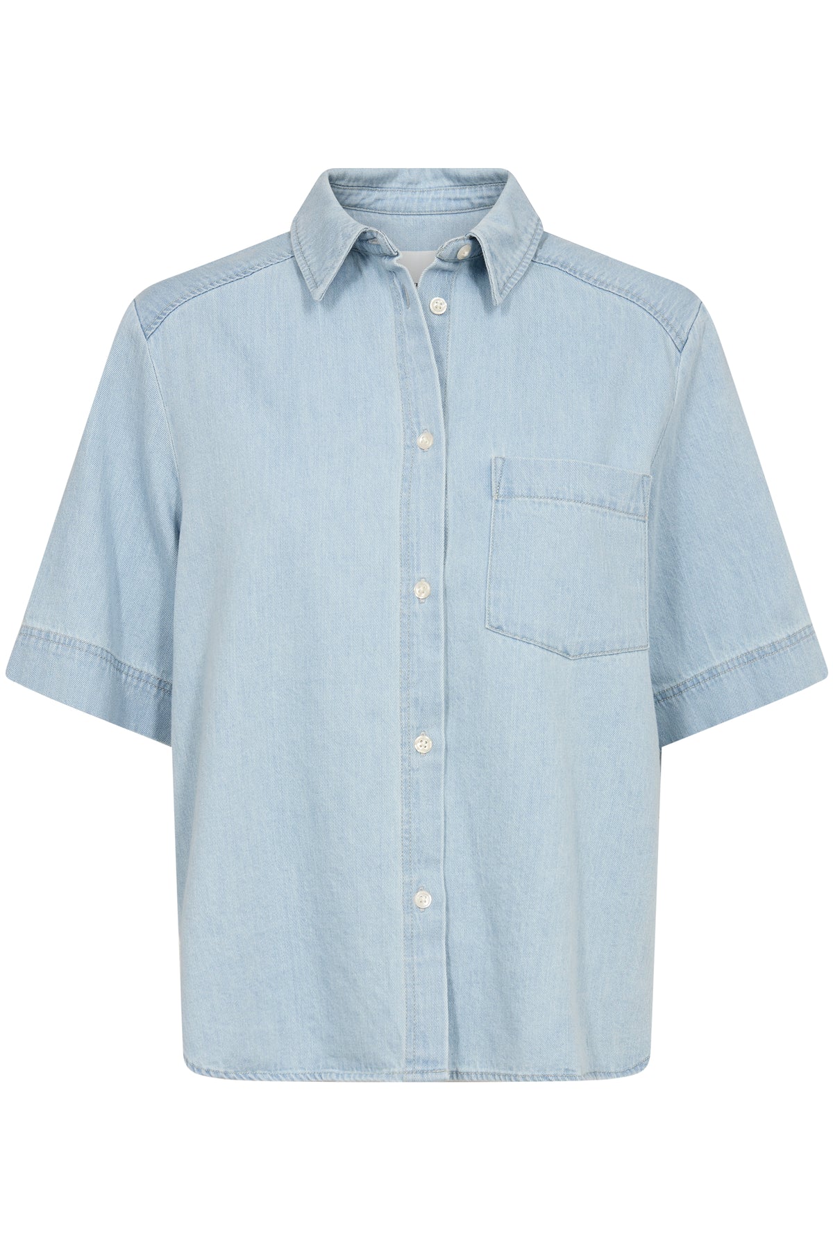 Lys kortærmet denimskjorte i lækker blød kvalitet. Skjorten har klassisk krave, knaplukning, løse ærmer og en brystlomme.