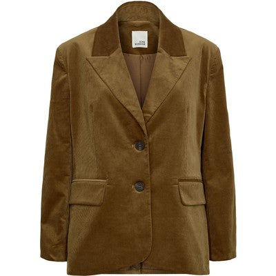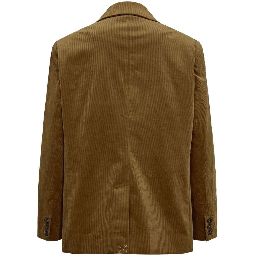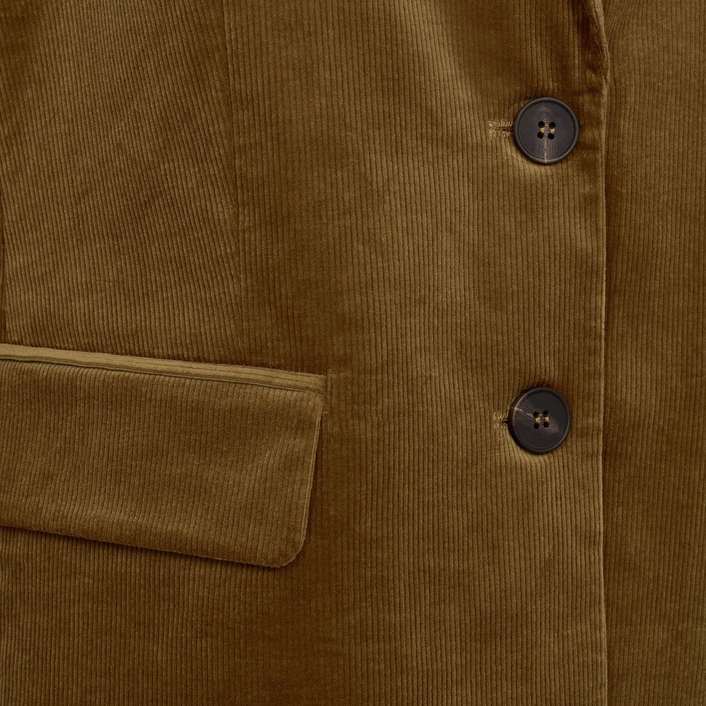 Brun blazer fra Sofie Schnoor. Kjolen er i fløjl, har en v-halsudskæring og lukkes foran med sorte knapper.