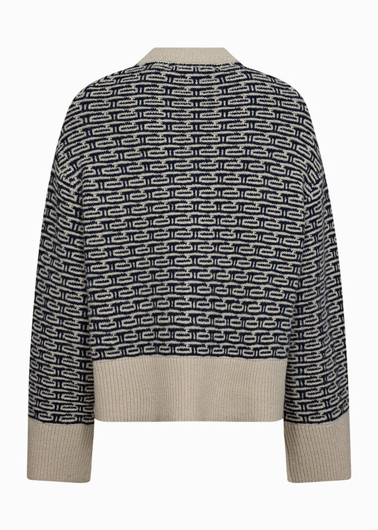Lækker cardigan fra Pieszak med off-white og navy vævning, v-udskæring og brede off-white kanter.