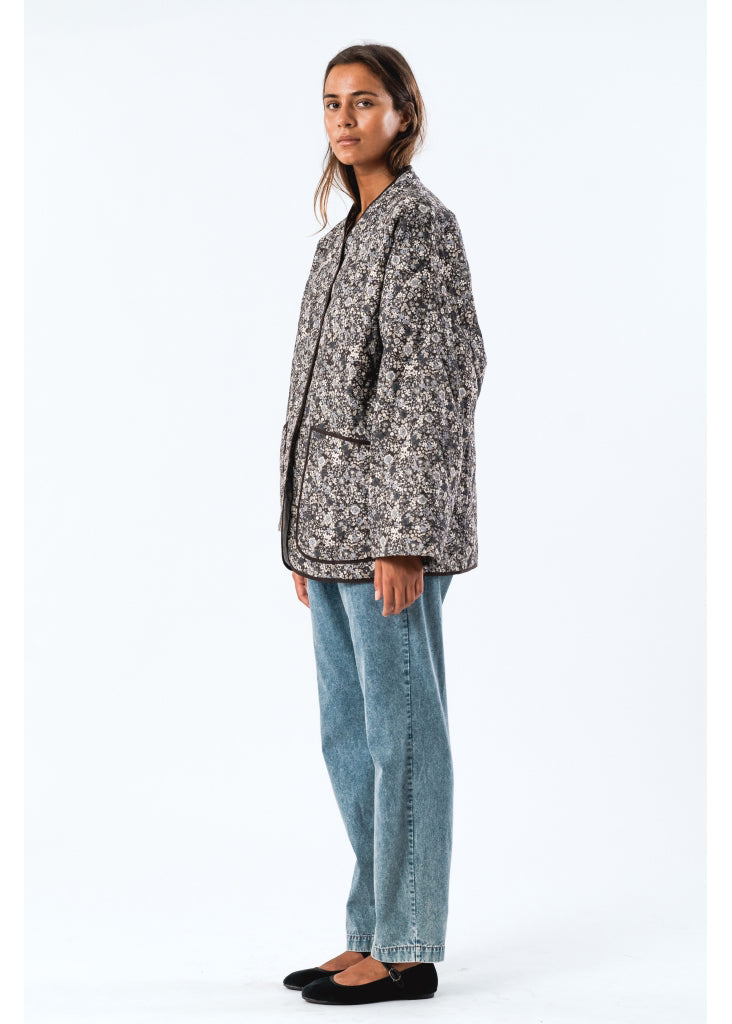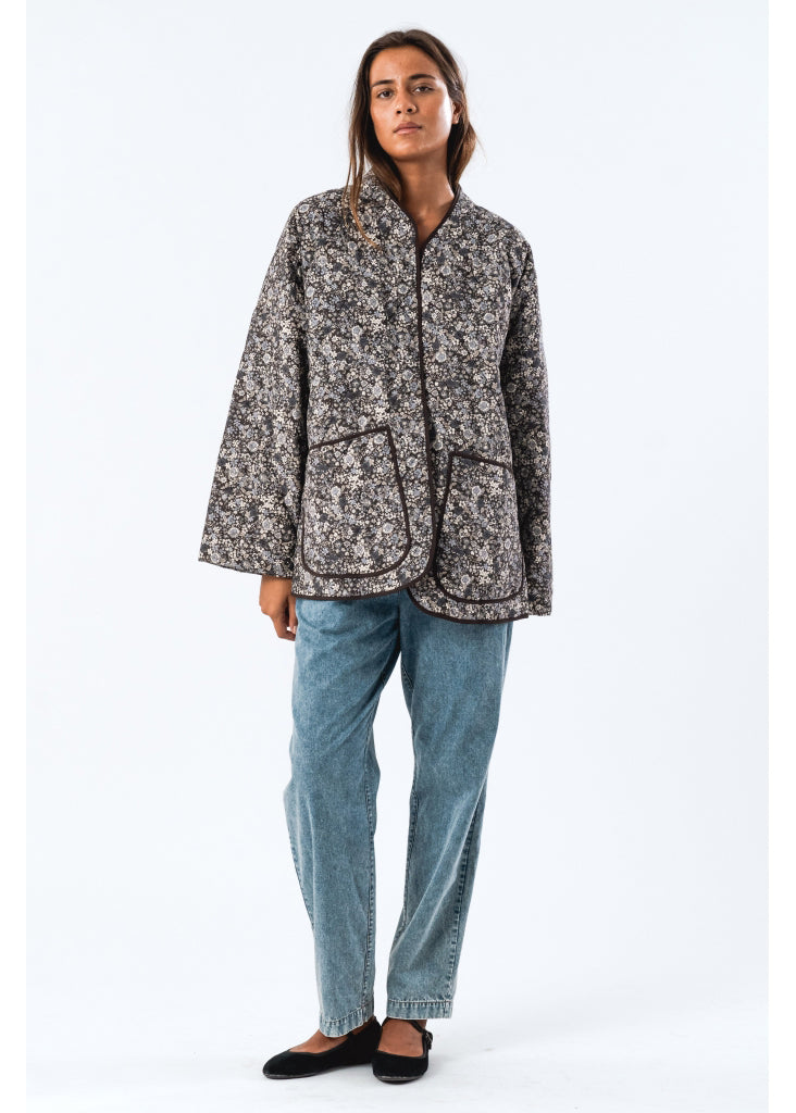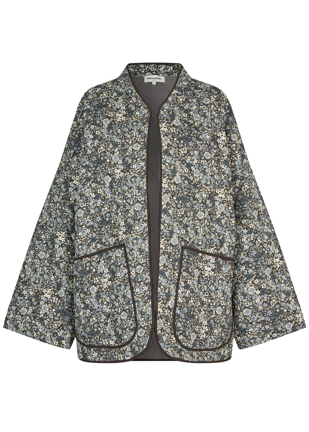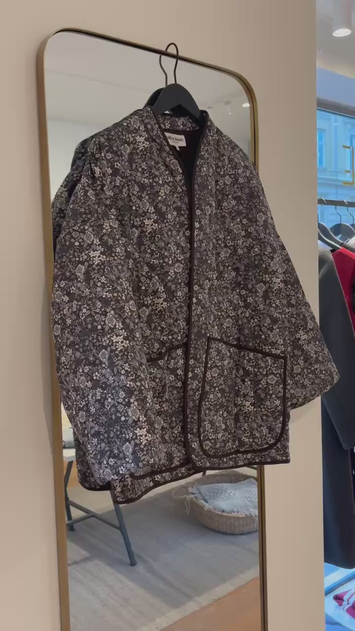 Skøn quiltet jakke fra Lollys Laundry med fint blomsterprint i sort, grå, sand og sart blå nuancer. Jakken har 3/4 ærmer og store lommer foran.