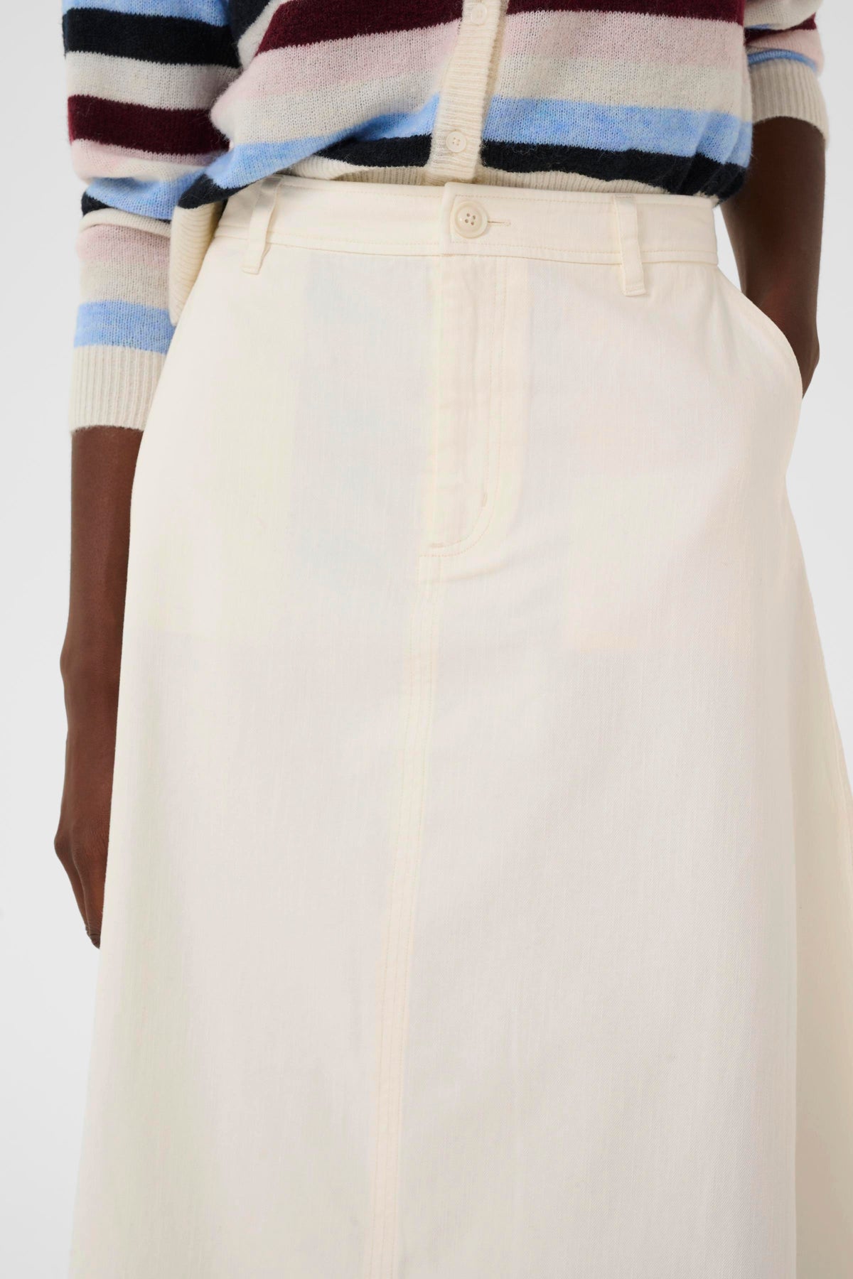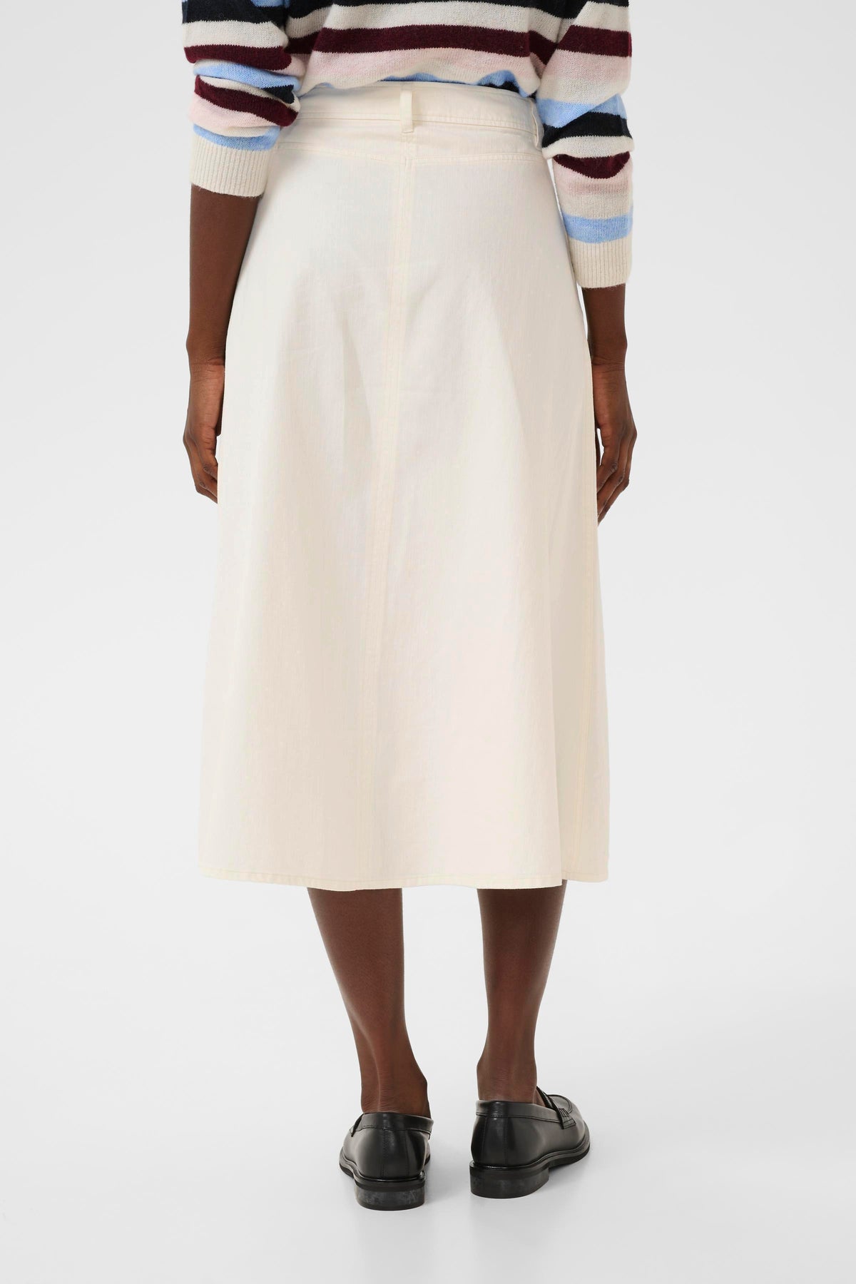 Skøn mellemlang nederdel med sidelommer, lynlås og knaplukning og baglommer.