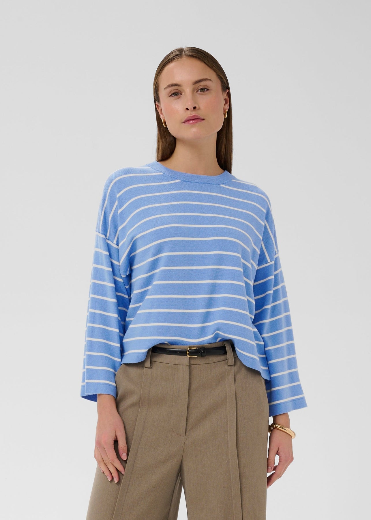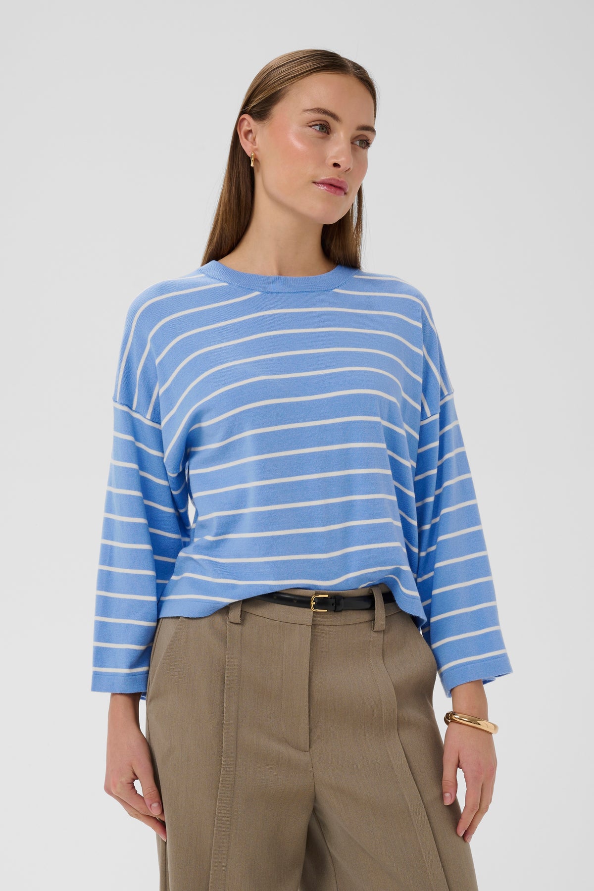 Ultrablød stribet bluse med rund hals, dropped shoulders og en løs pasform.