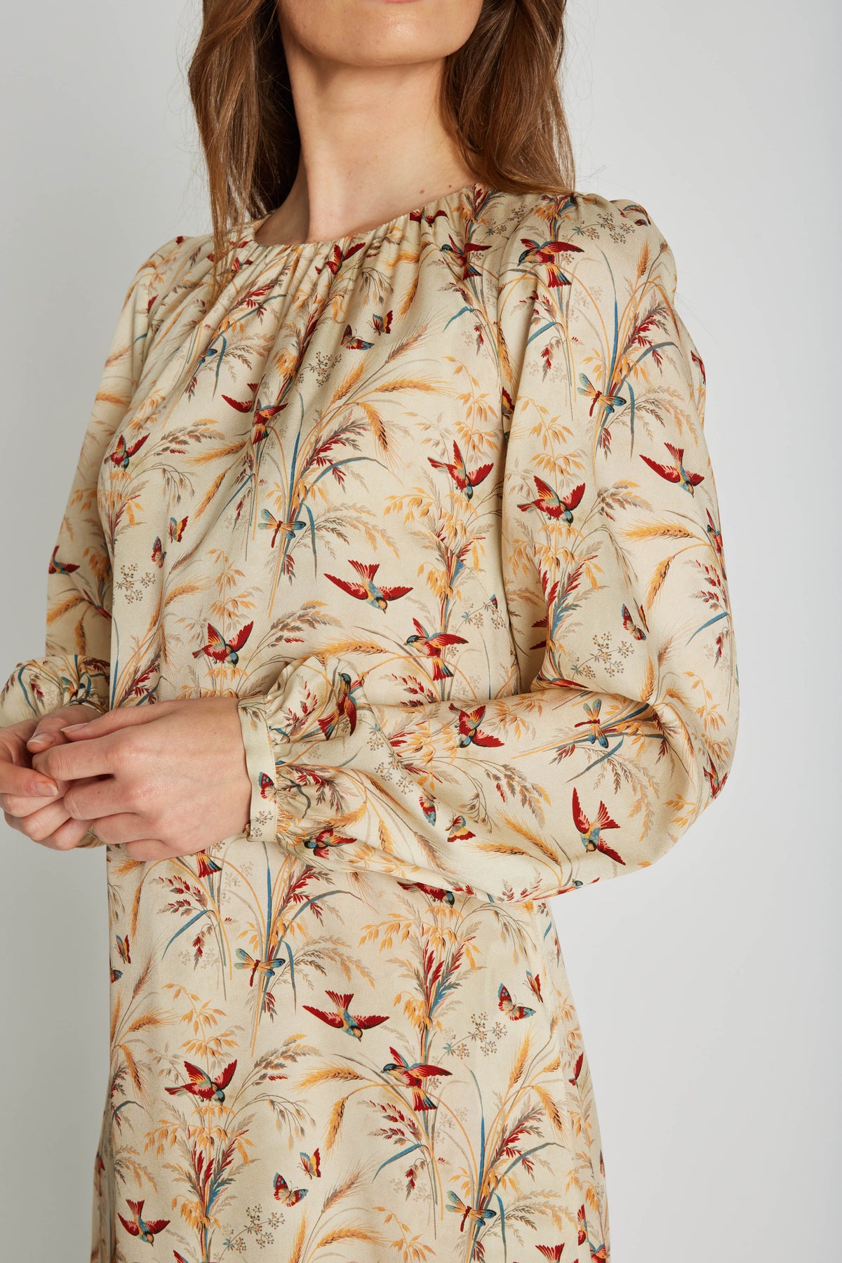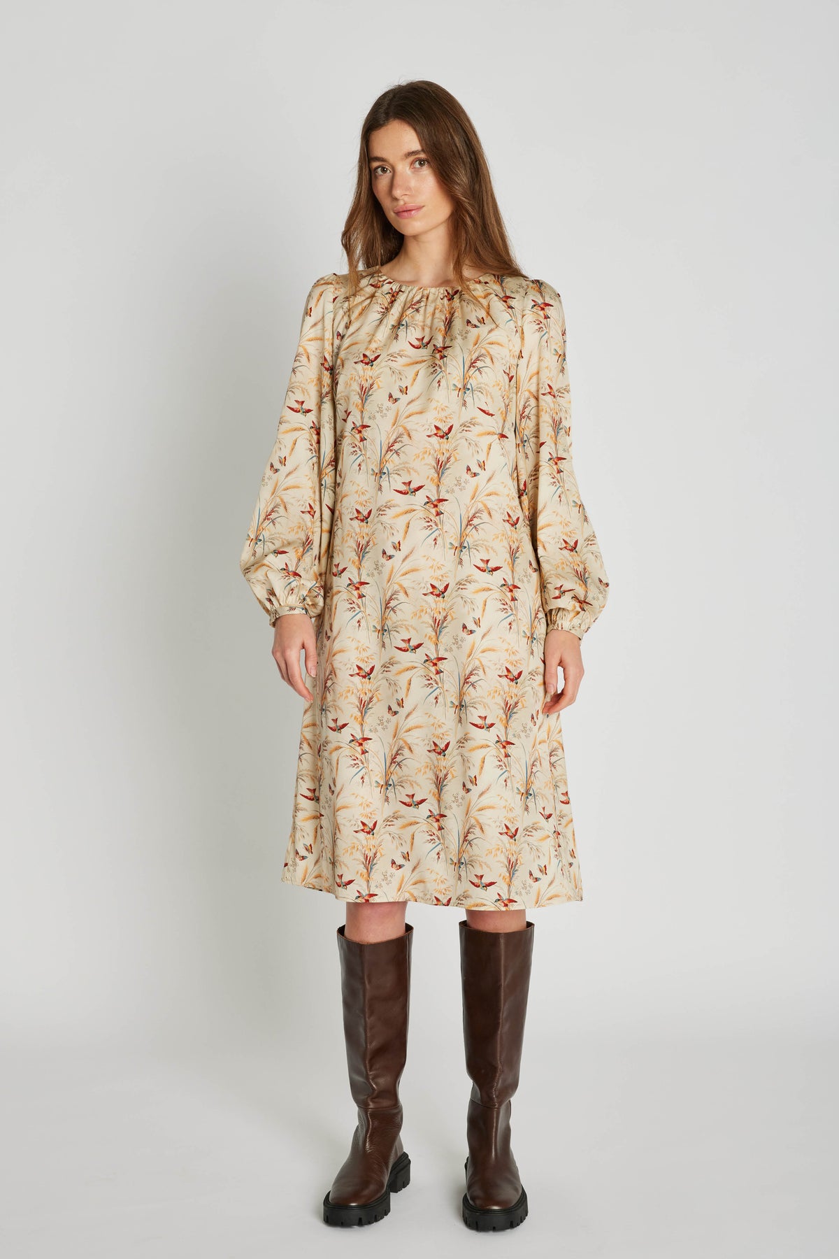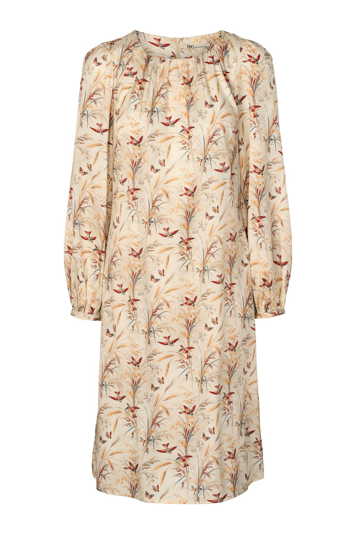 Silkekjole fra PBO med smukt print og i let og blød silkekvalitet. Kjolen har rund hals med rynk, lange ærmer med smal manchet og en løs pasform til knæene.