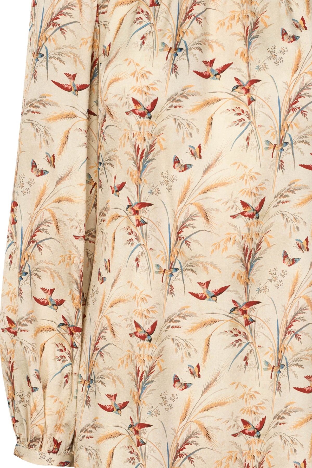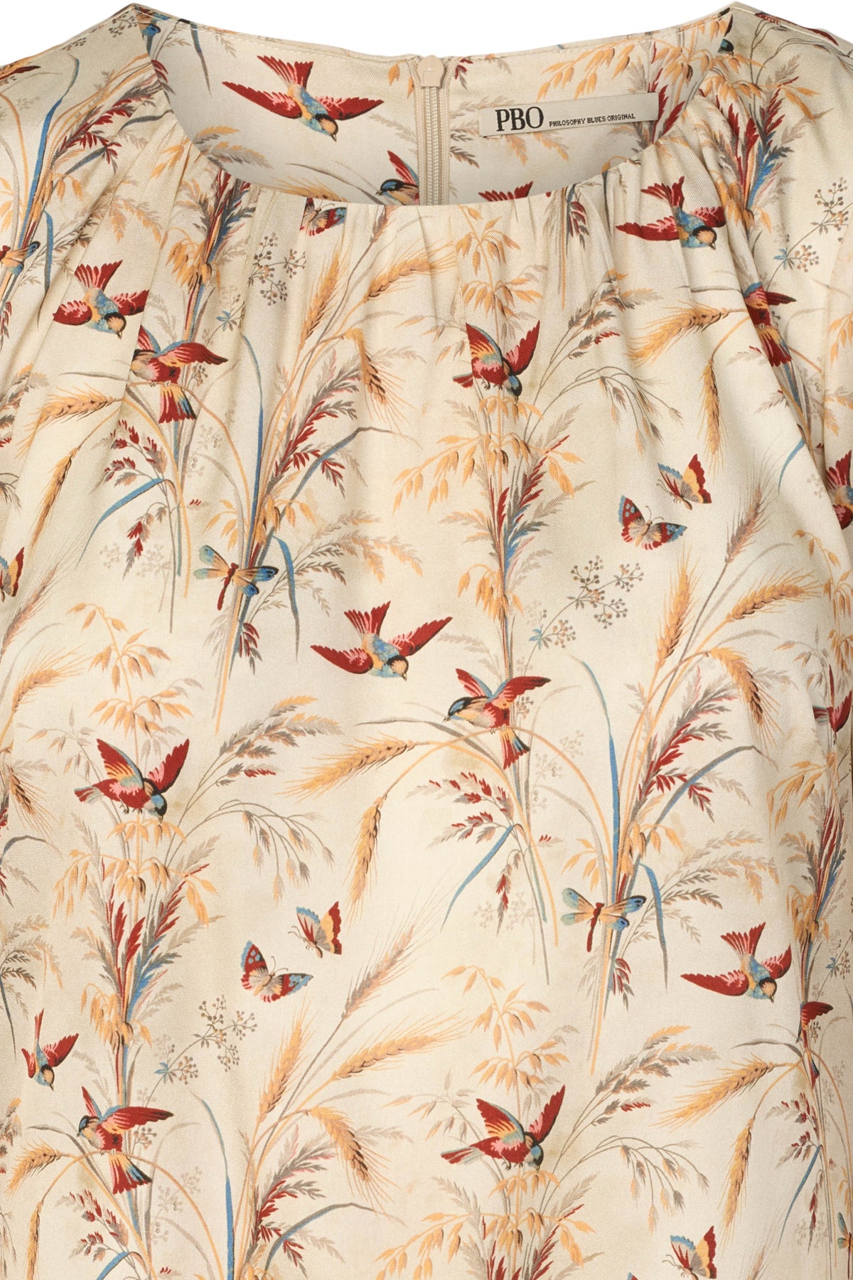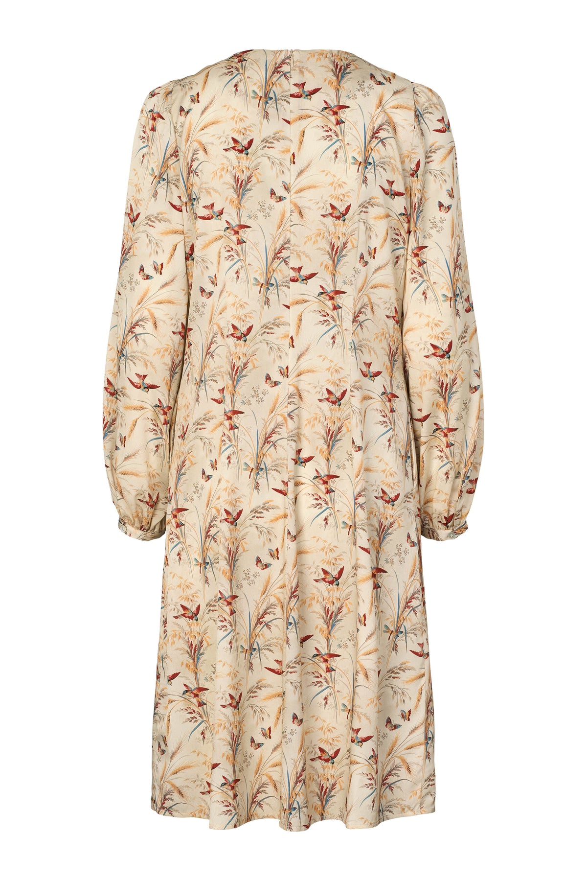 Silkekjole fra PBO med smukt print og i let og blød silkekvalitet. Kjolen har rund hals med rynk, lange ærmer med smal manchet og en løs pasform til knæene.