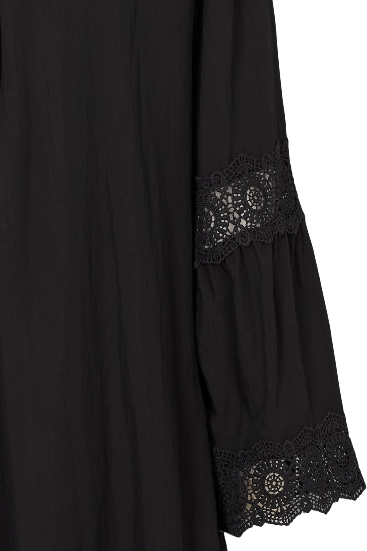 Smuk sort kjole i vicosemix med fine blondetaljer ved skuldre og ærmer. Kjolen har v-udskæring, stumpede løse ærmer og læg i skørtet.