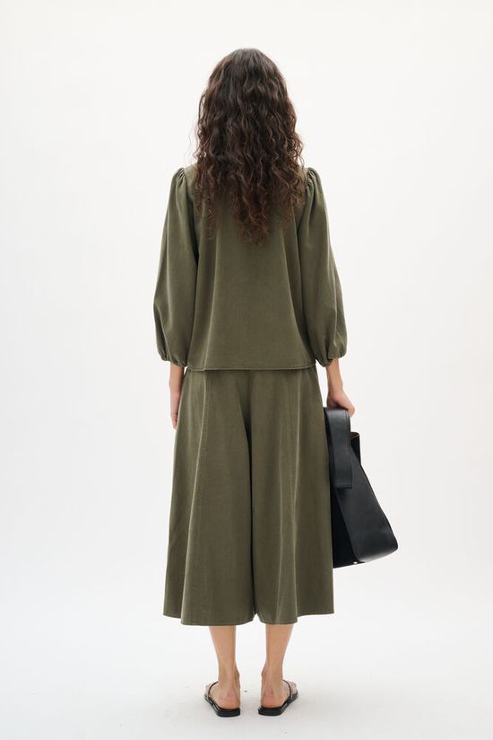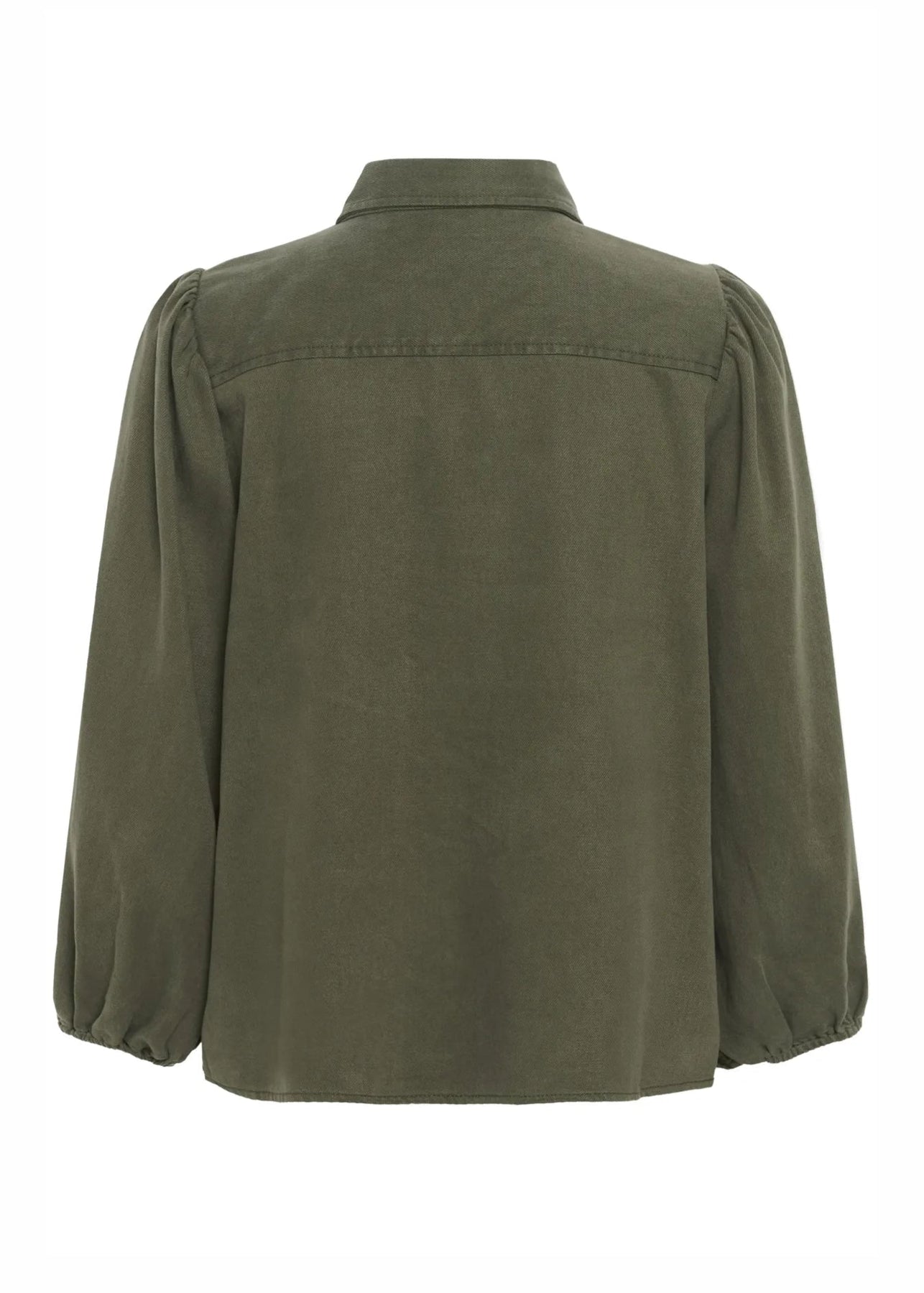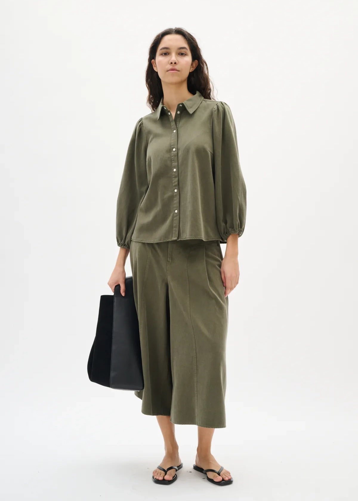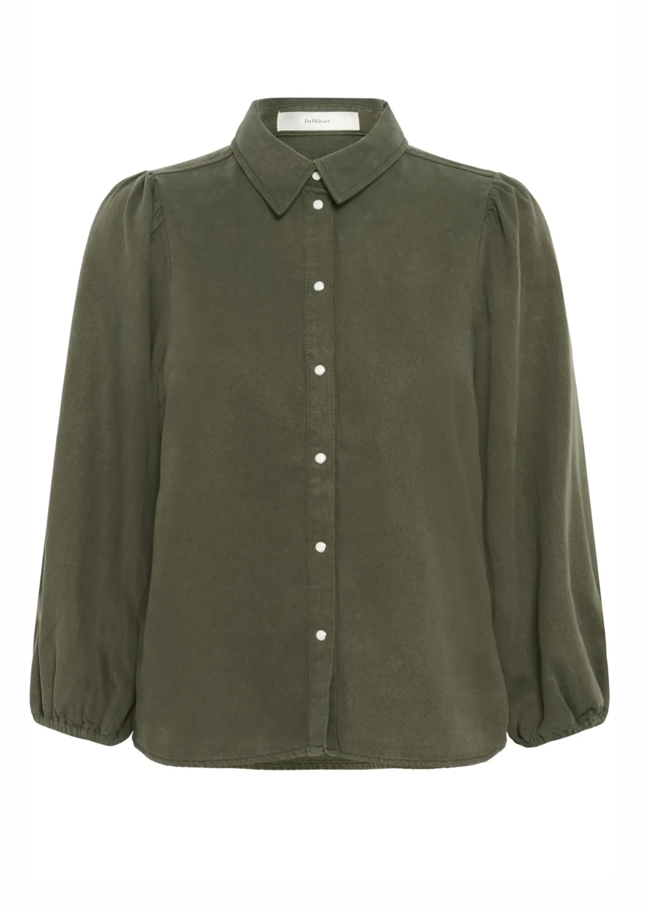 Olivengrøn skjorten fra Inwear. Skjorten har 3/4 ærmer, krave og knaplukning foran.