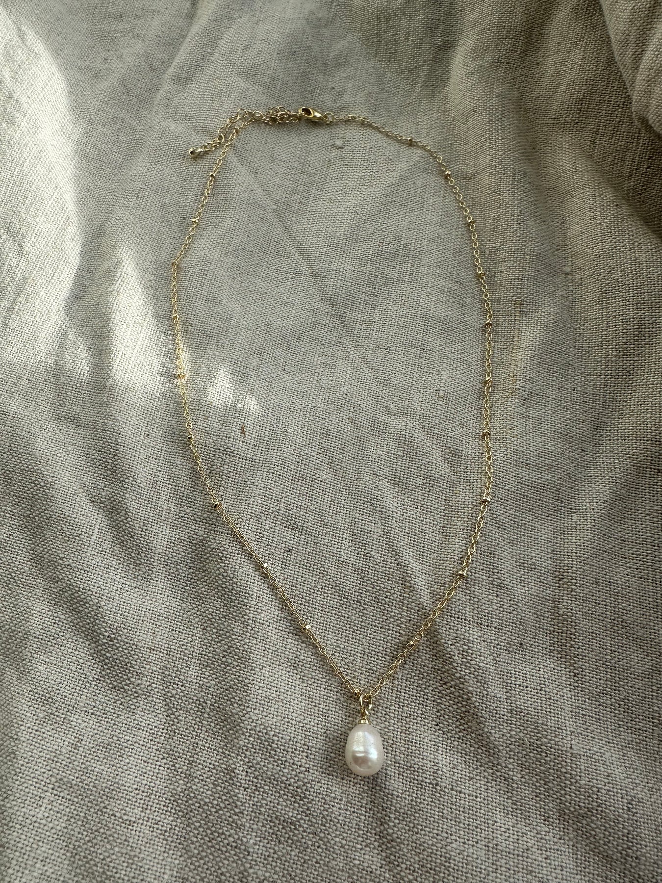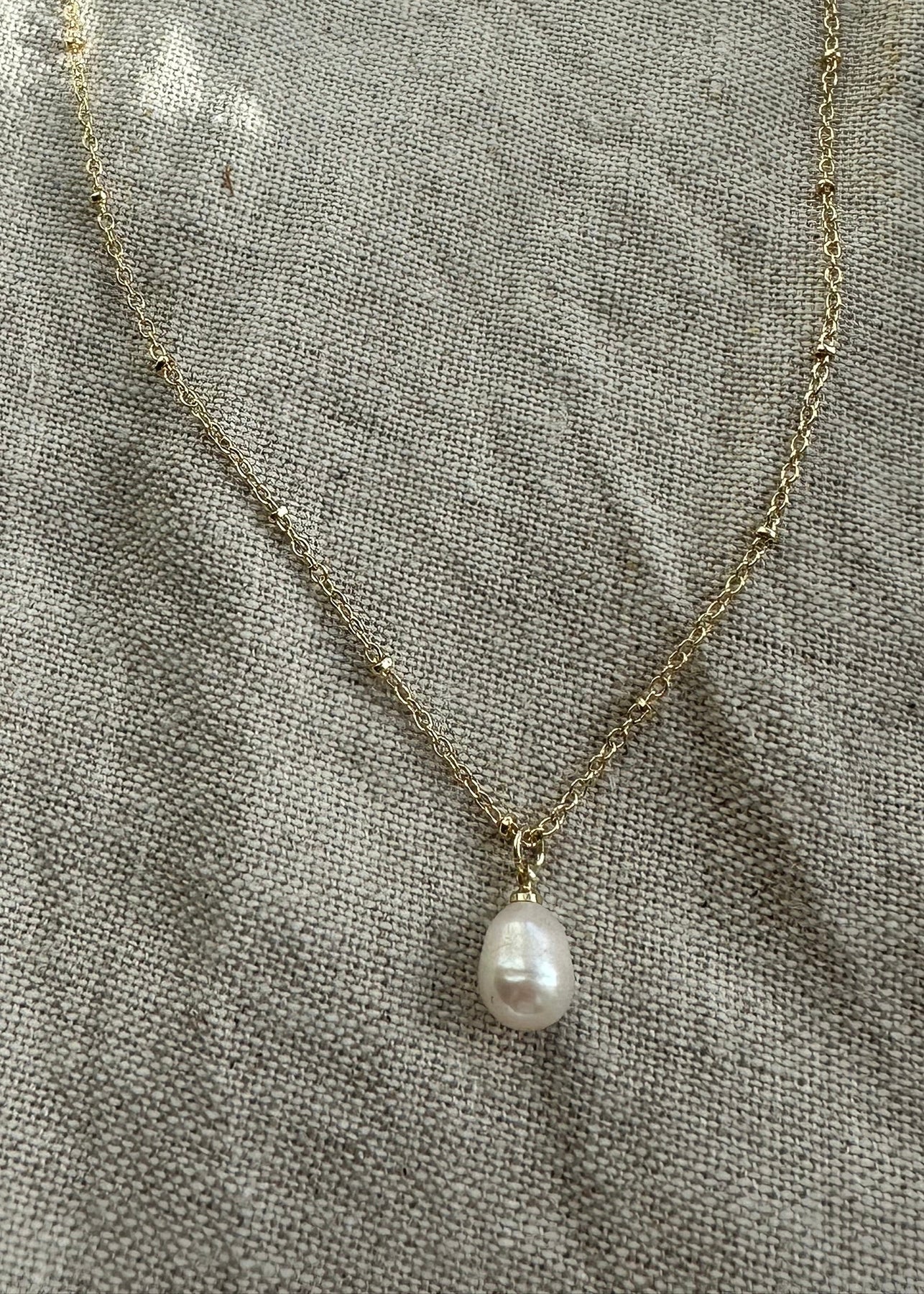 Flot halskæde fra Camilla Folkman med små guldperler og stor perle nederst.