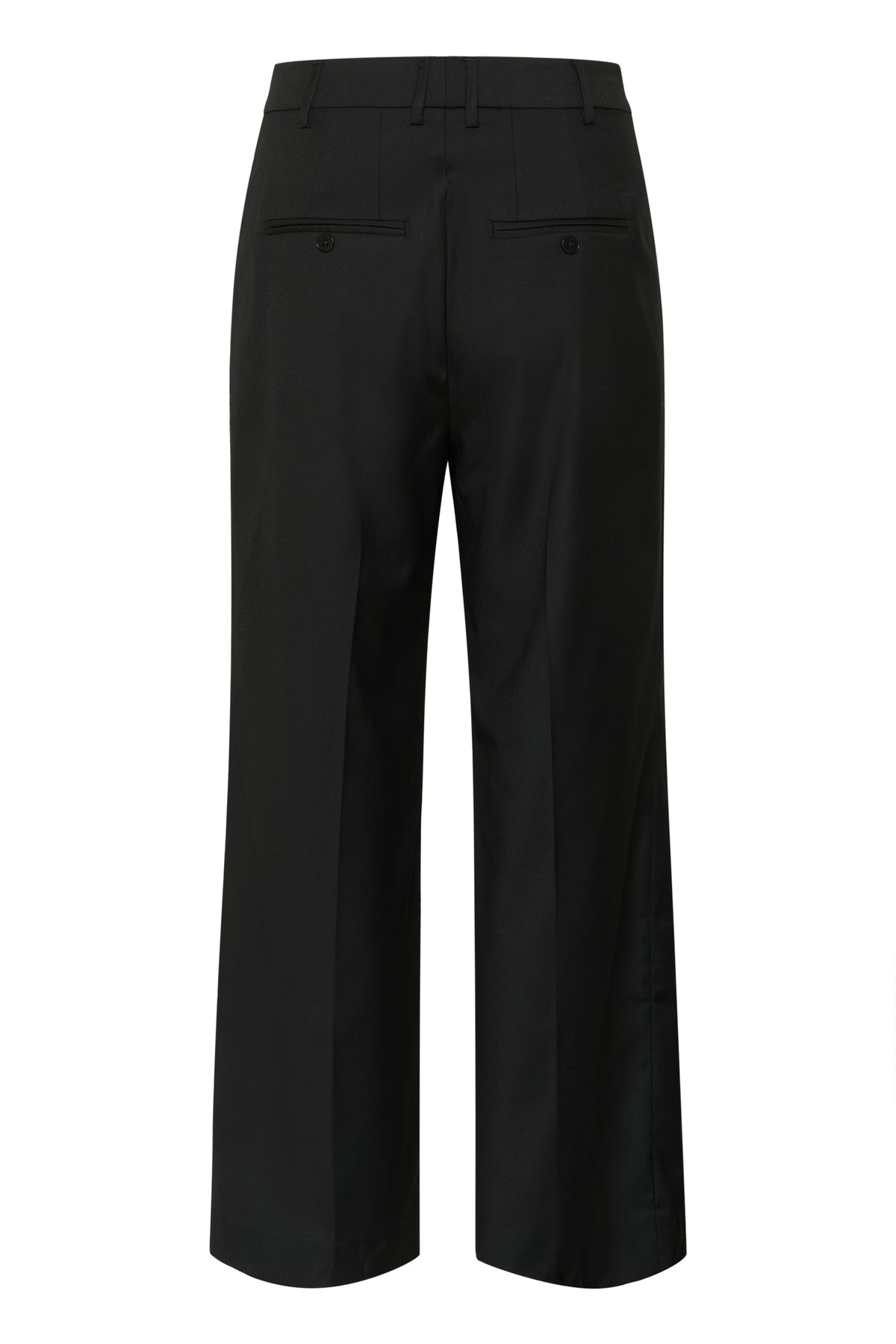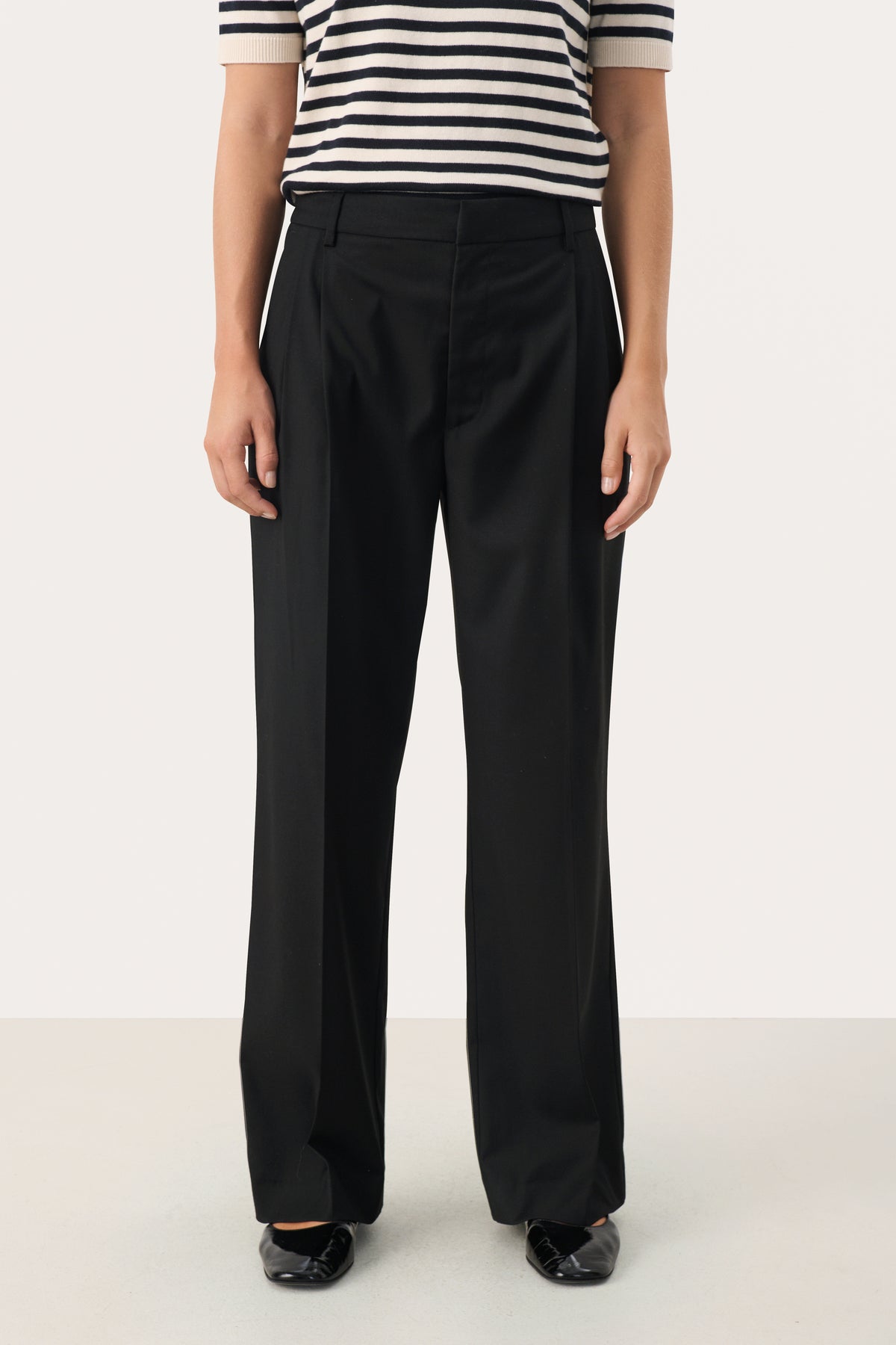 Klassiske sorte bukser fra Part Two. Bukserne er mellemhøje i livet, har læg foran, sidelommer og brede ben.