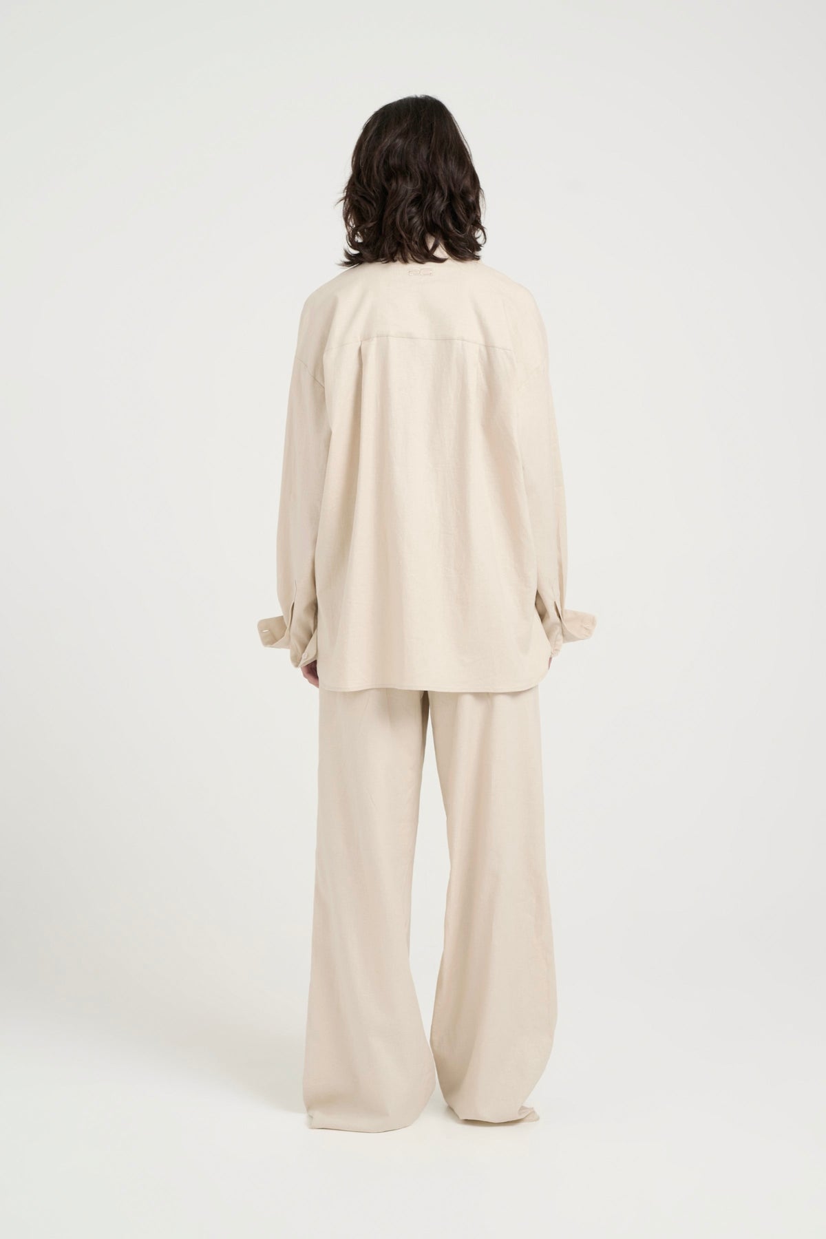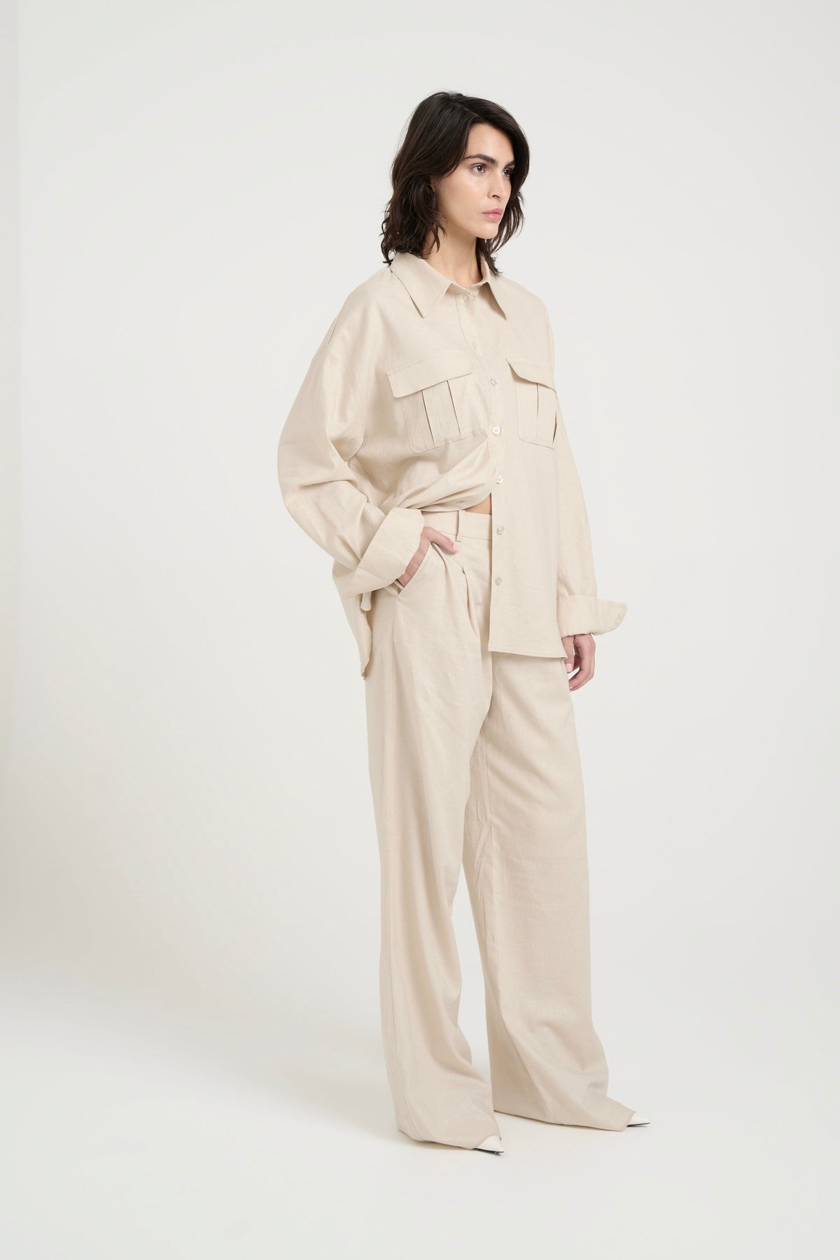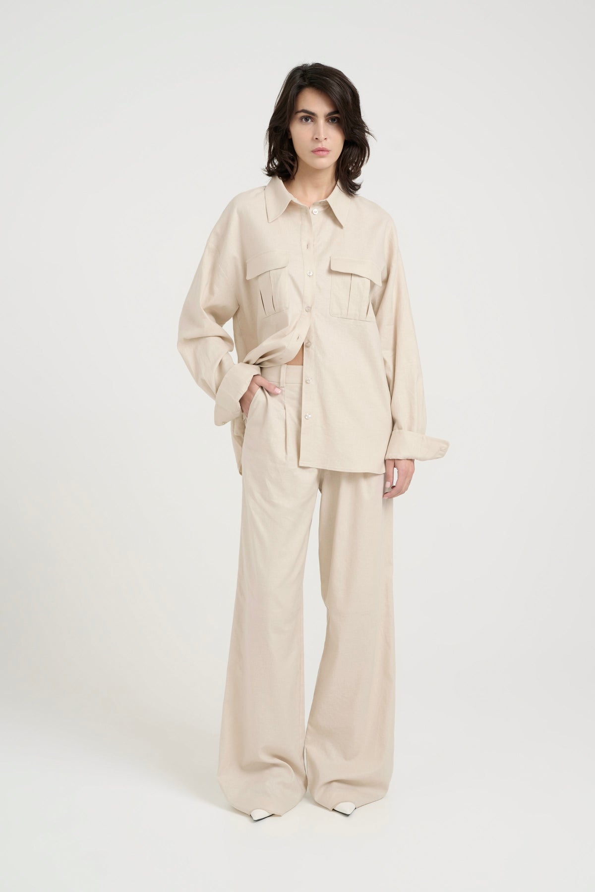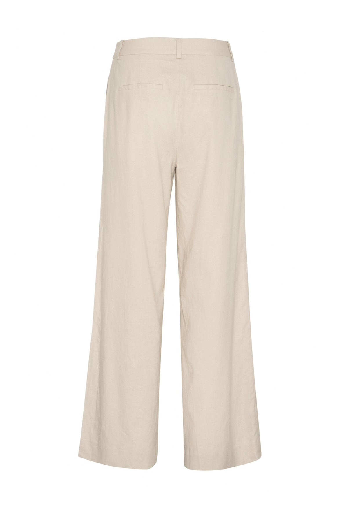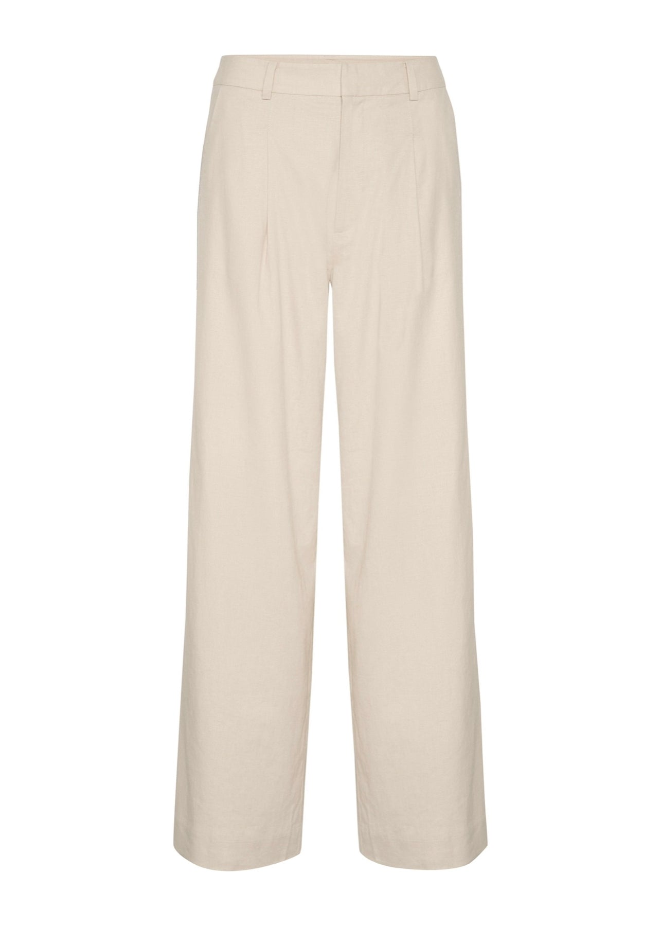 Lyse bukser fra Gestuz i lækker hør/viscosemix. Bukserne er højtaljede, læg foran, sidelommer og paspolerede lommer bagpå.