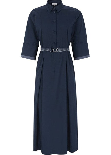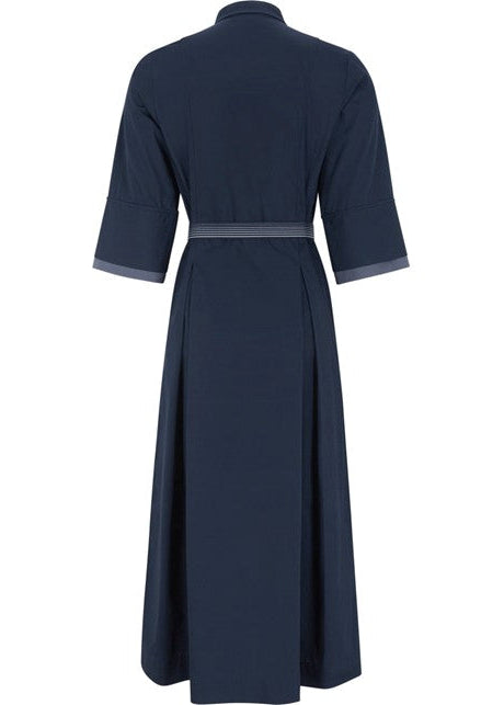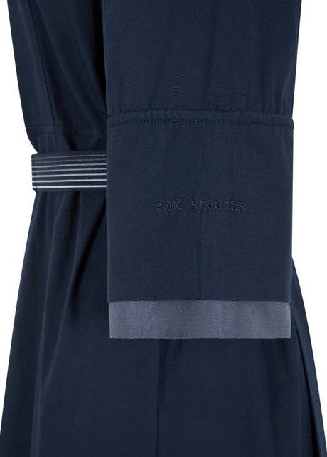 Smuk navy bomuldskjole fra Esmé Studios. Kjolen har krave, knaplukning, korte, lidt brede, ærmer med lyseblå detalje. Der medfølger elastikbælte med sølvspænde til taljen.