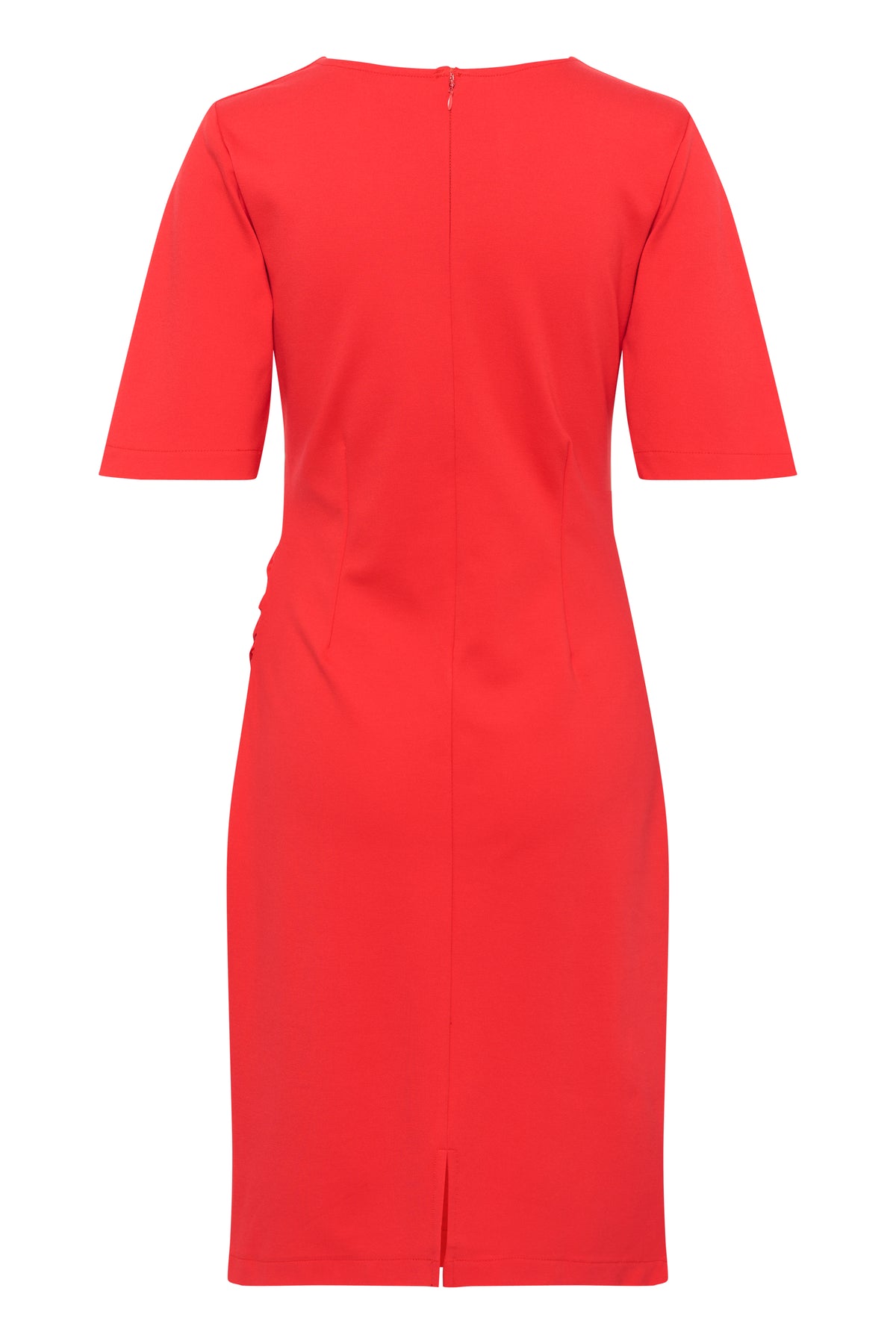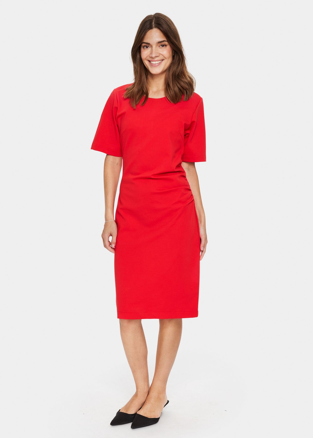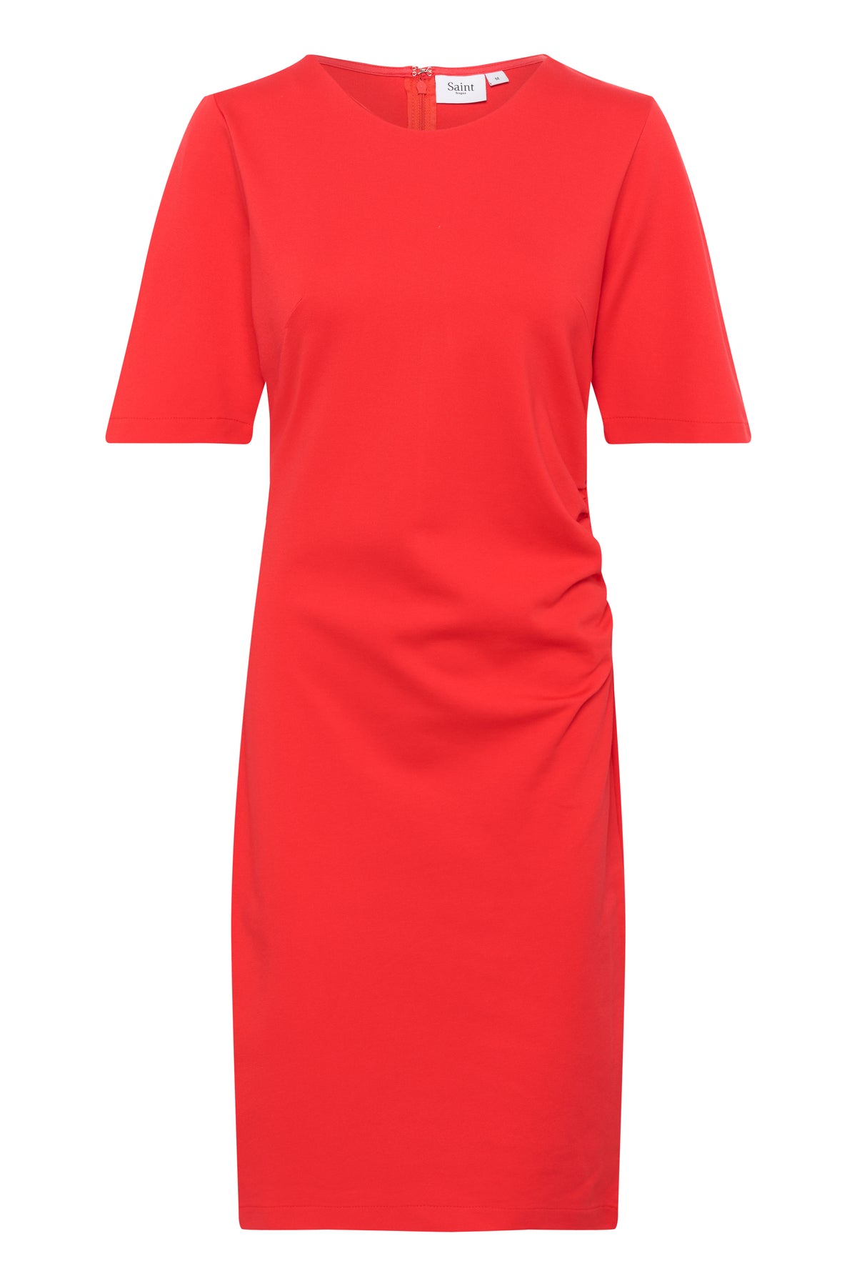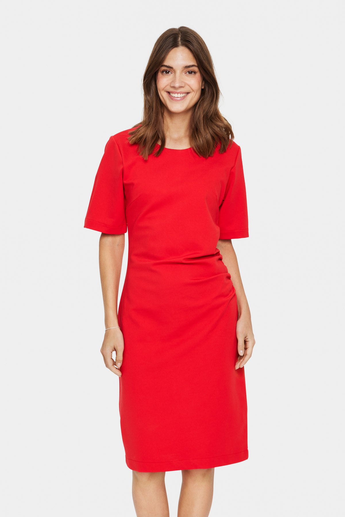 Rød kjole fra Saint Tropez med rund hals, korte ærmer, drapering foran og en længde til lige under knæet.