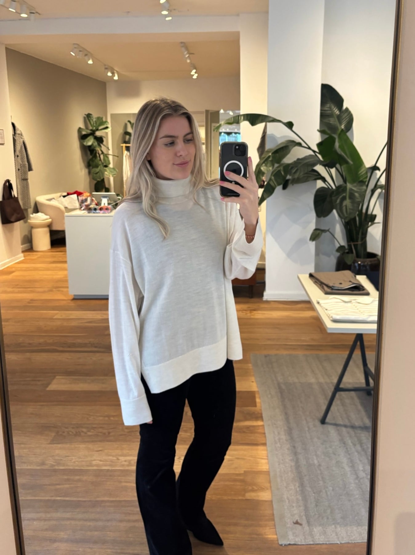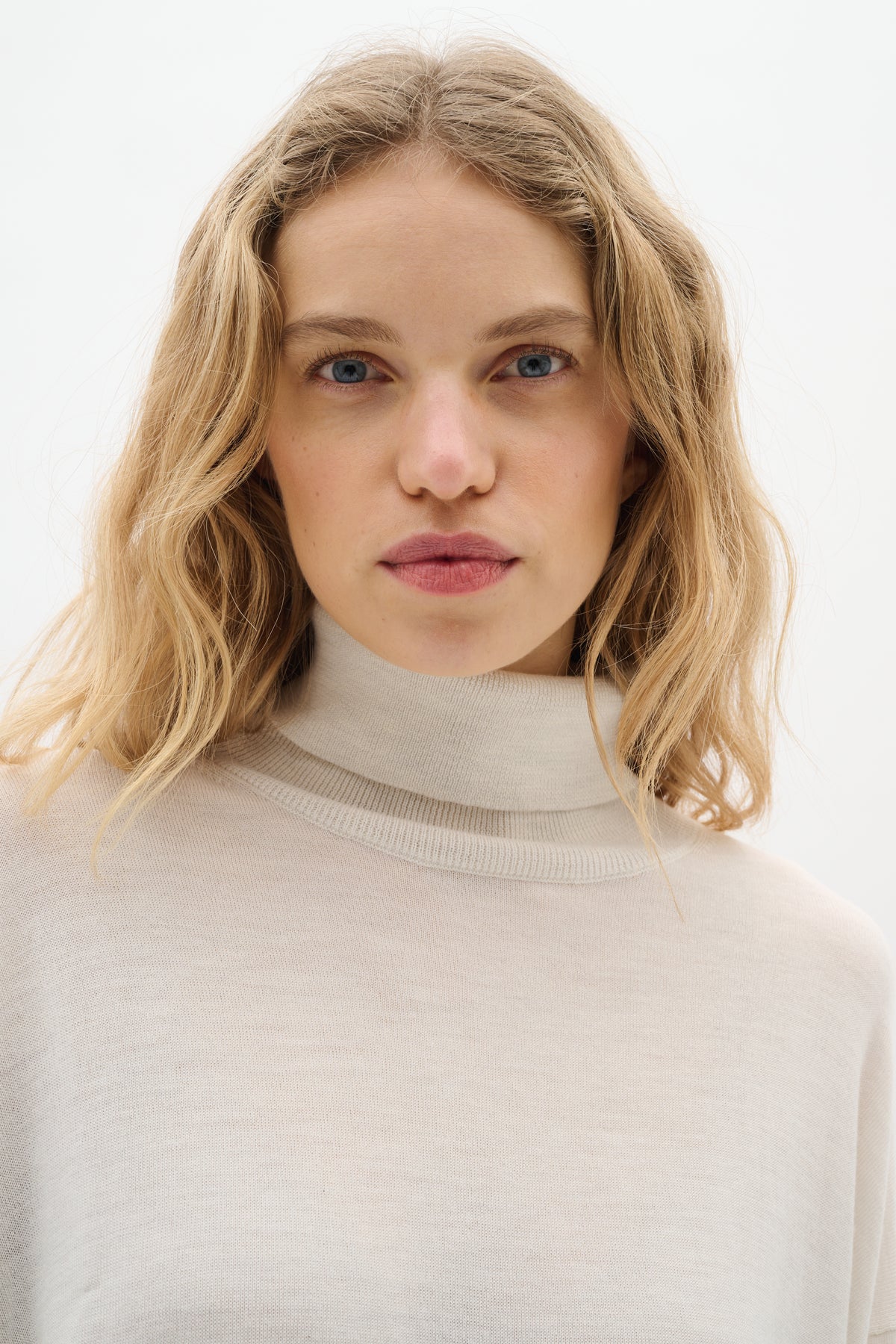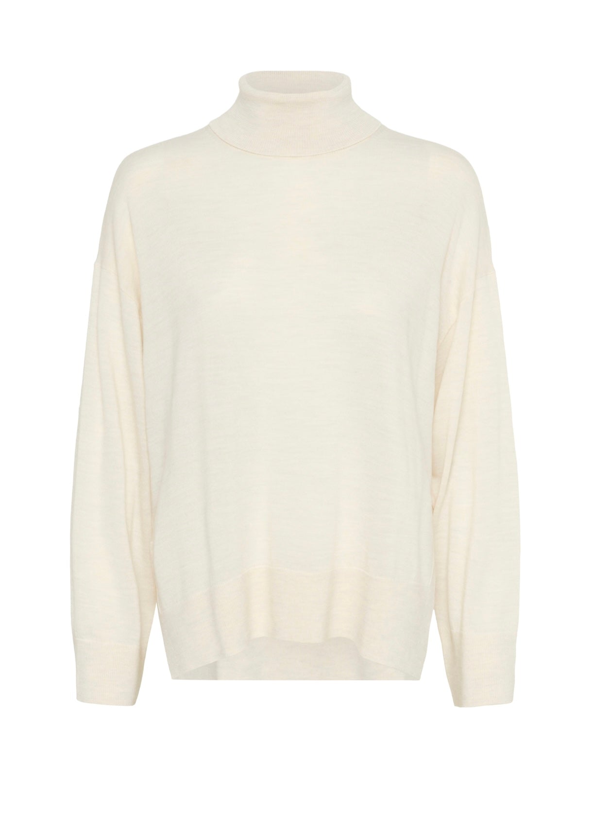 Lækker off-white pullover i ren uld. Pulloveren har rullekrave, en løs pasform og slidser i siderne.