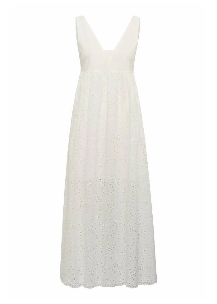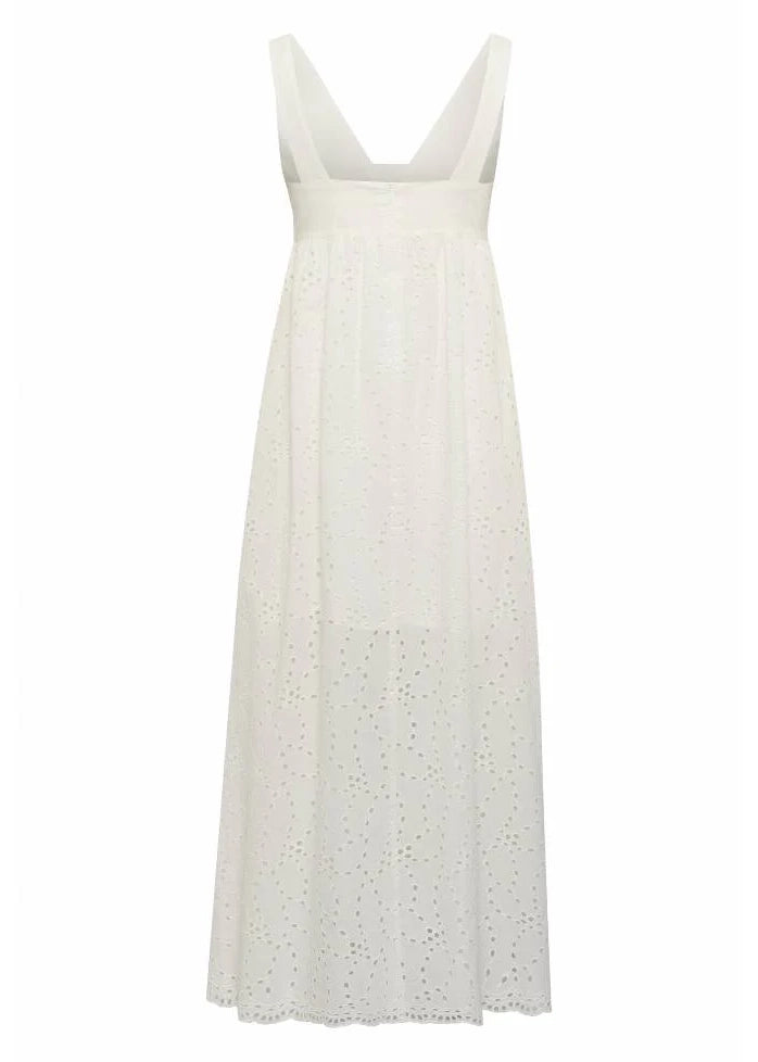 Fin kjole med broderie anglaise fra InWear. Kjolen er tætsiddende i overdelen og har et A-formet skørt. Den har V-hals, lukkes med en lynlås i ryggen og har en påsyet underkjole.