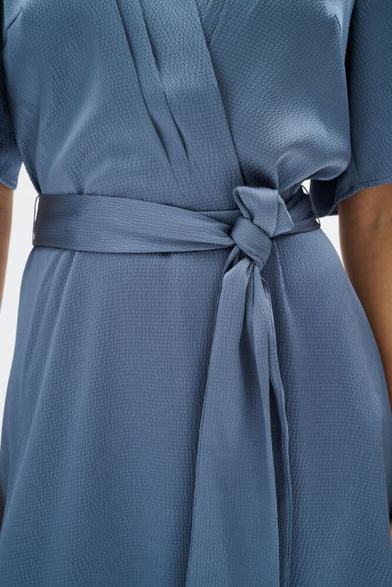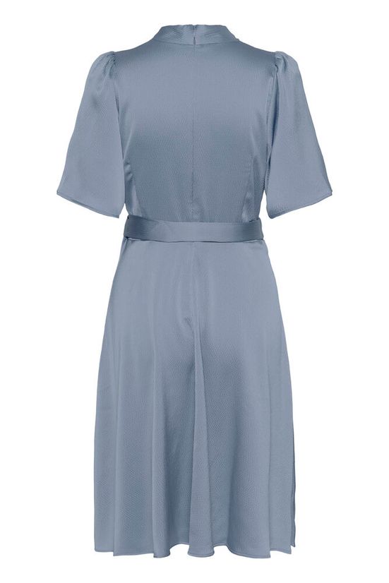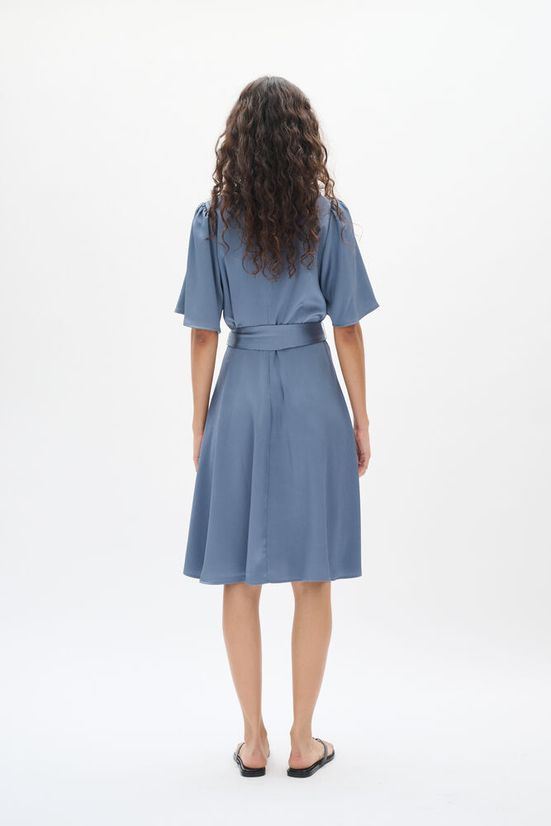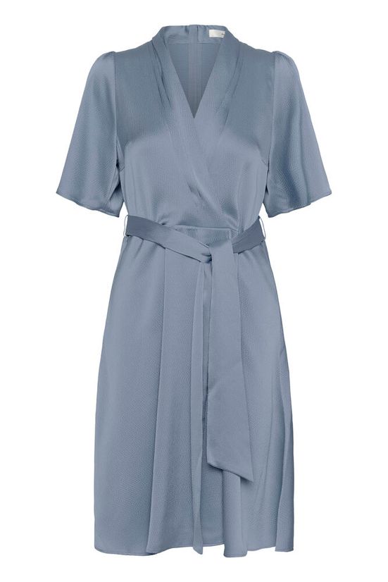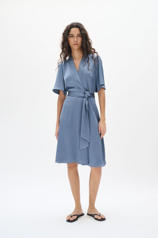 Smukkeste kjole fra InWear i flot gråblå farve. Kjolen v-udskæring med smuk drapering foran, korte løse ærmer og bindebånd i taljen. Lukkes med lynlås bagpå.