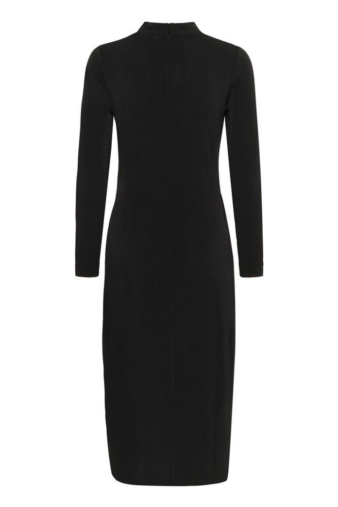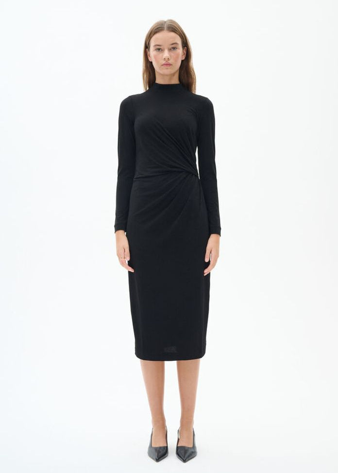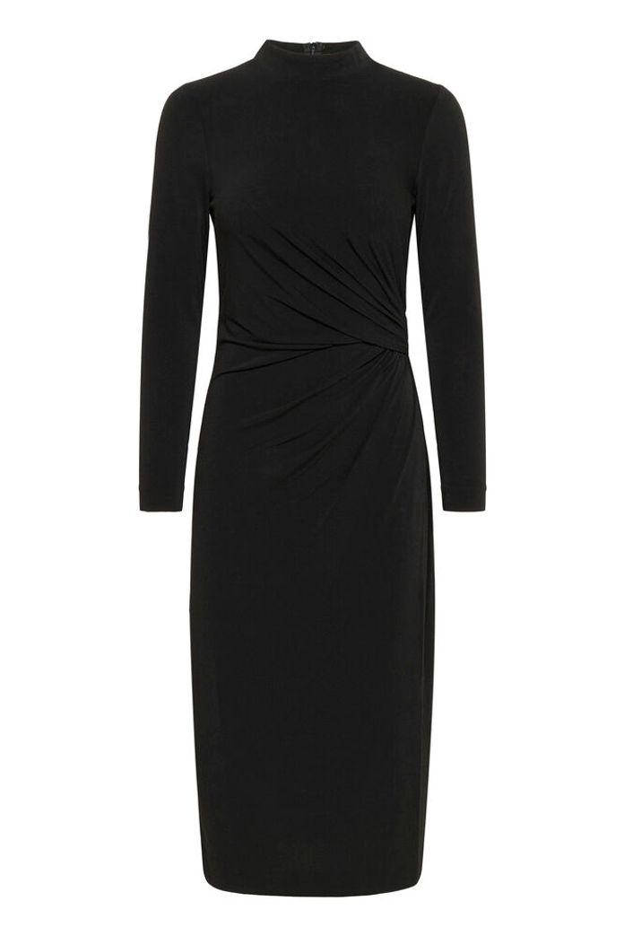 Klassisk sort kjole fra InWear med tætsiddende pasform og høj hals. Kjolen har lange ærmer og elegante draperede detaljer i siden. Den lukkes med en diskret lynlås bagpå.