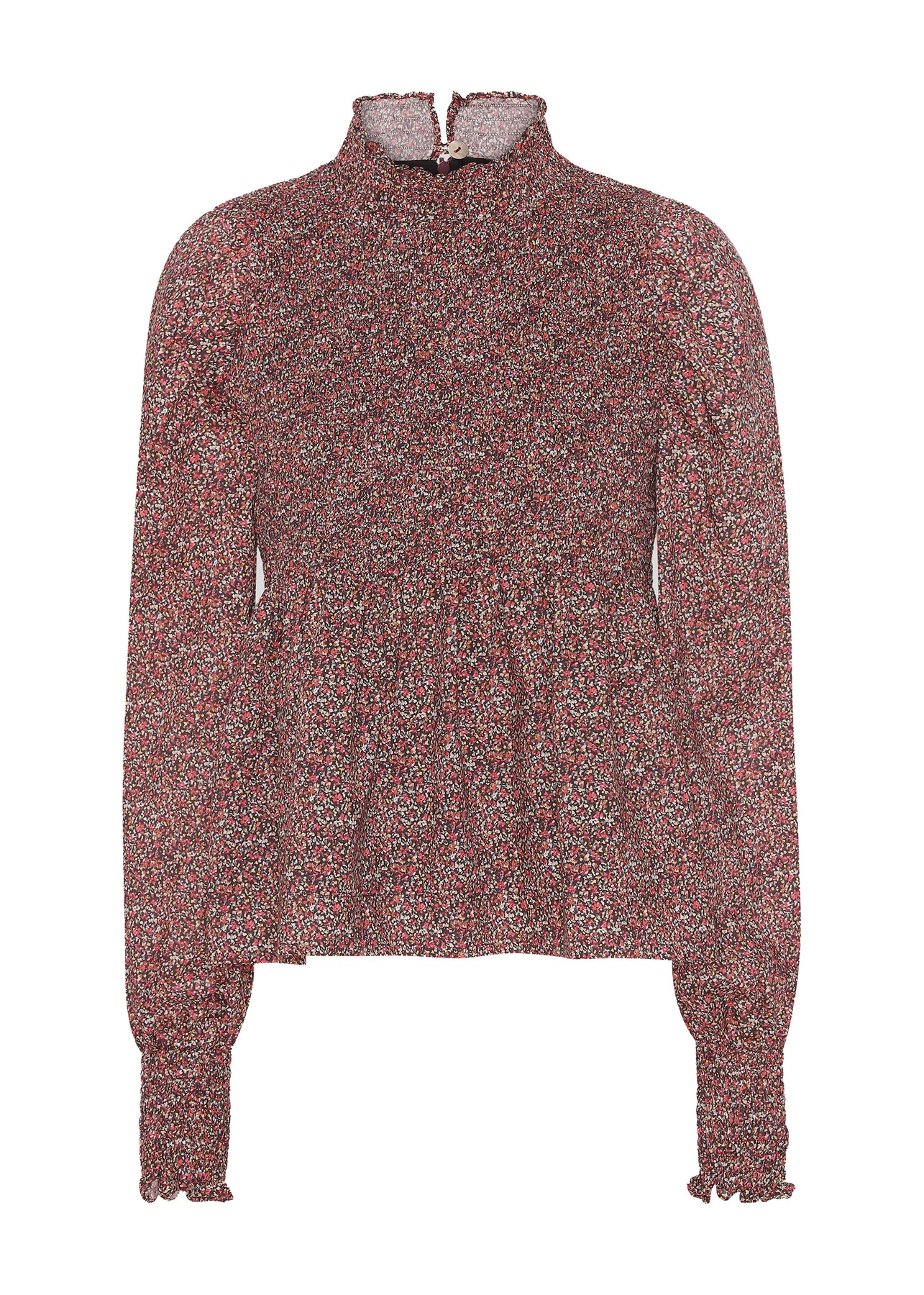 Smuk bluse fra Herskind i Liberty stof. Blusen har en høj hals, let puffede ærmer med flæser nederst og en feminin slihouette.