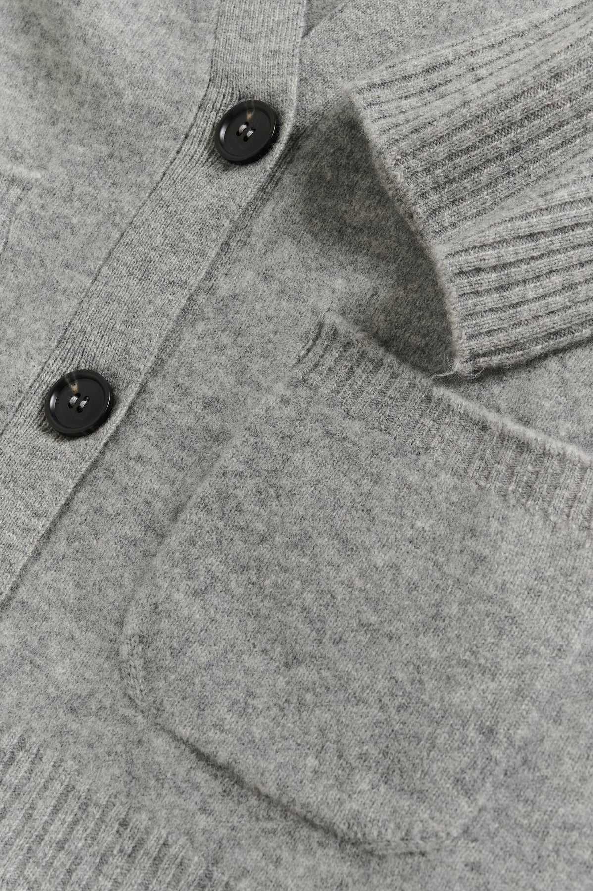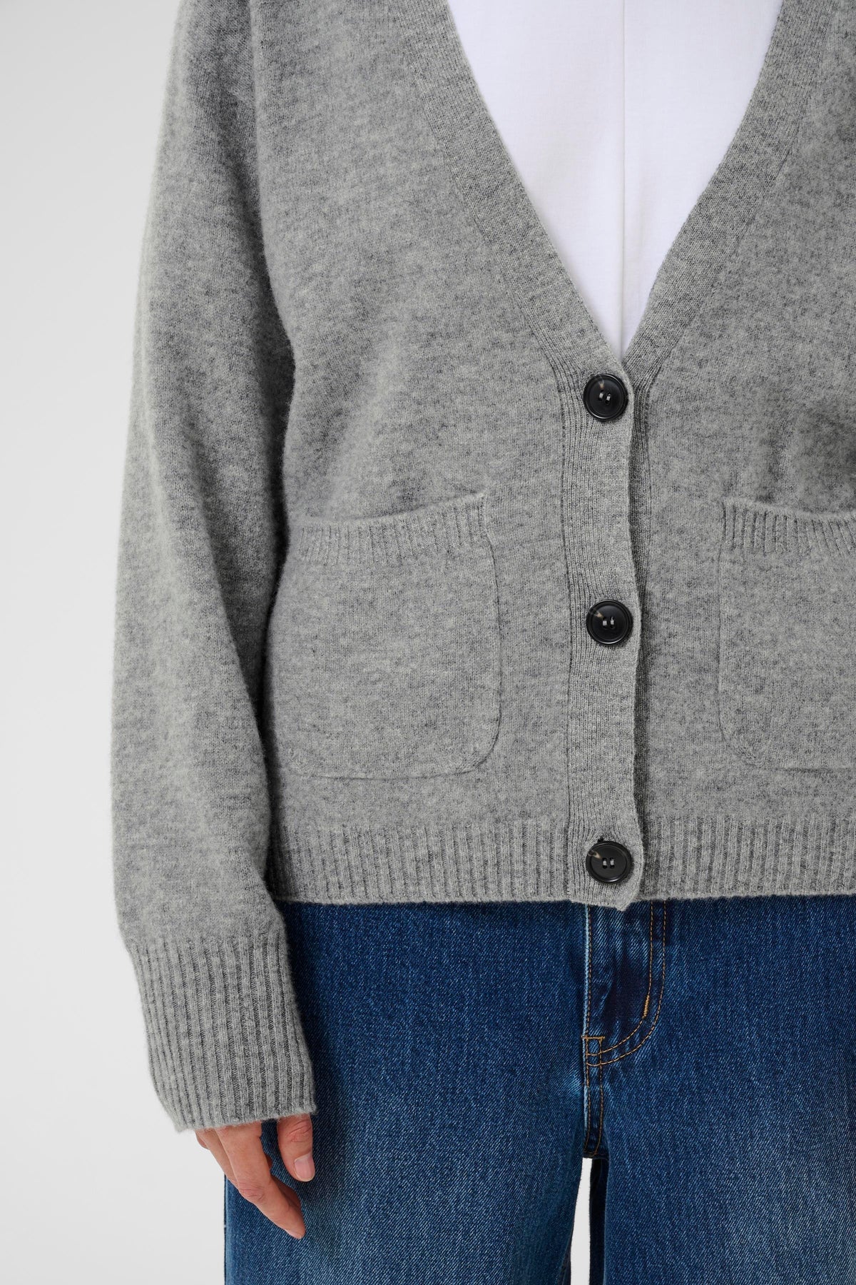 Klassisk grå cardigan i 100% blød og let uld. Cardiganen har v-udskæring, lukkes med tre knapper og har en lidt smal pasform.