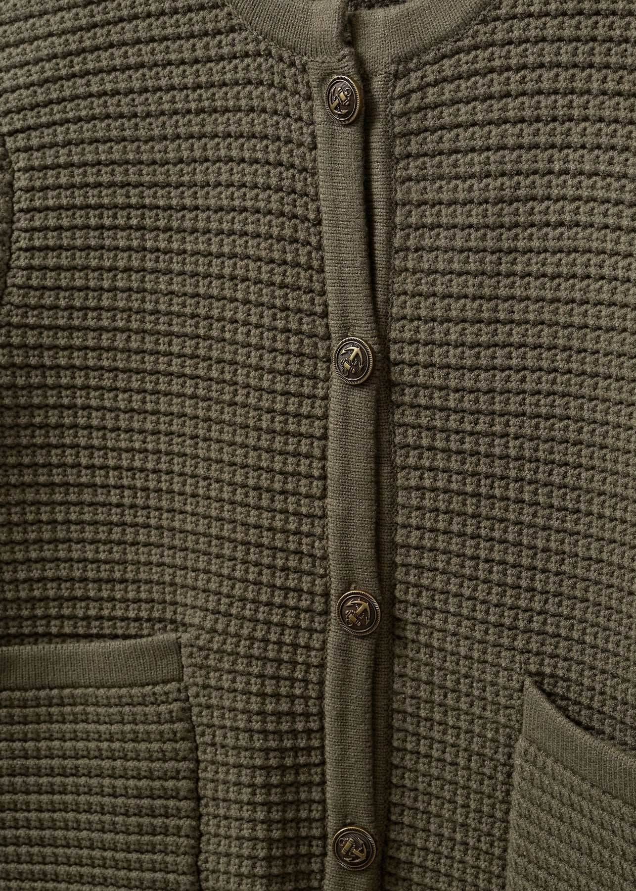 Elegant armygrøn cardigan i kraftig kvalitet og med struktur. Cardiganen har en løs pasform med lange ærmer og rund hals. Den kan lukkes med fine knapper og har forlommer.