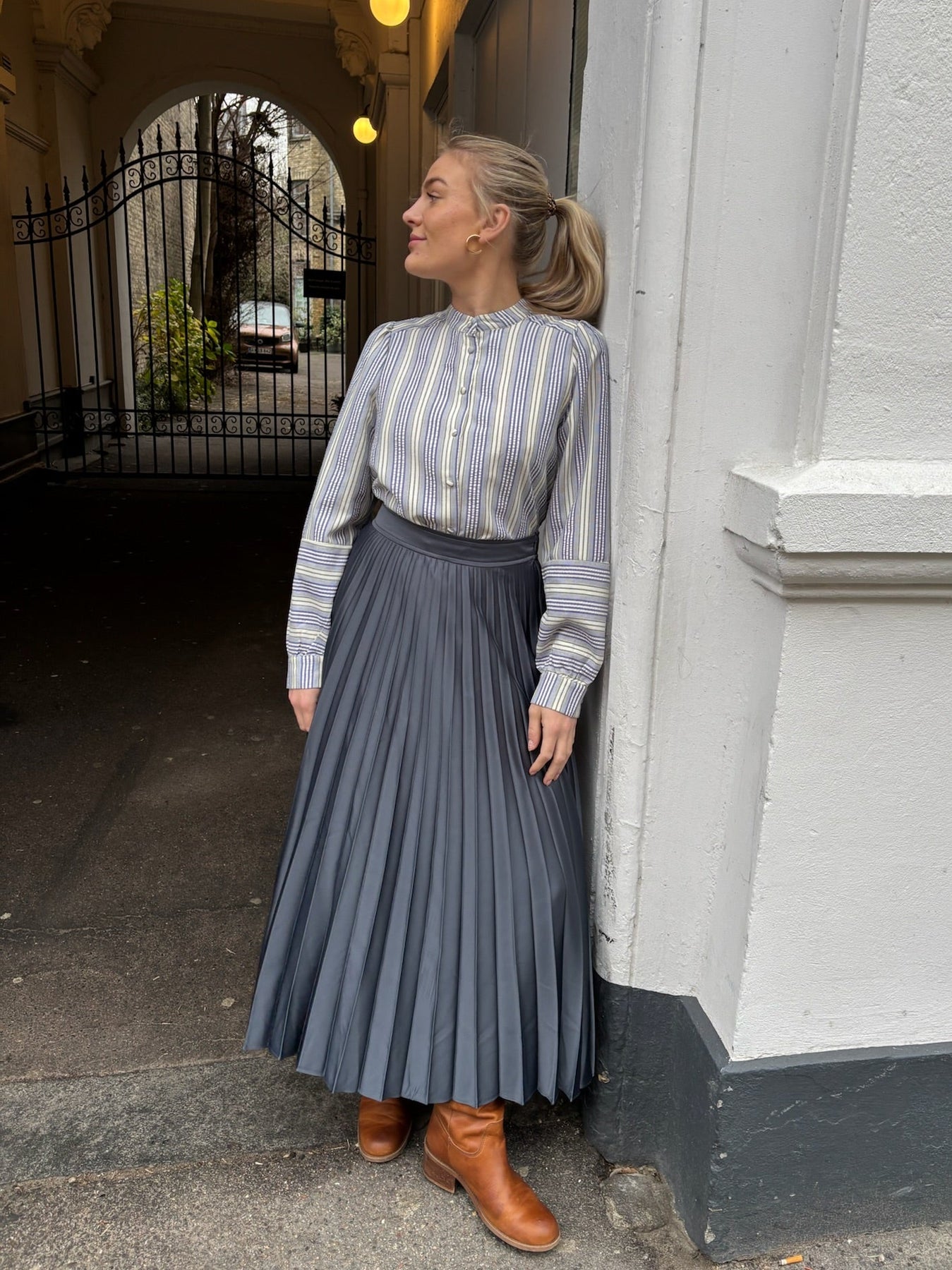 Fin skjorte fra Lollys Laundry. Skjorten har både vertikale og diagonale striber. Desuden lukkes skjorten med hvide knapper foran og har kinakrave.