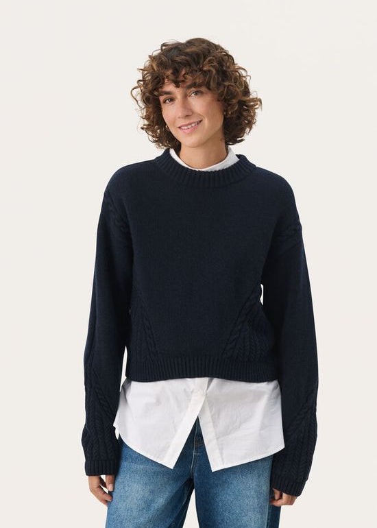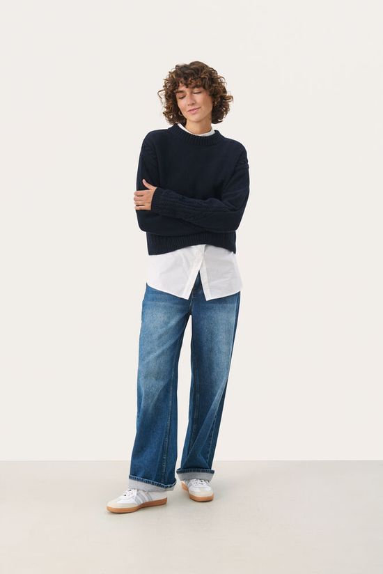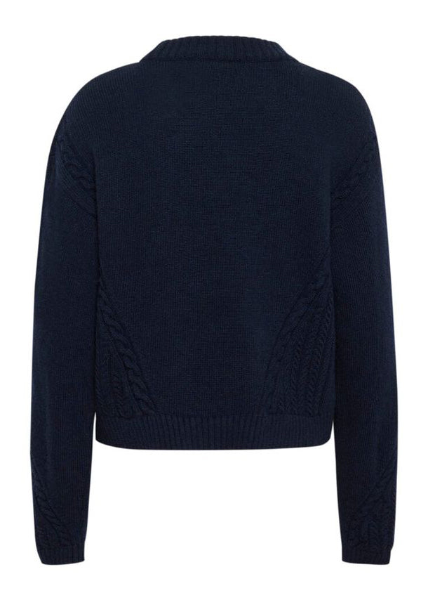 Lækker navy pullover i 100% lammeuld. Strikken har rund hals, en løs lidt kort pasform og smukke kabelmønstrede detaljer på ærmer og langs siden.