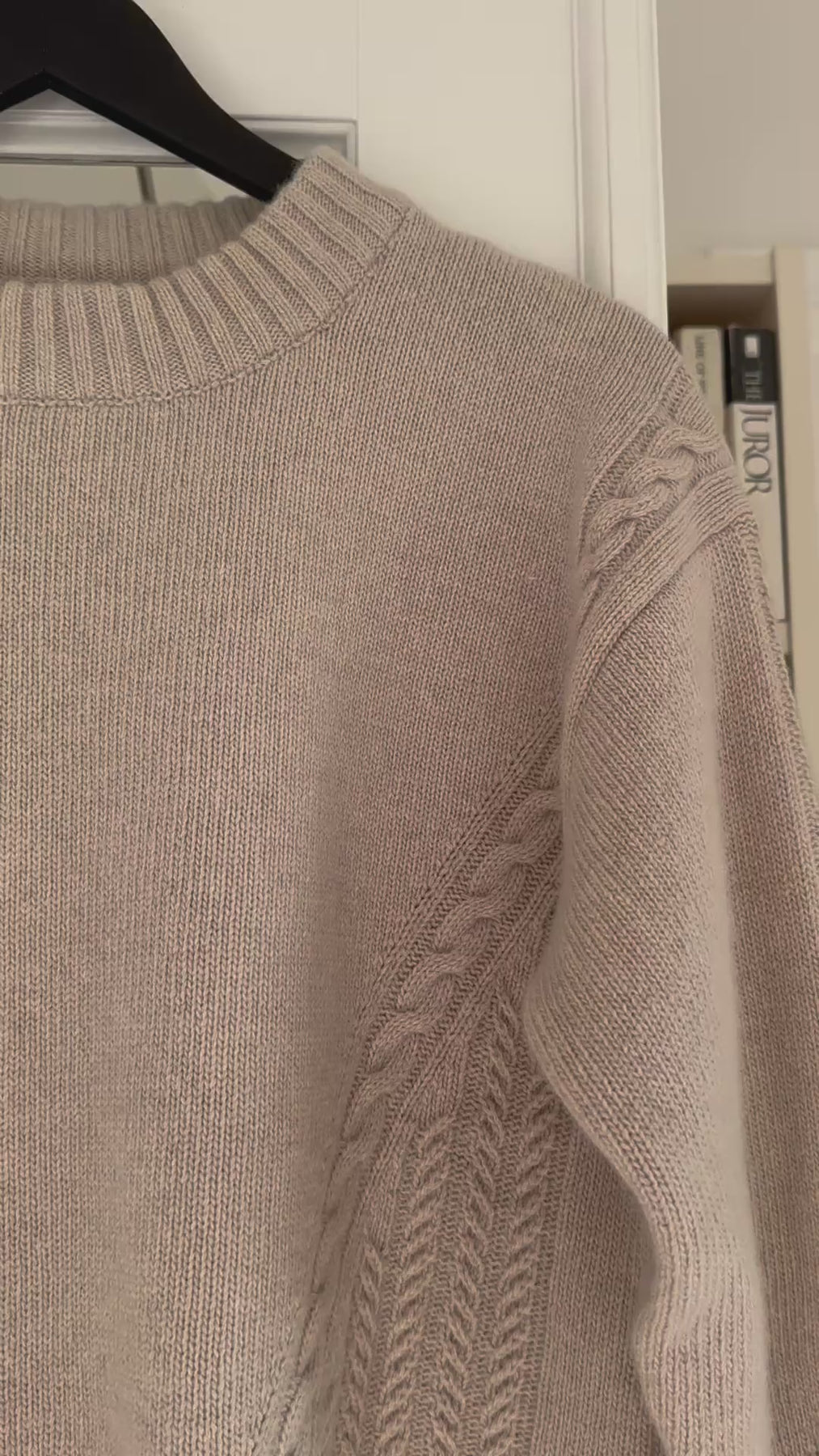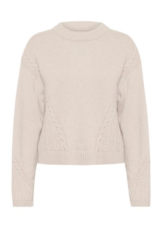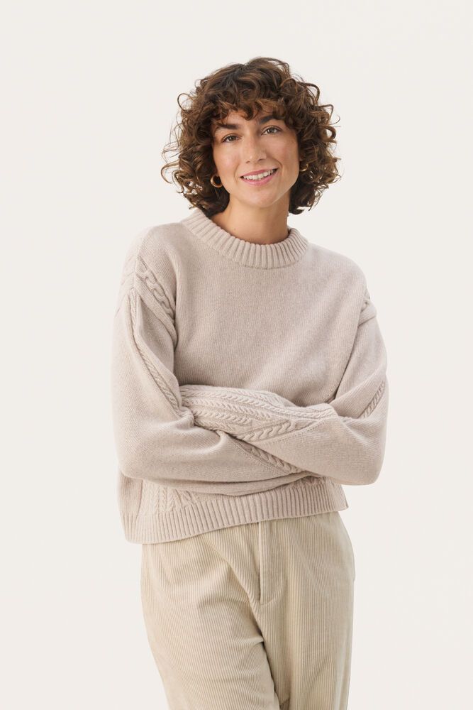 Lækker lys pullover i 100% lammeuld. Strikken har rund hals, en løs pasform og smukke kabelmønstrede detaljer på ærmer og langs siden.