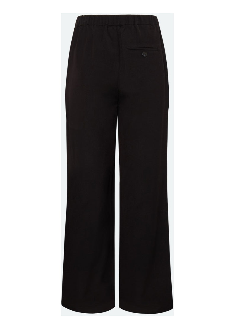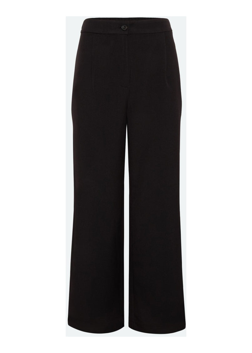 Flotte bukser med brede ben fra Moves. Bukserne er højtaljede og har sidelommer. De lukkes med hægte, samt lynlås og har bæltestropper i taljen.