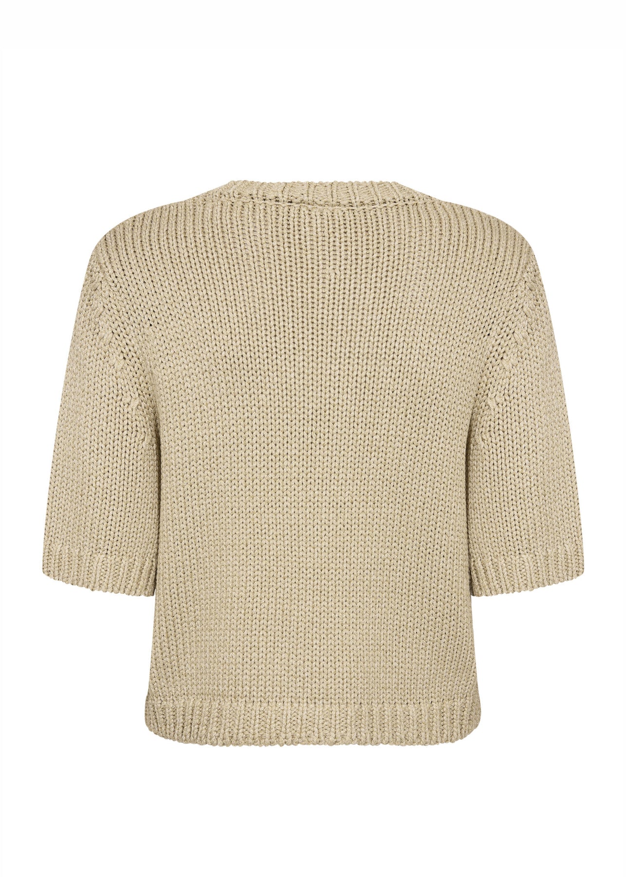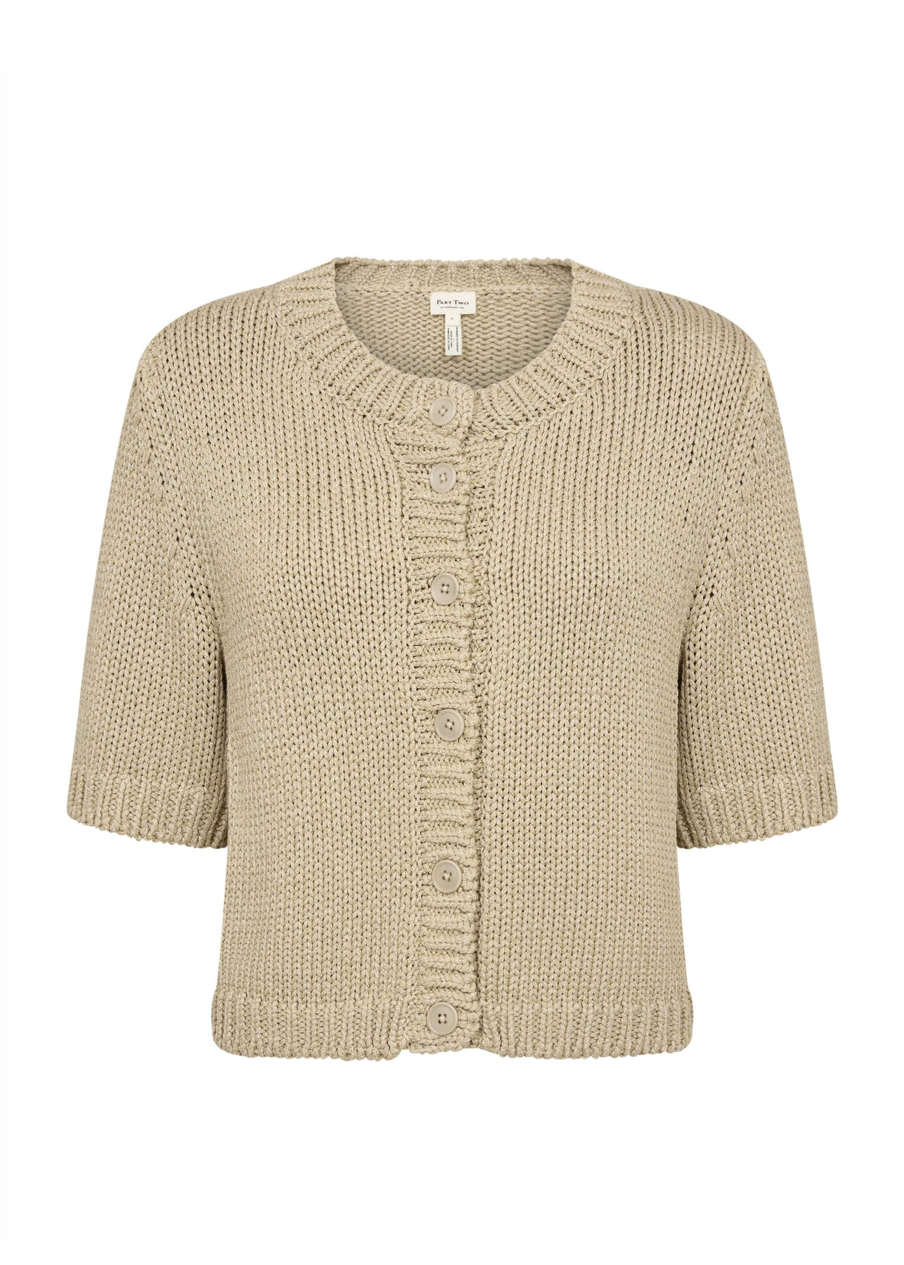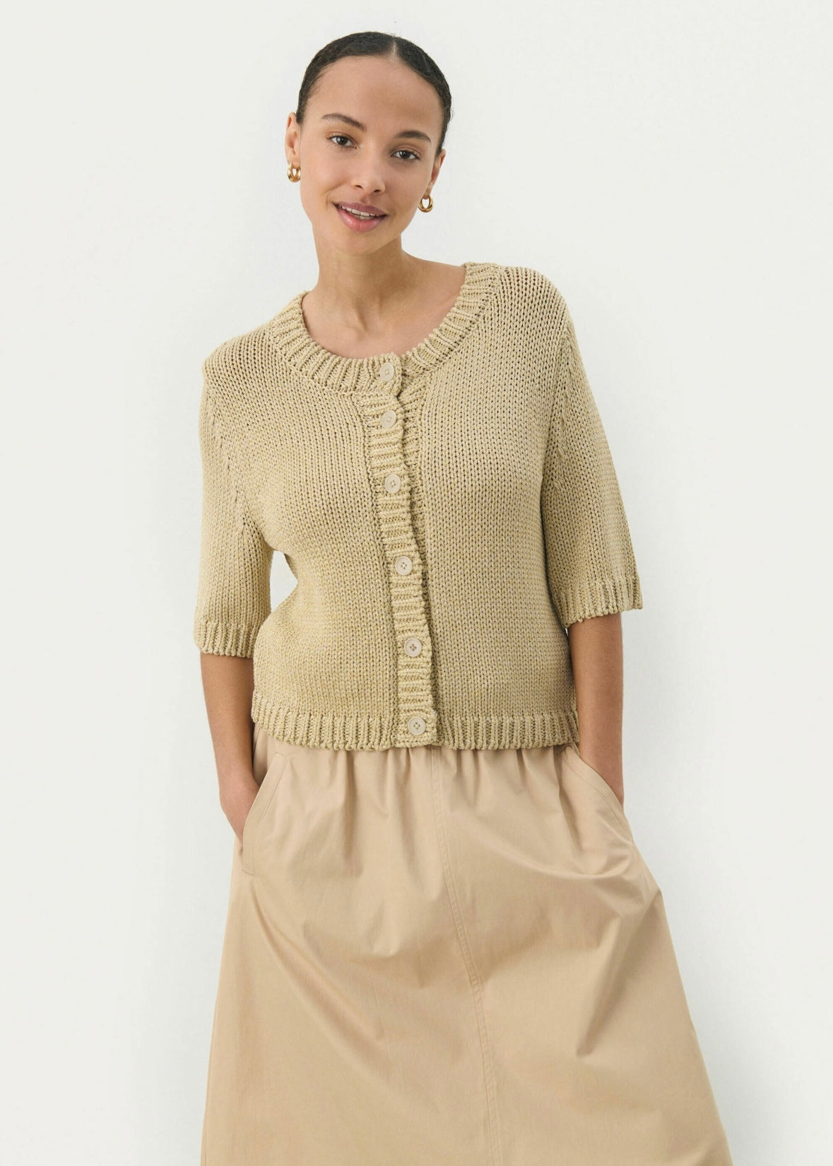 Fin guldfarvede strik cardigan fra Part Two med en smule metallisk garn vævet i. Cardiganen har korte ærmer og lukkes med knapper foran.